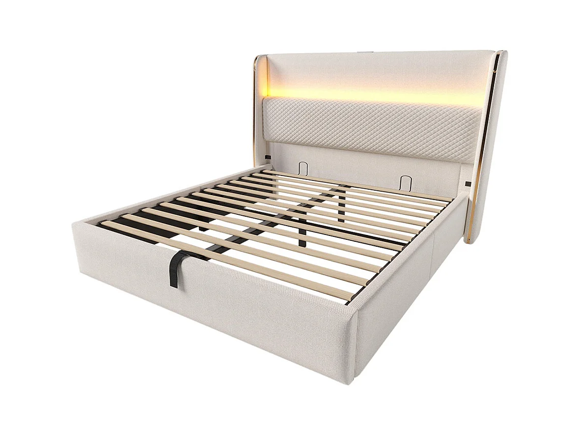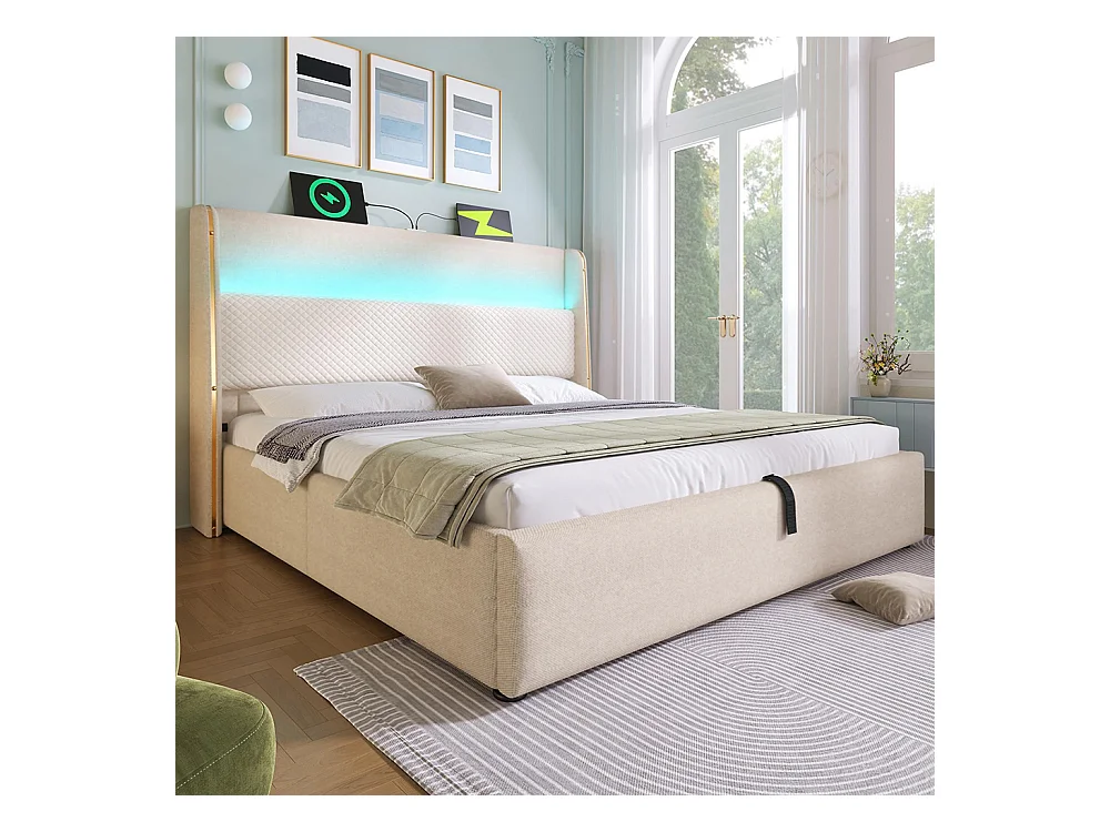 Lit coffre moderne tête lit haute double 140x200 cm éclairage LED espace rangement ports USB Type-C aspect lin beige avec matelas