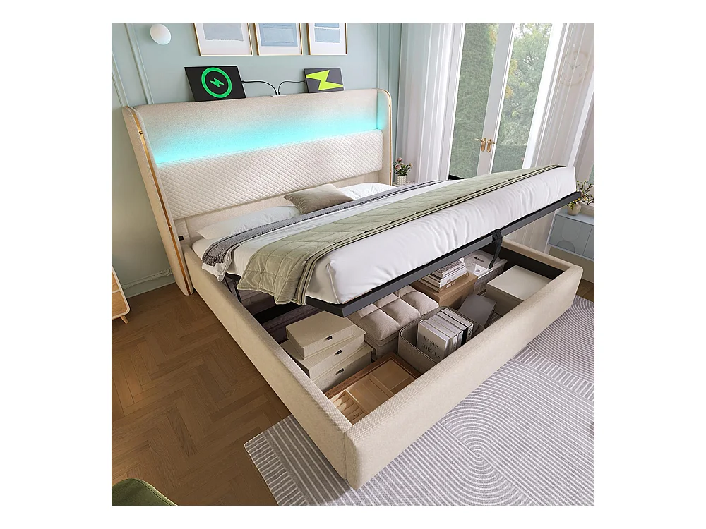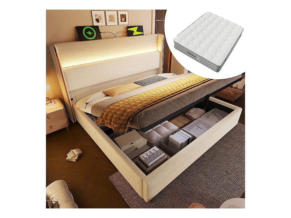 Lit coffre moderne tête lit haute double 160x200 cm éclairage LED espace rangement ports USB Type-C aspect lin beige avec matelas
