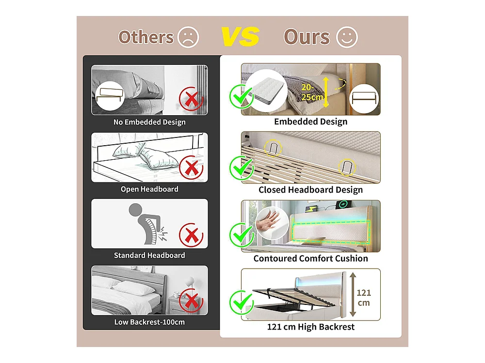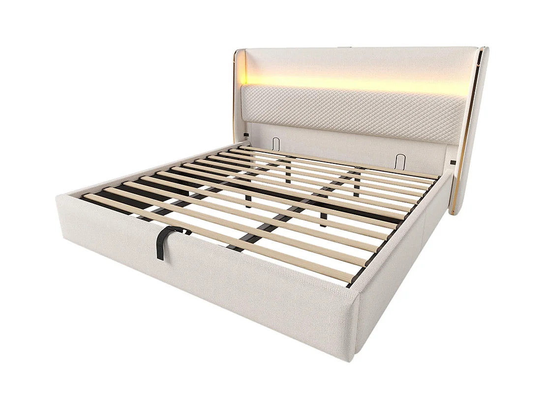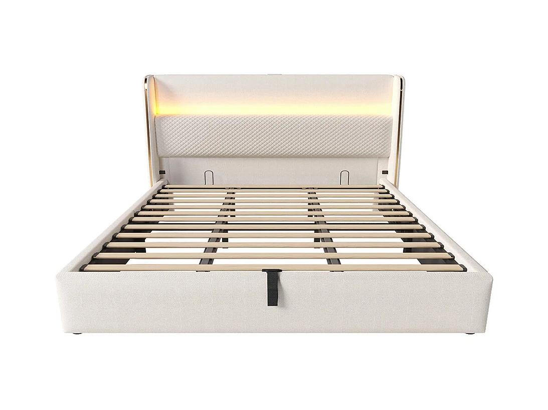 Lit coffre moderne tête lit haute double 180x200 cm éclairage LED espace rangement ports USB Type-C aspect lin beige sans matelas