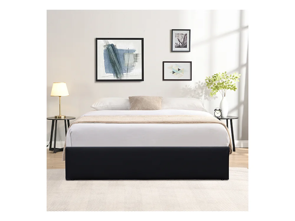 Lit Coffre Noir 160x200 cm Déhoussable avec 14 Lattes - Montage Facile et Entretien Simplifié en PVC Simili
