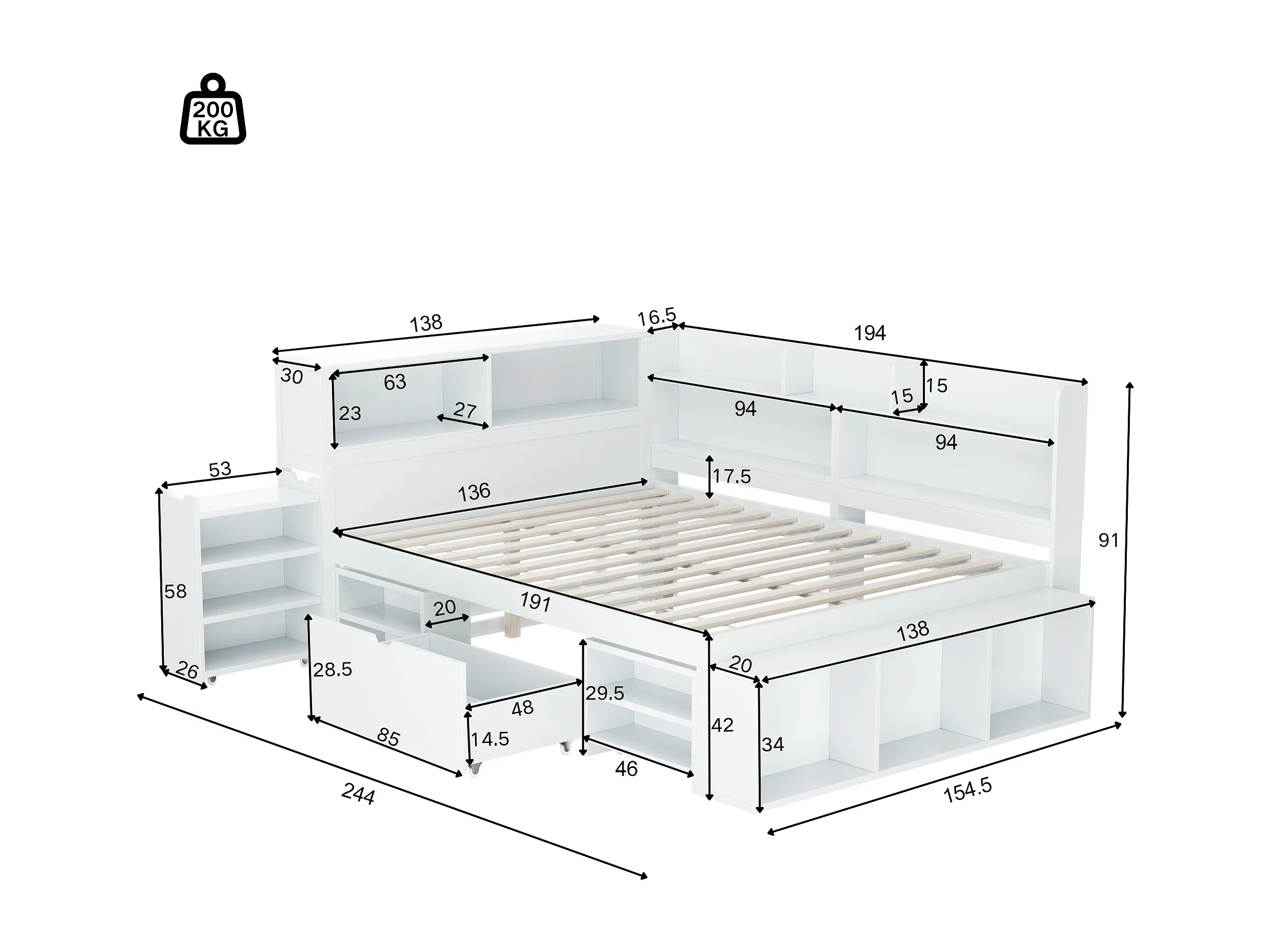 Lit coffre pour enfant - 135 x 190 cm - avec tiroirs + étagères de rangement + sommier à lattes - bois - blanc