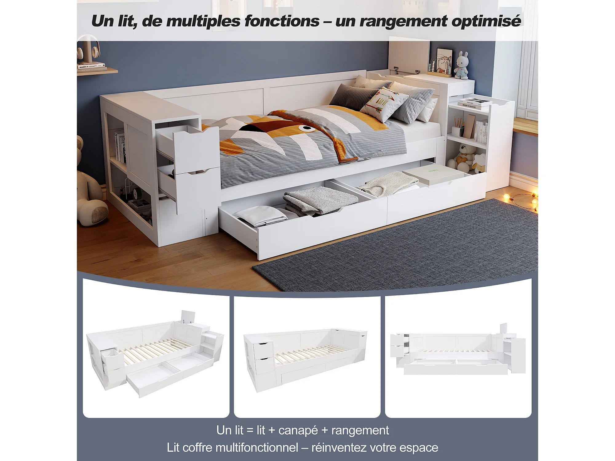 Lit coffre pour enfant - 90 x 190 cm - canapé-lit avec 3 tiroirs - avec tables de chevet - MDF - blanc