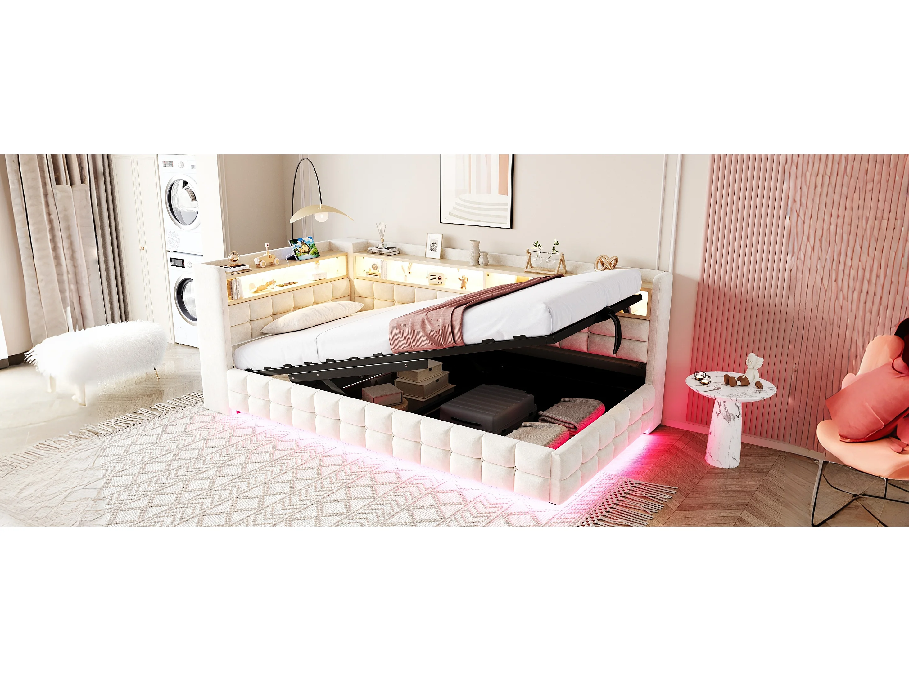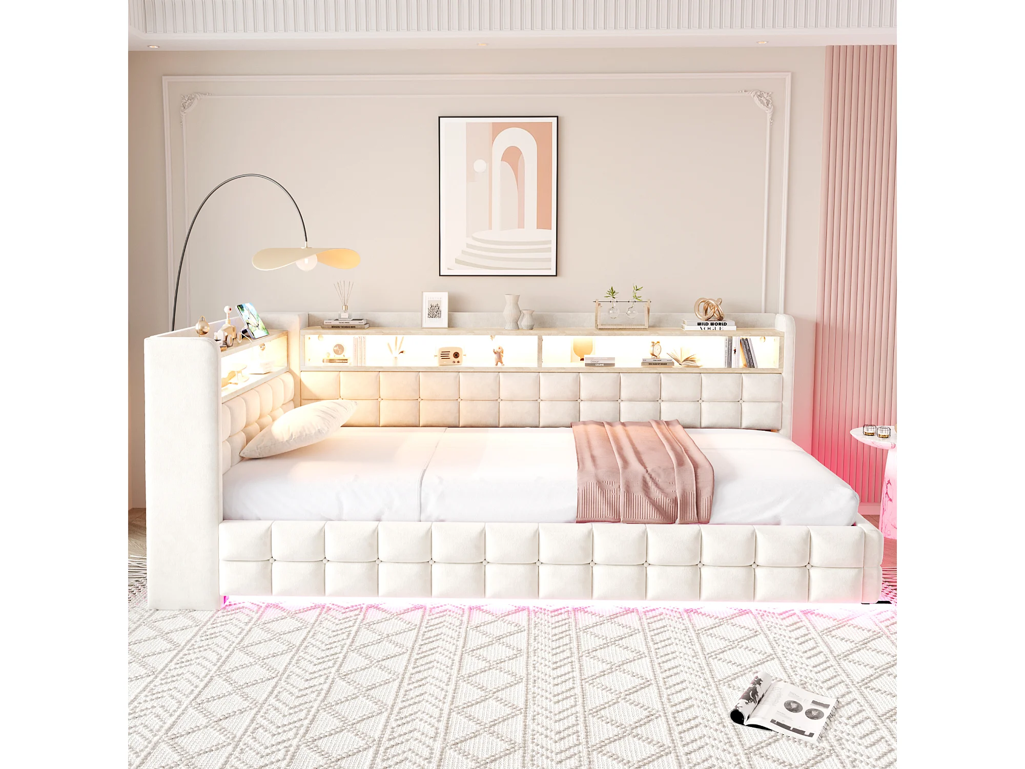 Lit coffre pour enfant - 90 x 200 cm - canapé-lit rembourré avec rangement hydraulique + étagère + Leds - velours - beige