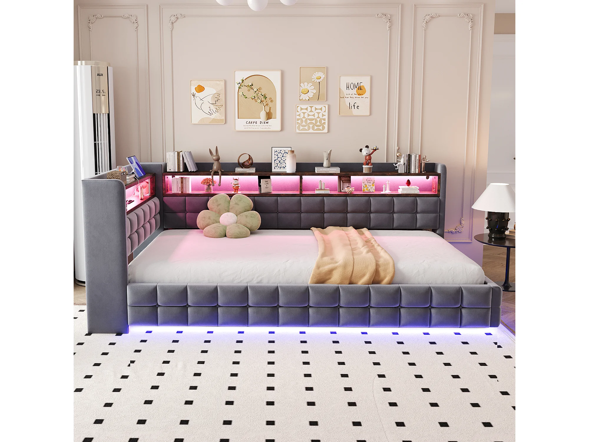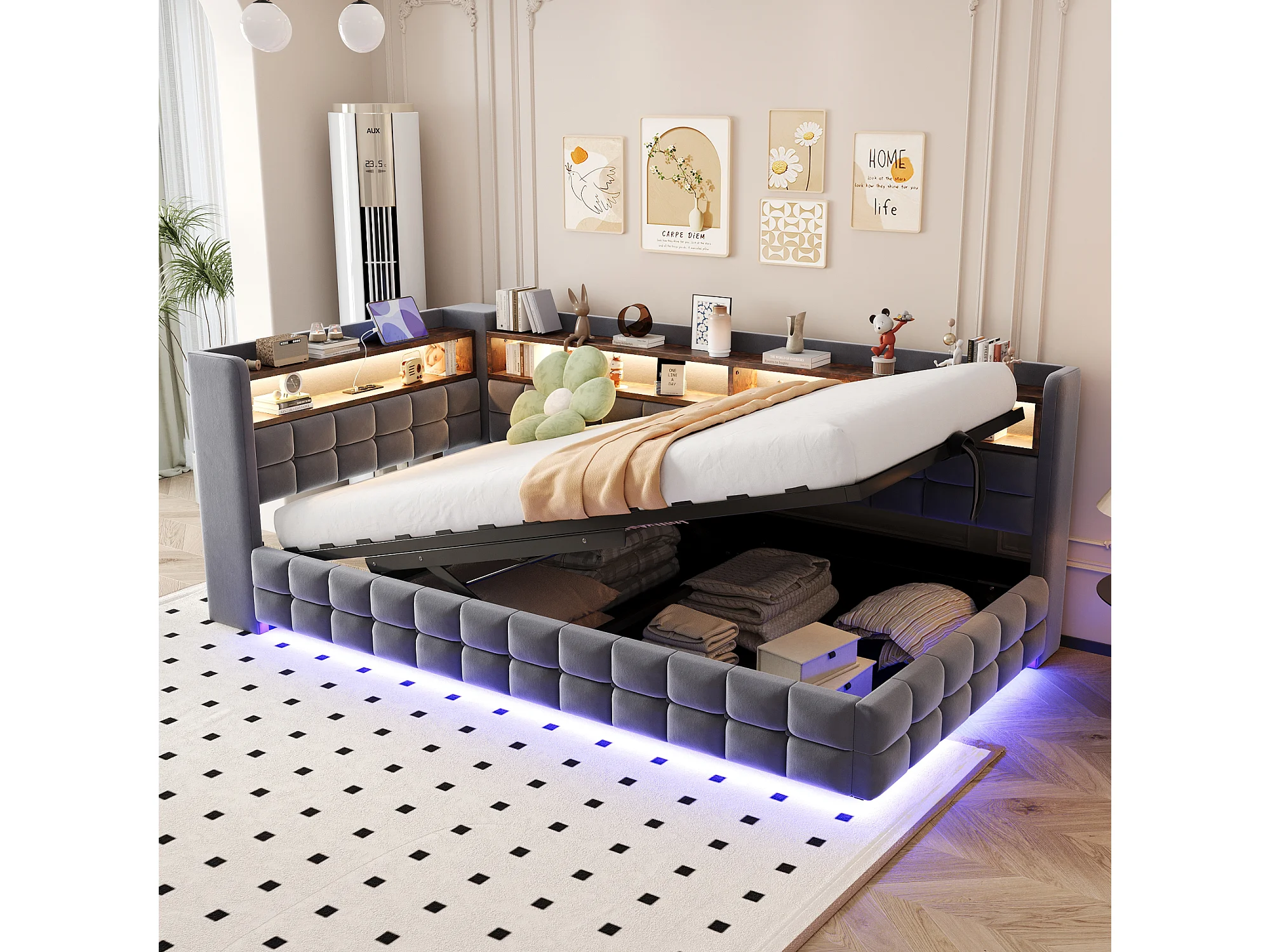 Lit coffre pour enfant - 90 x 200 cm - canapé-lit rembourré avec rangement hydraulique + étagère + Leds - velours - gris