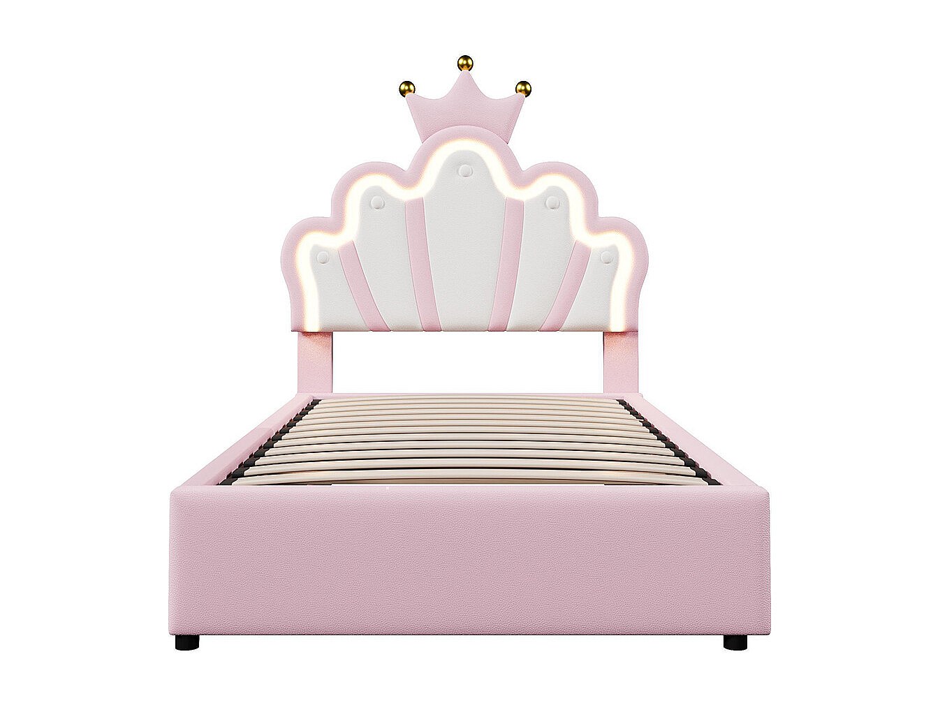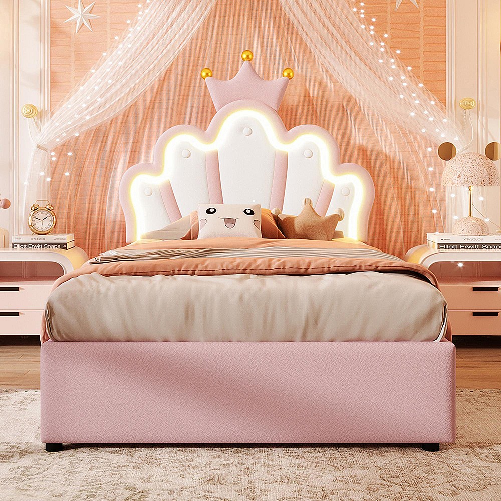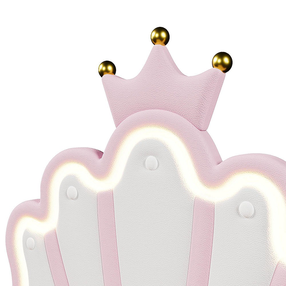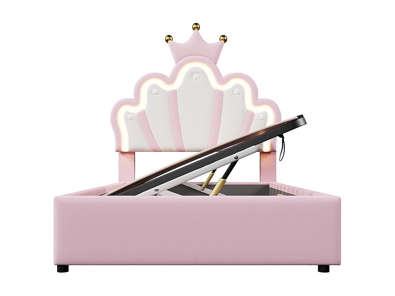 Lit coffre princesse rembourré 90x200 cm sans matelas LED hydraulique tête réglable couronne PU rose