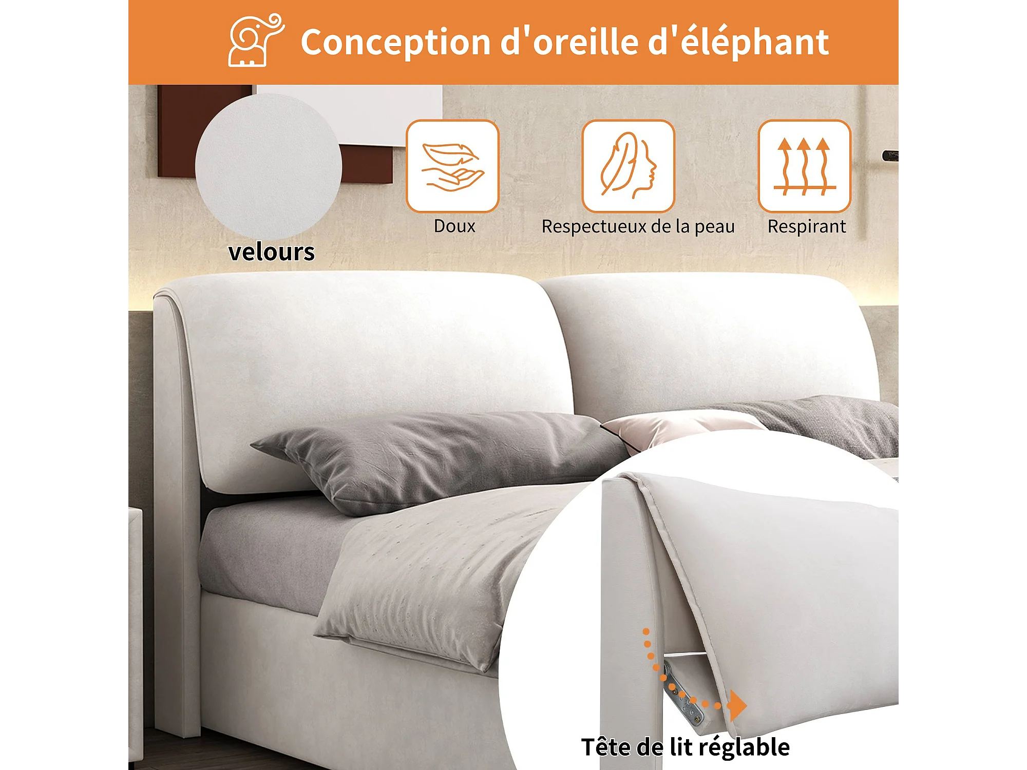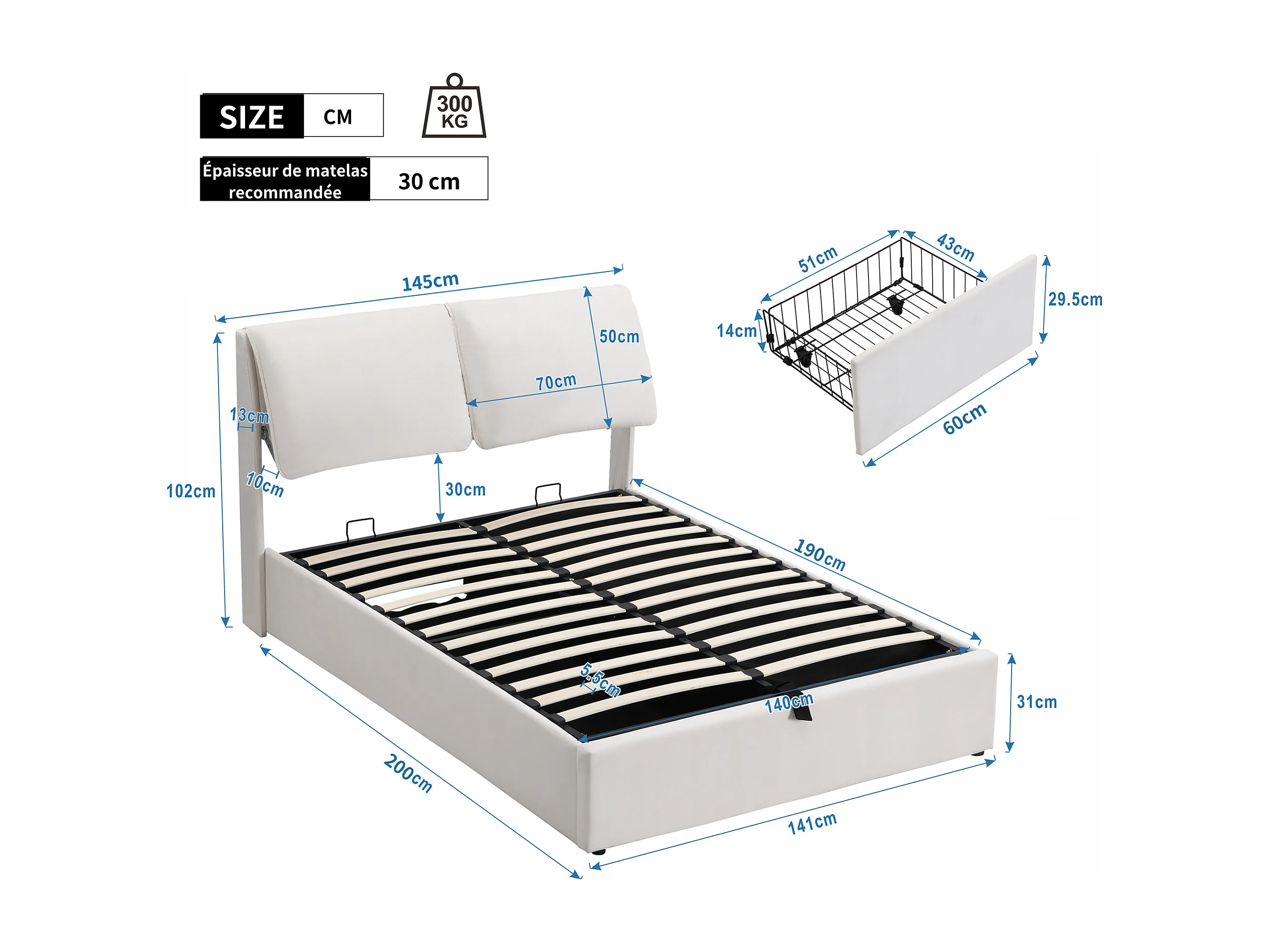 Lit coffre rembourré - 140 x 190 cm - sommier hydraulique - avec 3 tiroirs + tête de lit - velours - beige