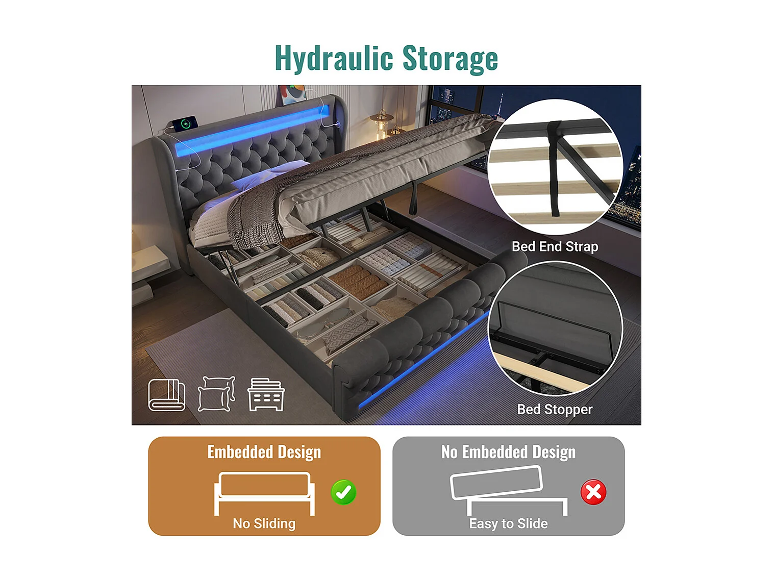 Lit coffre rembourré 140x200 cm avec éclairage LED tête de lit avec ports USB et Type-C gris velours avec matelas