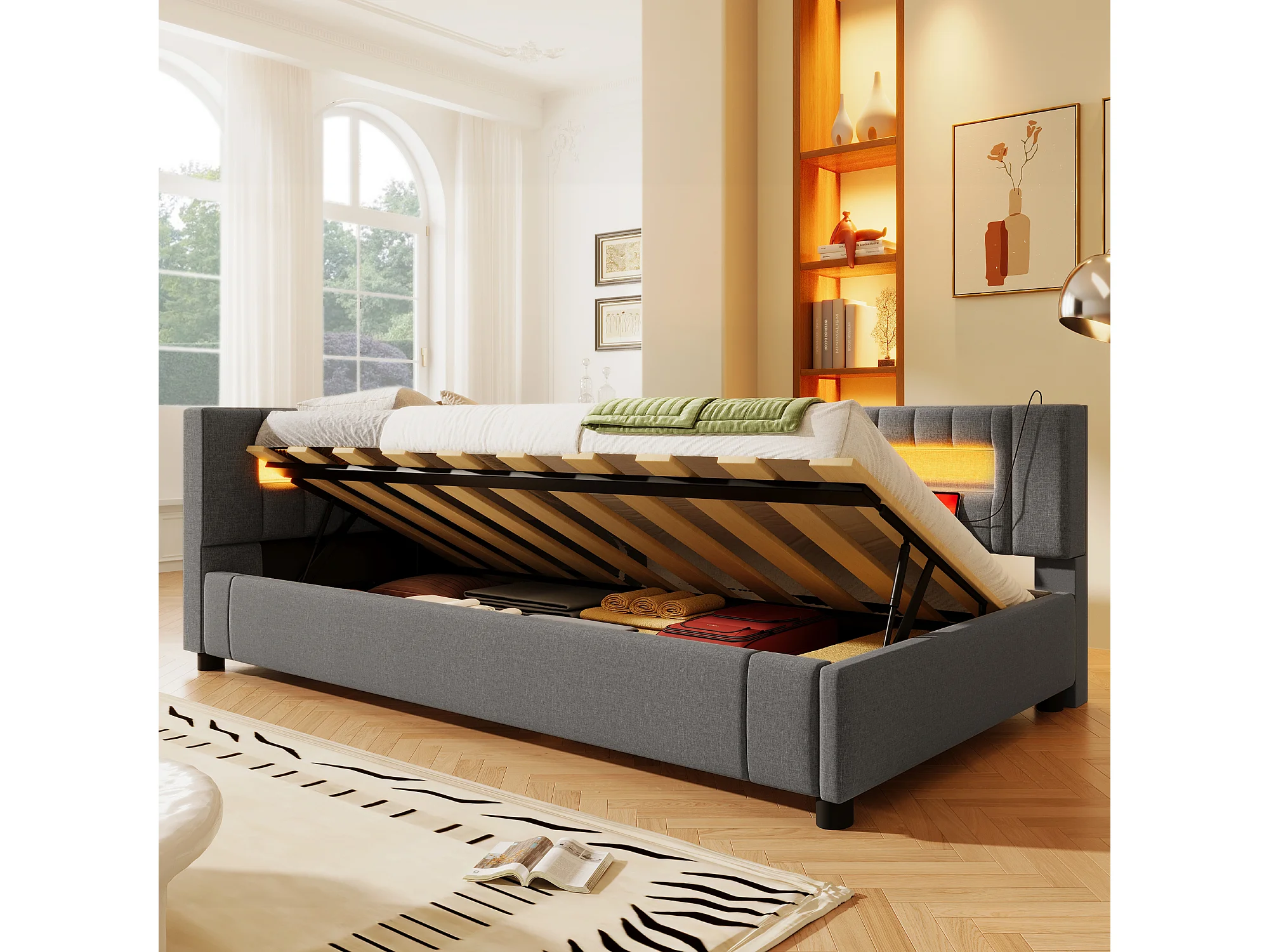 Lit coffre rembourré - 90 x 200 cm - avec Leds + USB + Type-C + hydraulique rangement - lin + MDF - gris