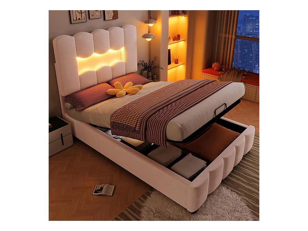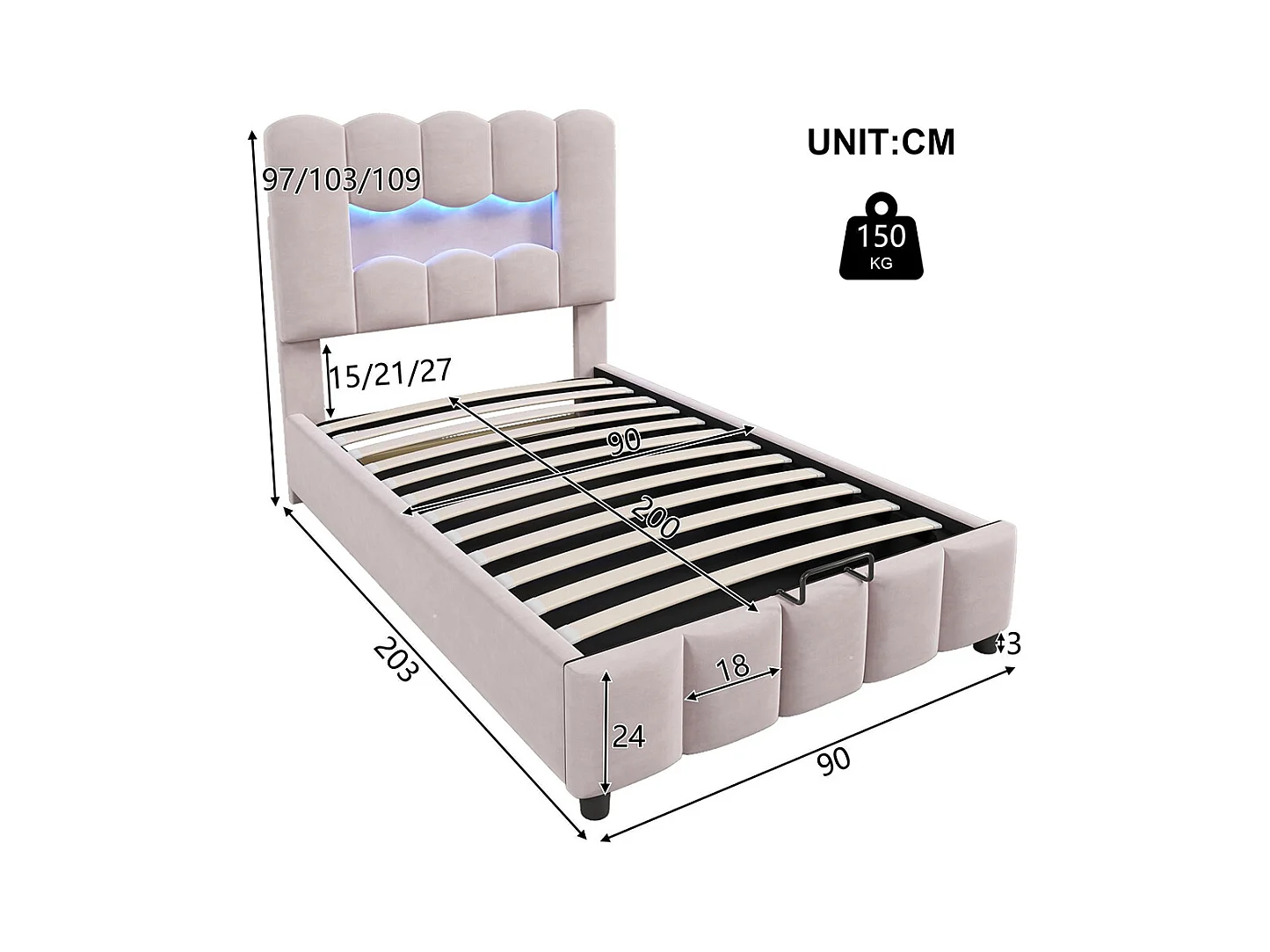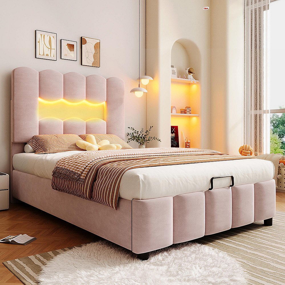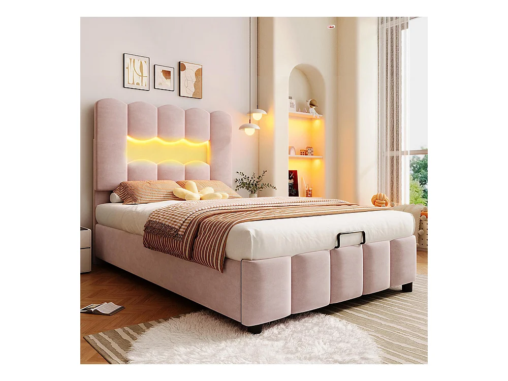 Lit coffre rembourré 90x200 cm sans matelas LED hydraulique tête réglable velours rose