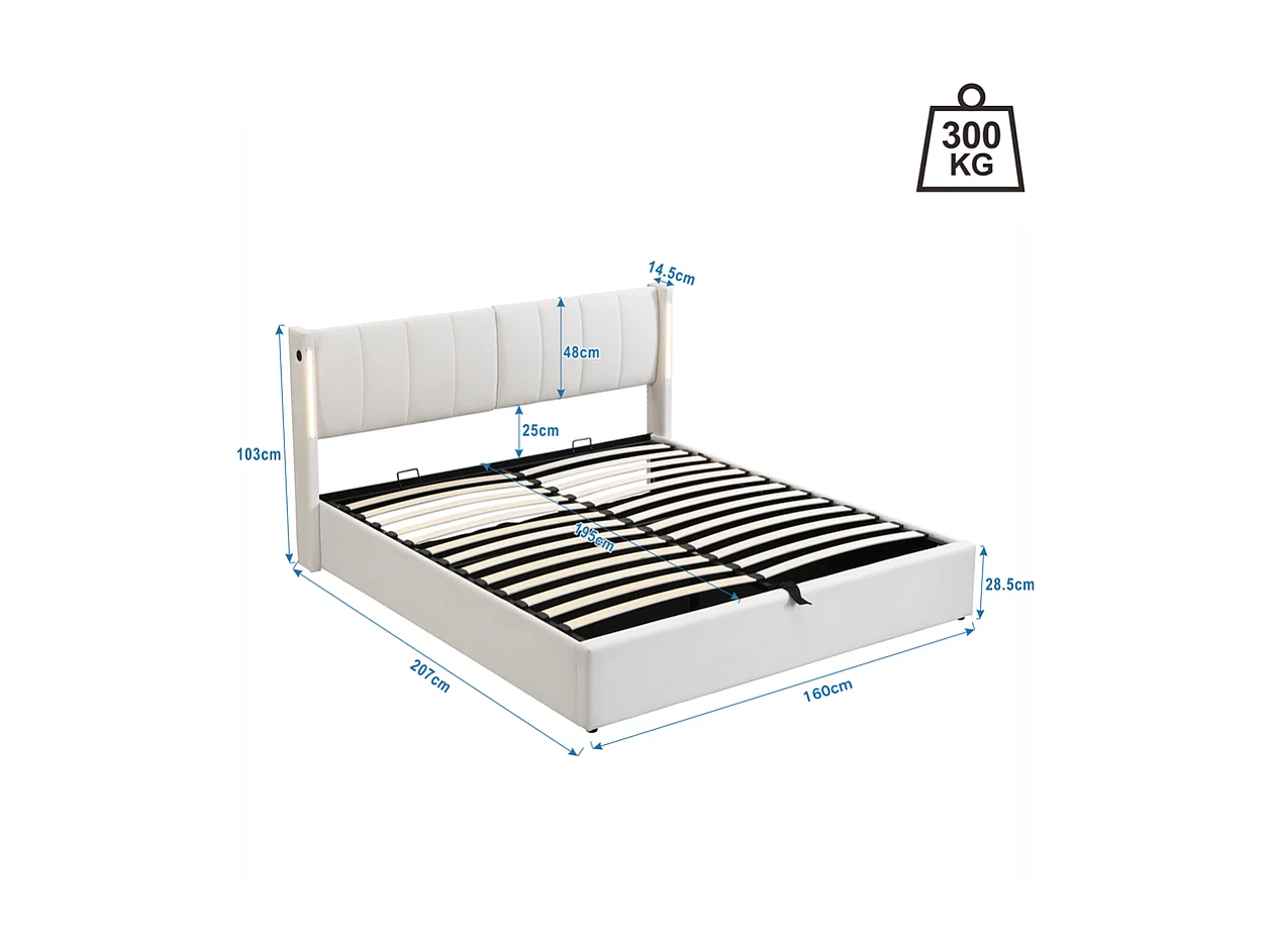 Lit coffre rembourré en similicuir - 160x200cm - avec Port USB et LED - tête de lit à angle réglable - Blanc