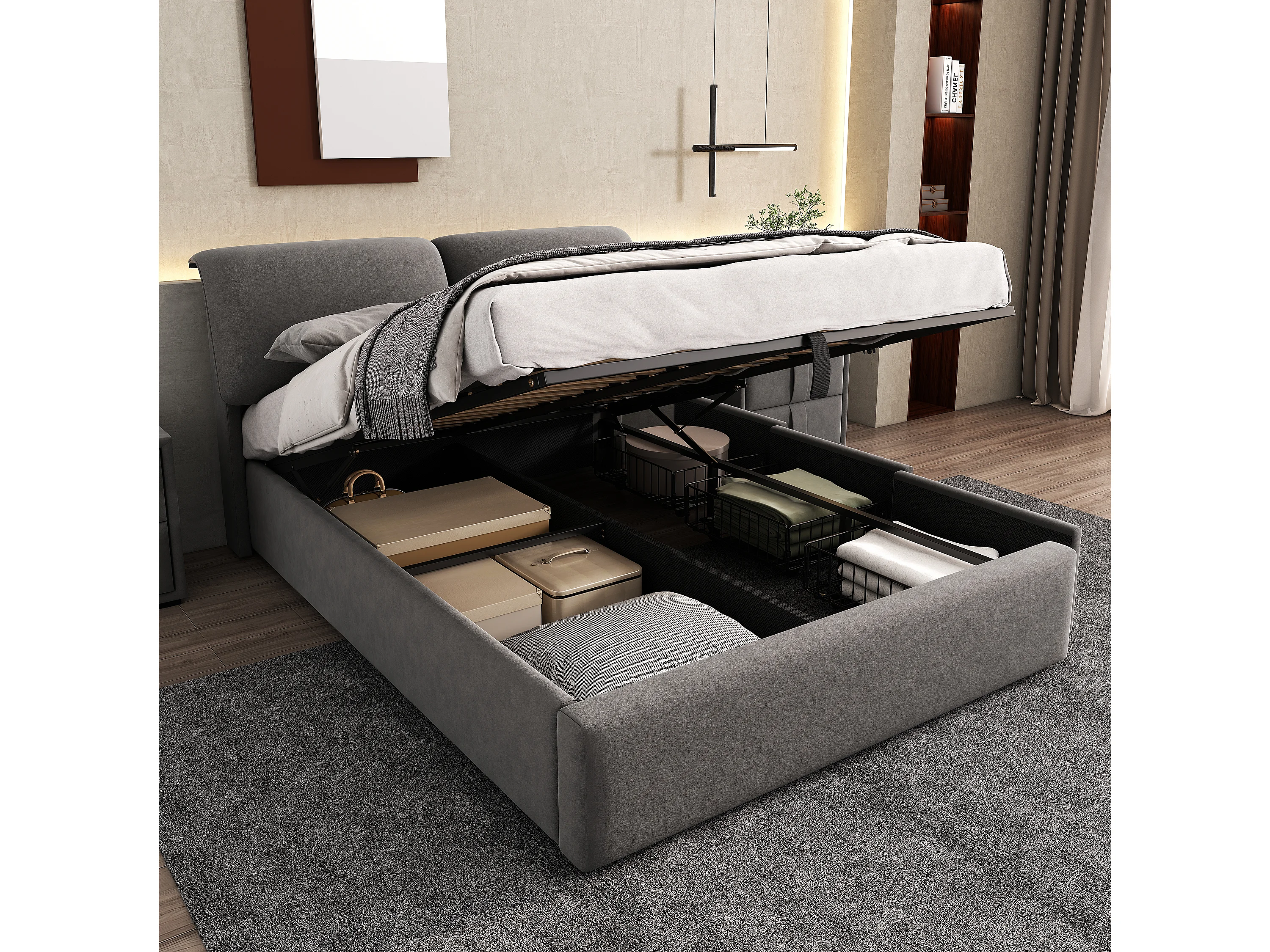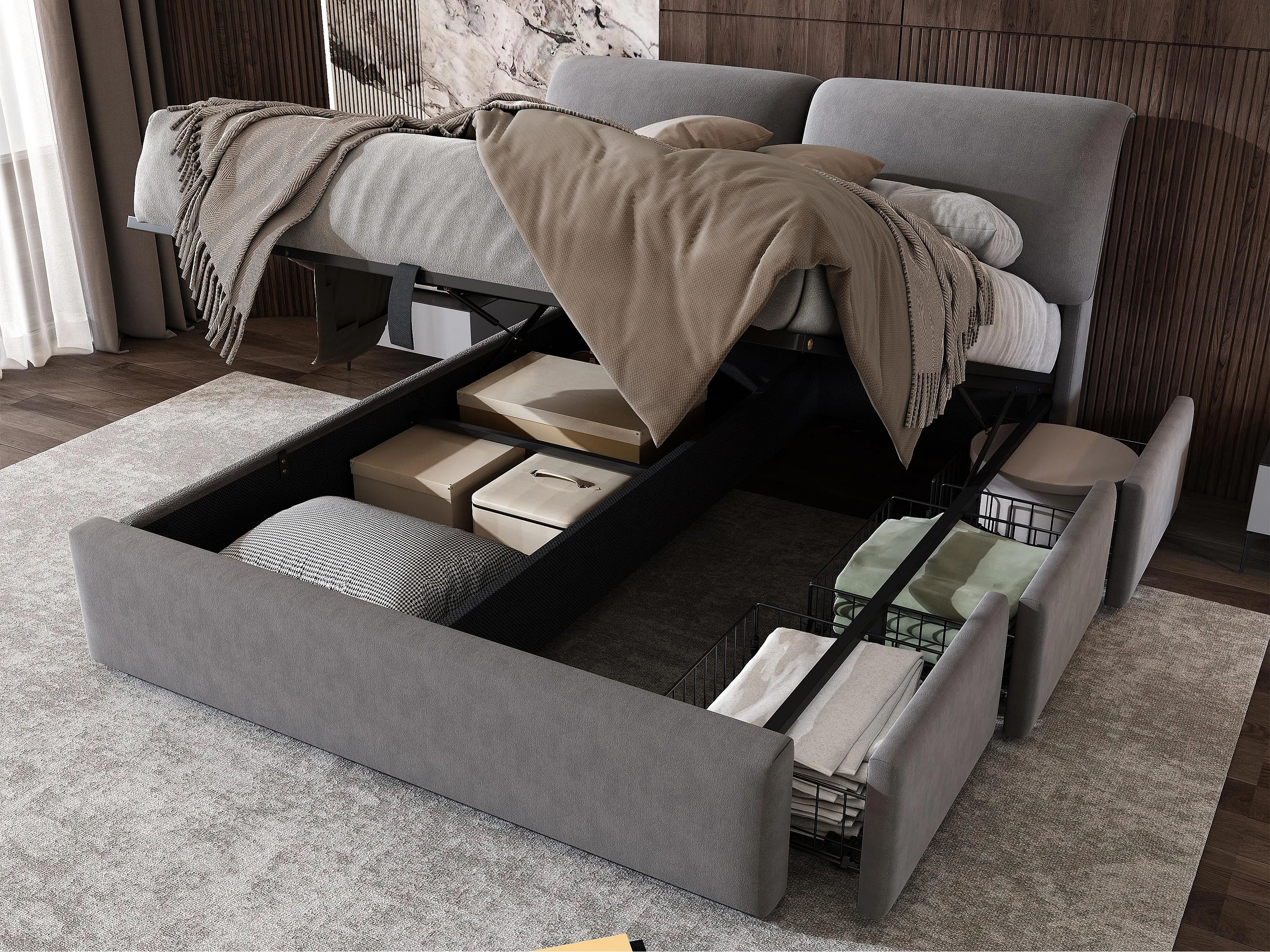 Lit coffre en velours - 140x200cm - avec 3 tiroirs - Gris (sans matelas)