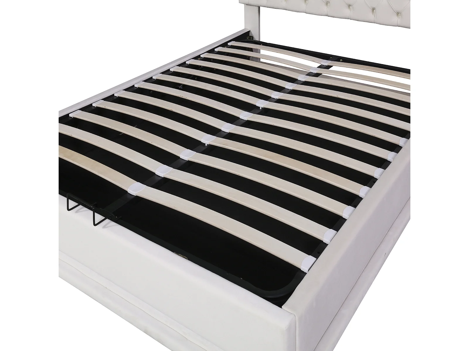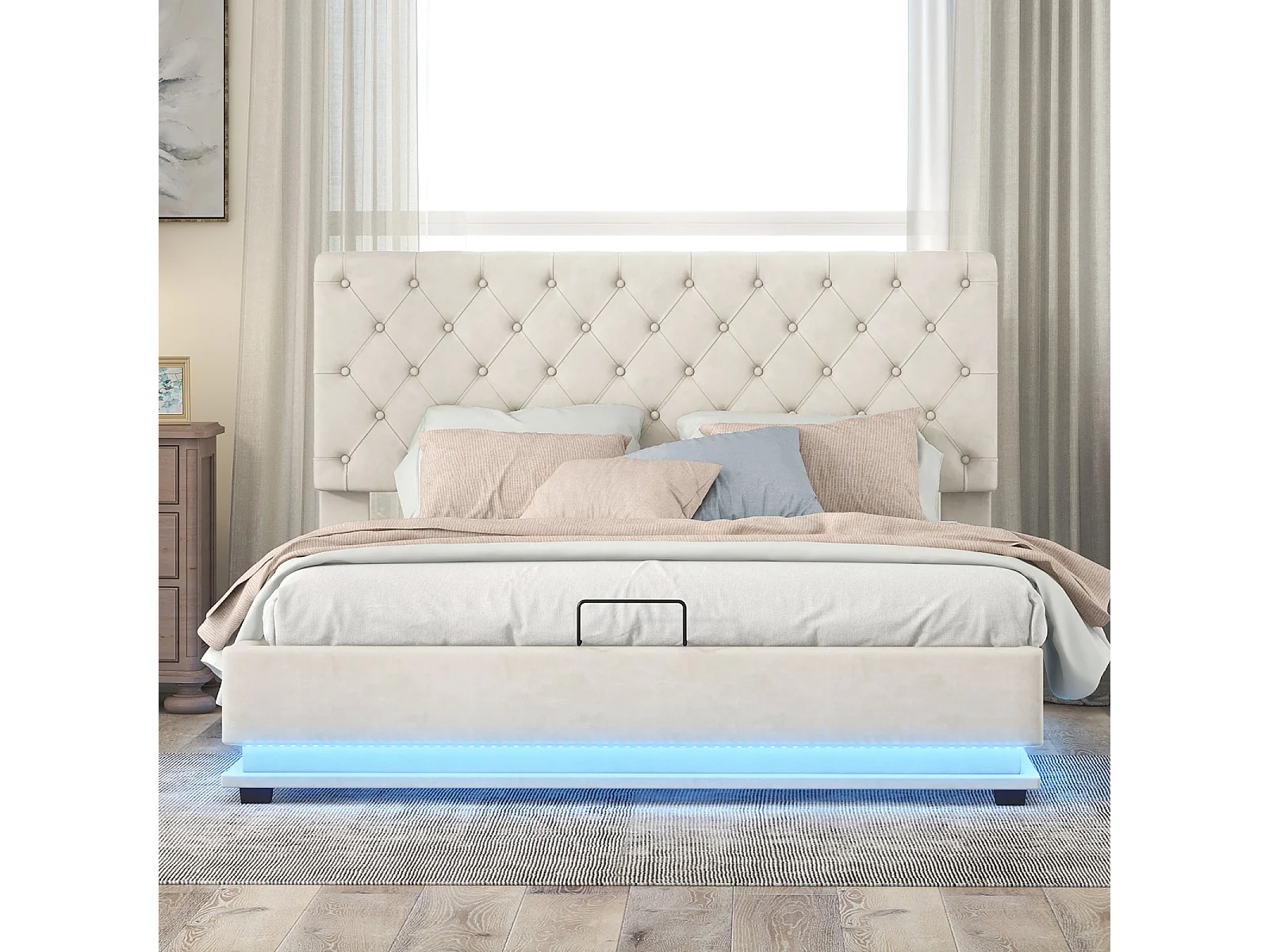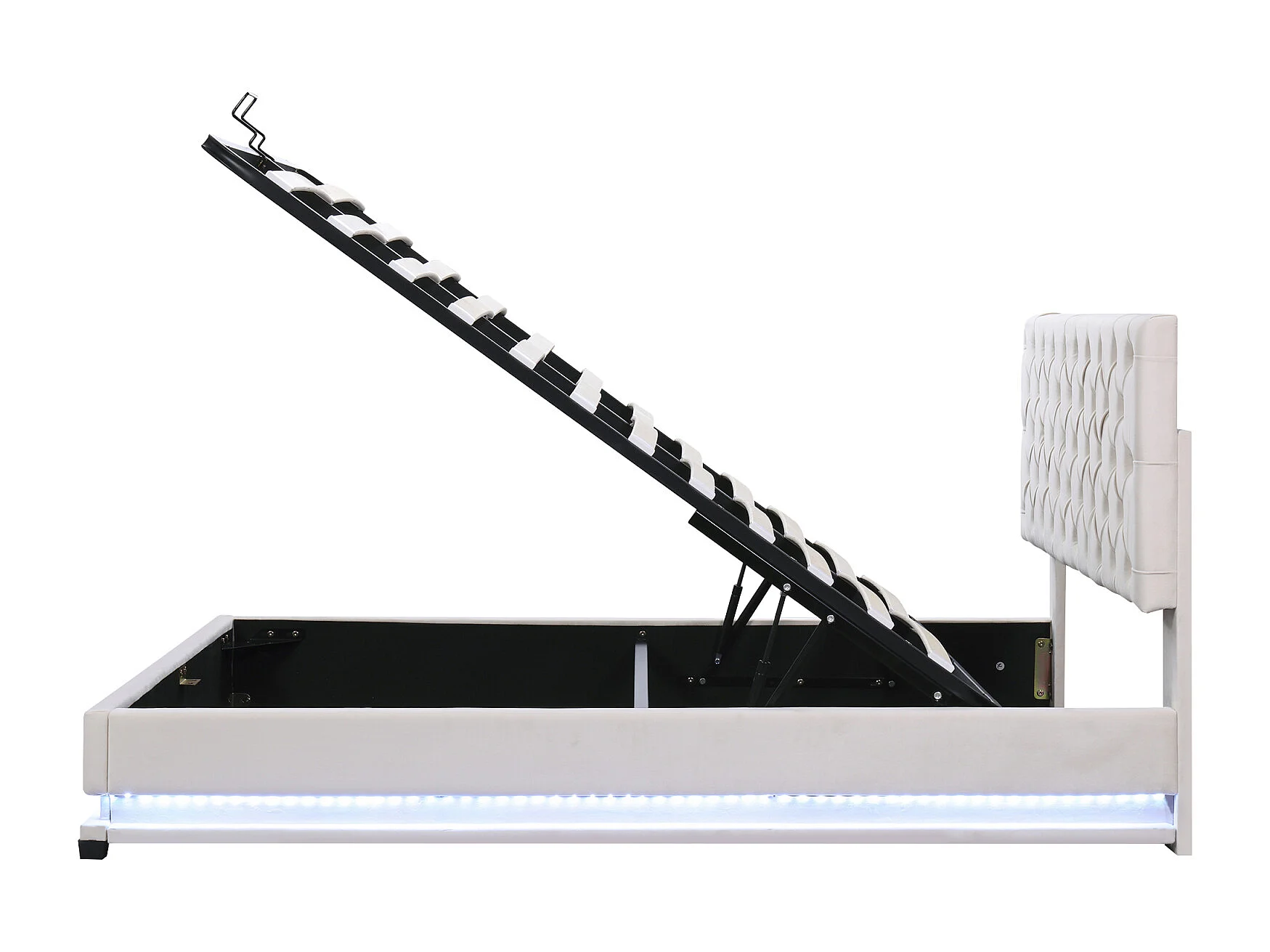 Lit coffre rembourré LED avec hydraulique et couvre-sommier à lattes, tête de lit réglable, Beige, 140x200cm