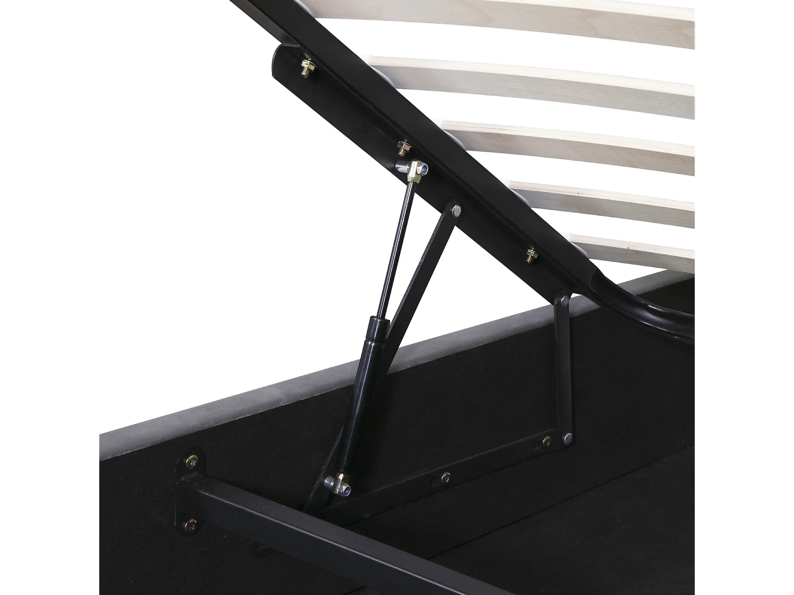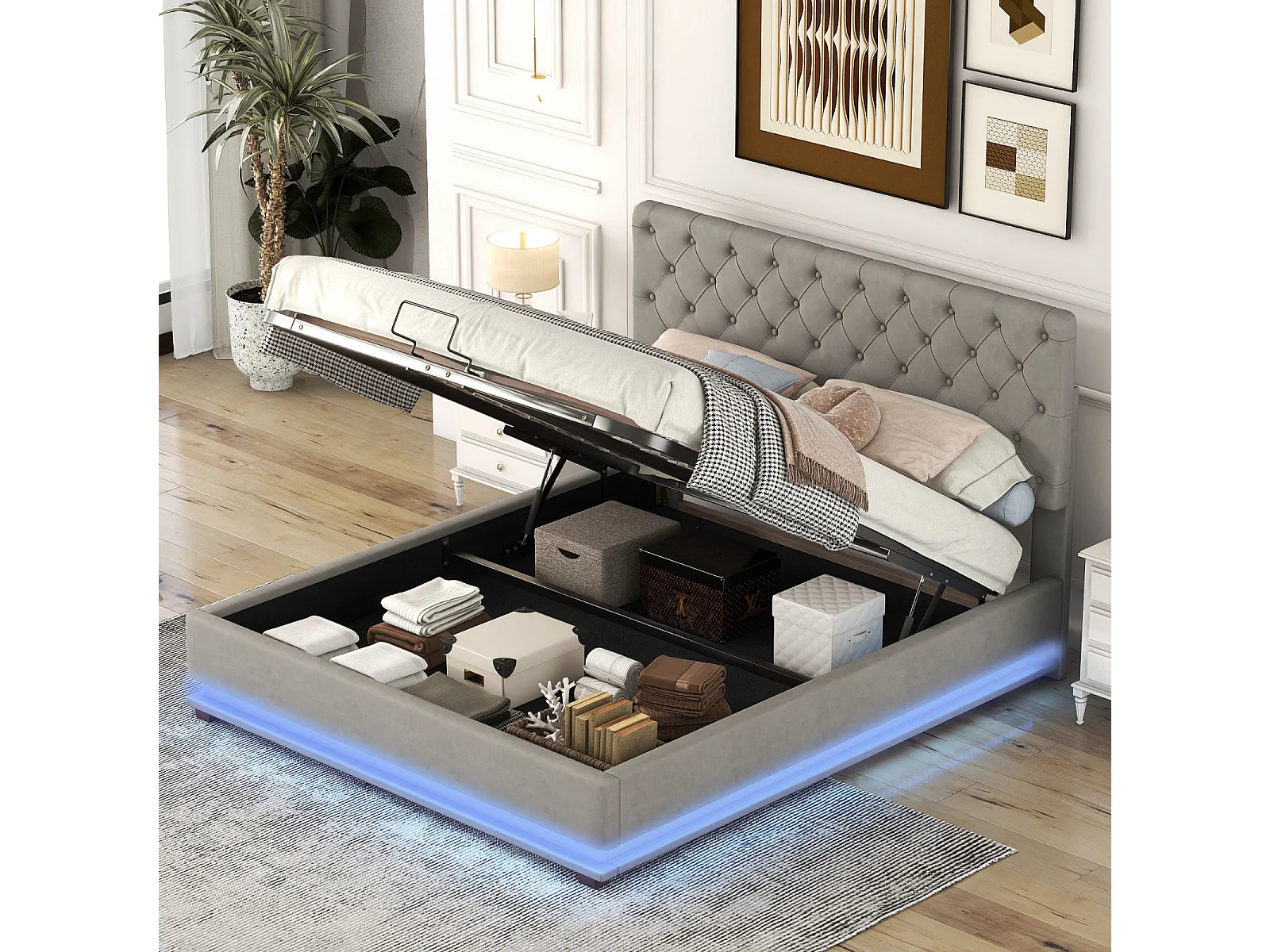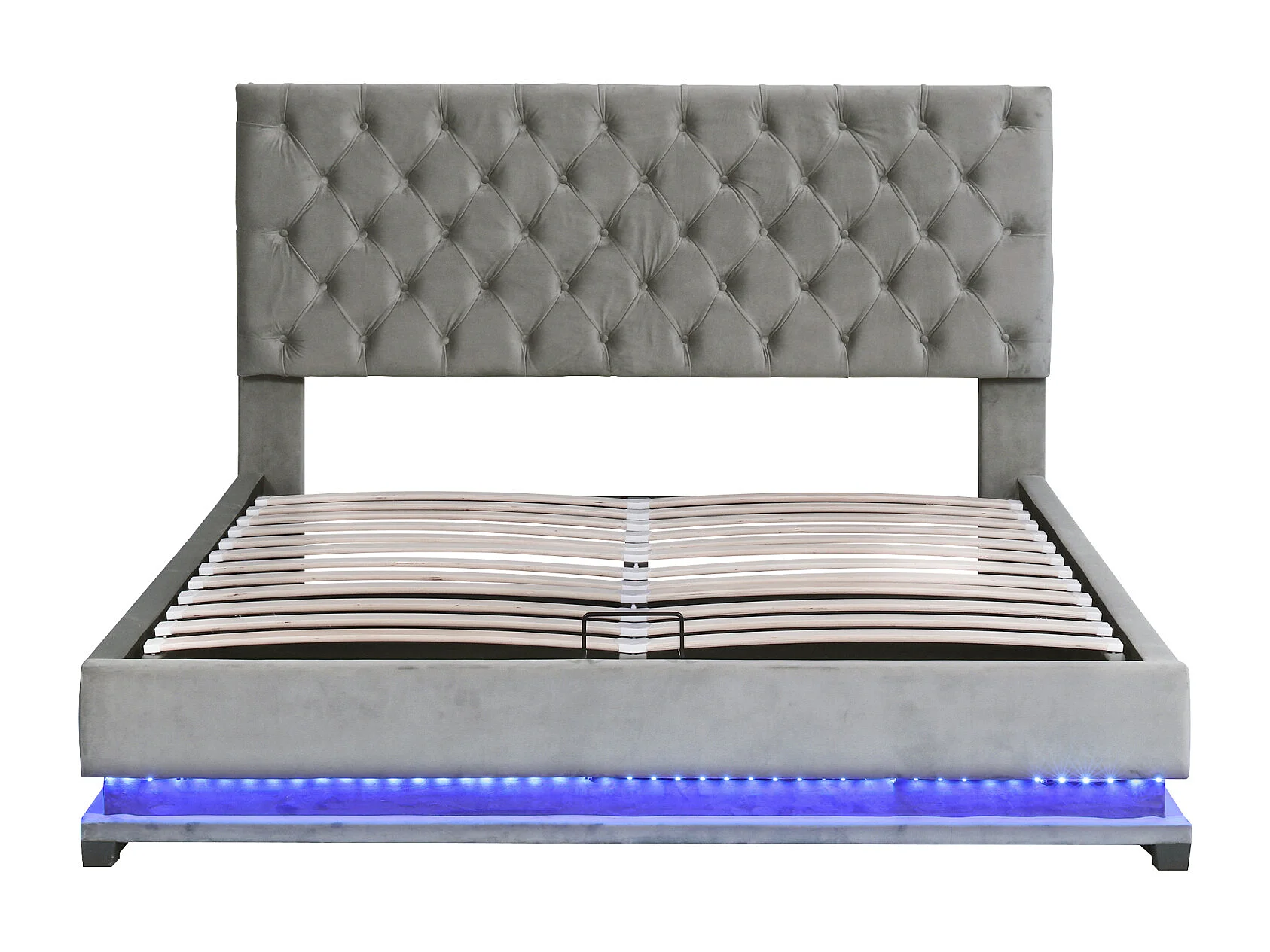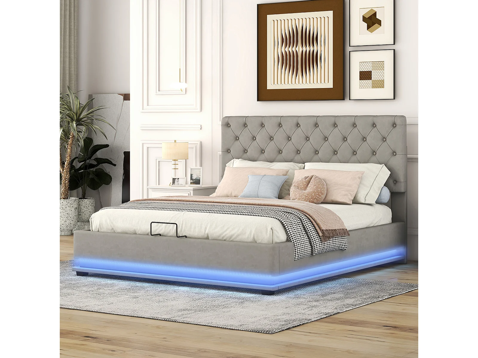 Lit coffre rembourré LED avec hydraulique et couvre-sommier à lattes, tête de lit réglable, Gris, 140x200cm