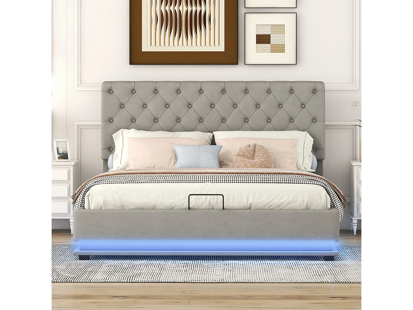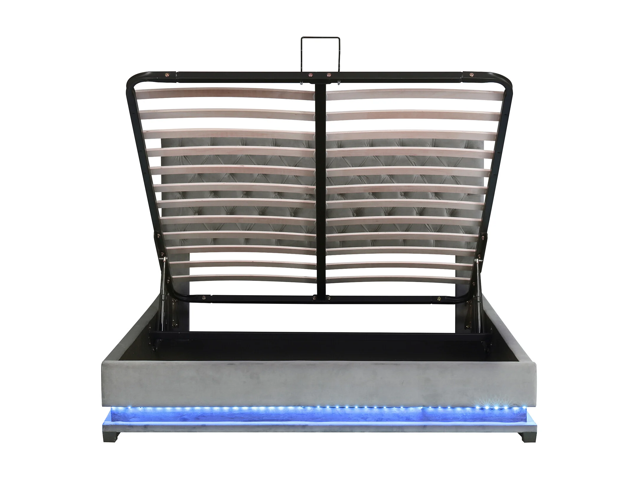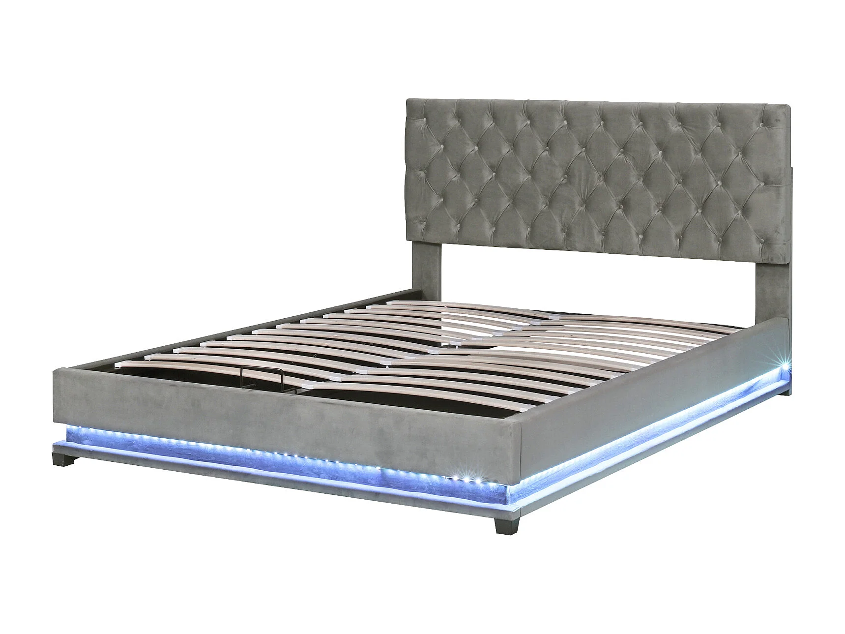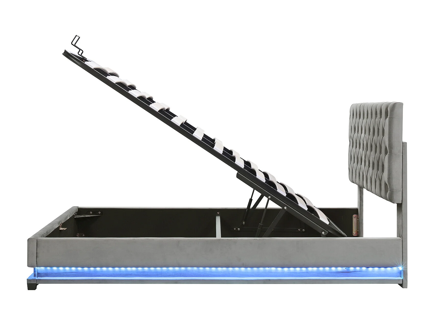 Lit coffre rembourré LED avec hydraulique et couvre-sommier à lattes, tête de lit réglable, Gris, 140x200cm
