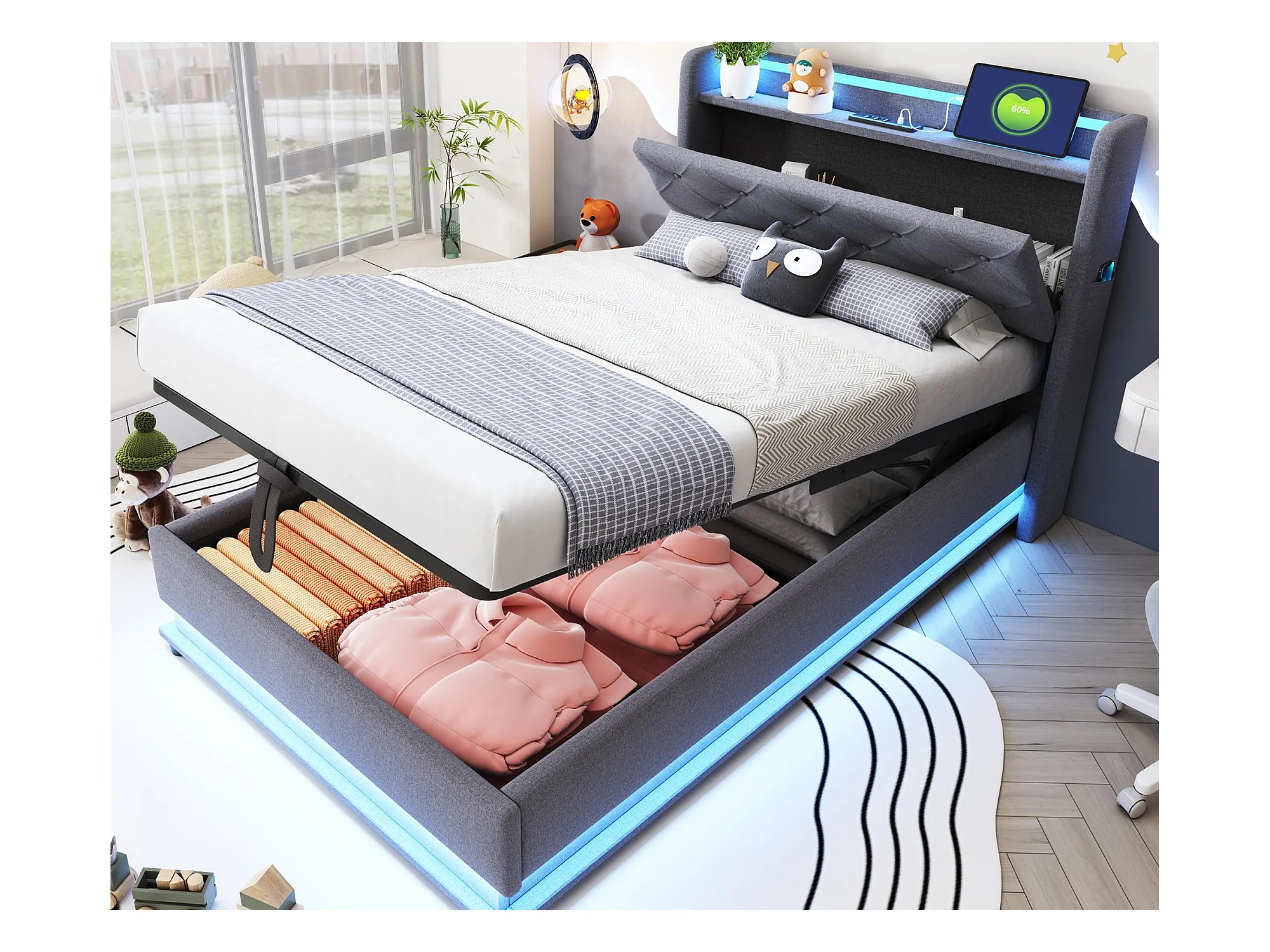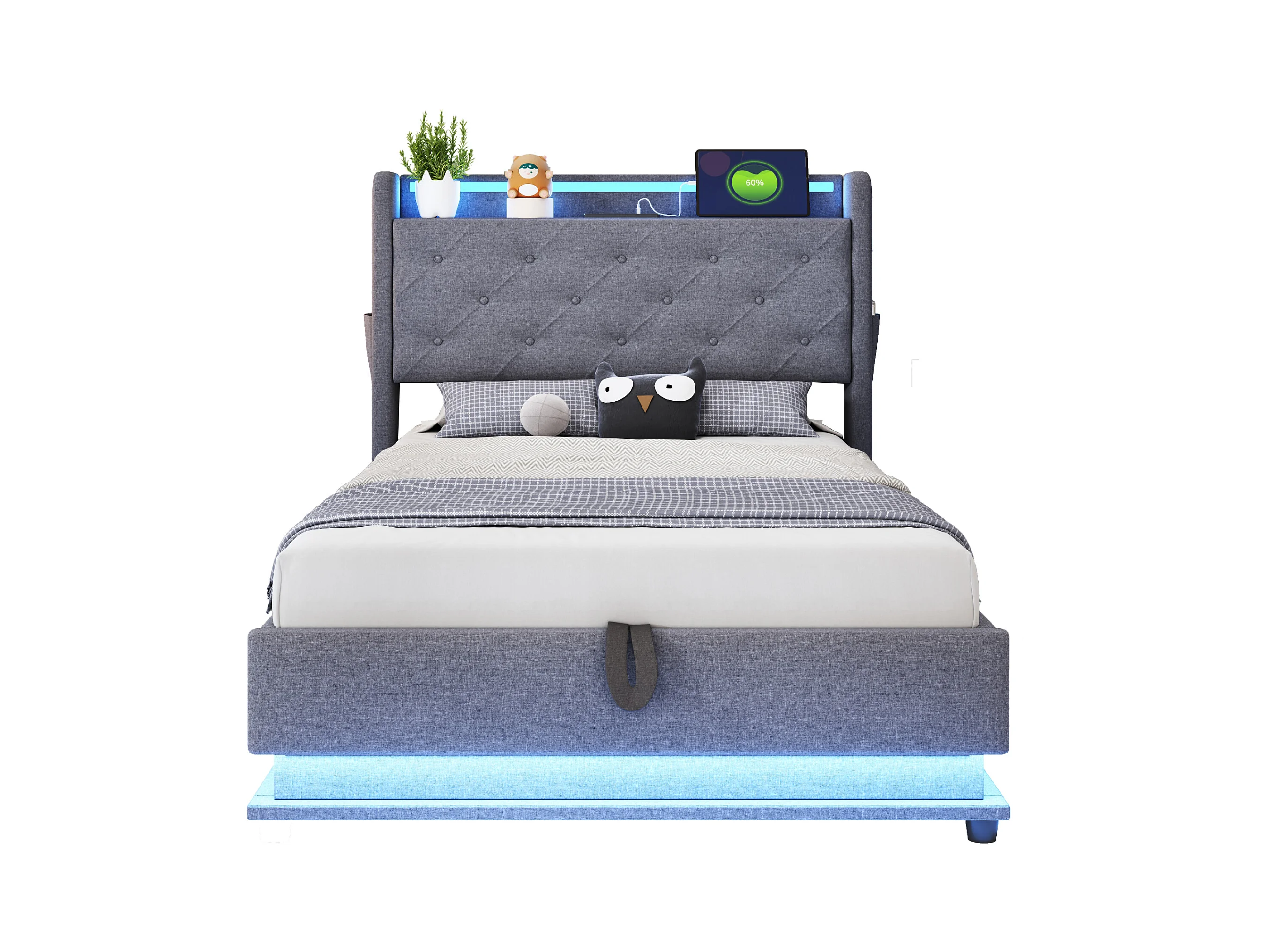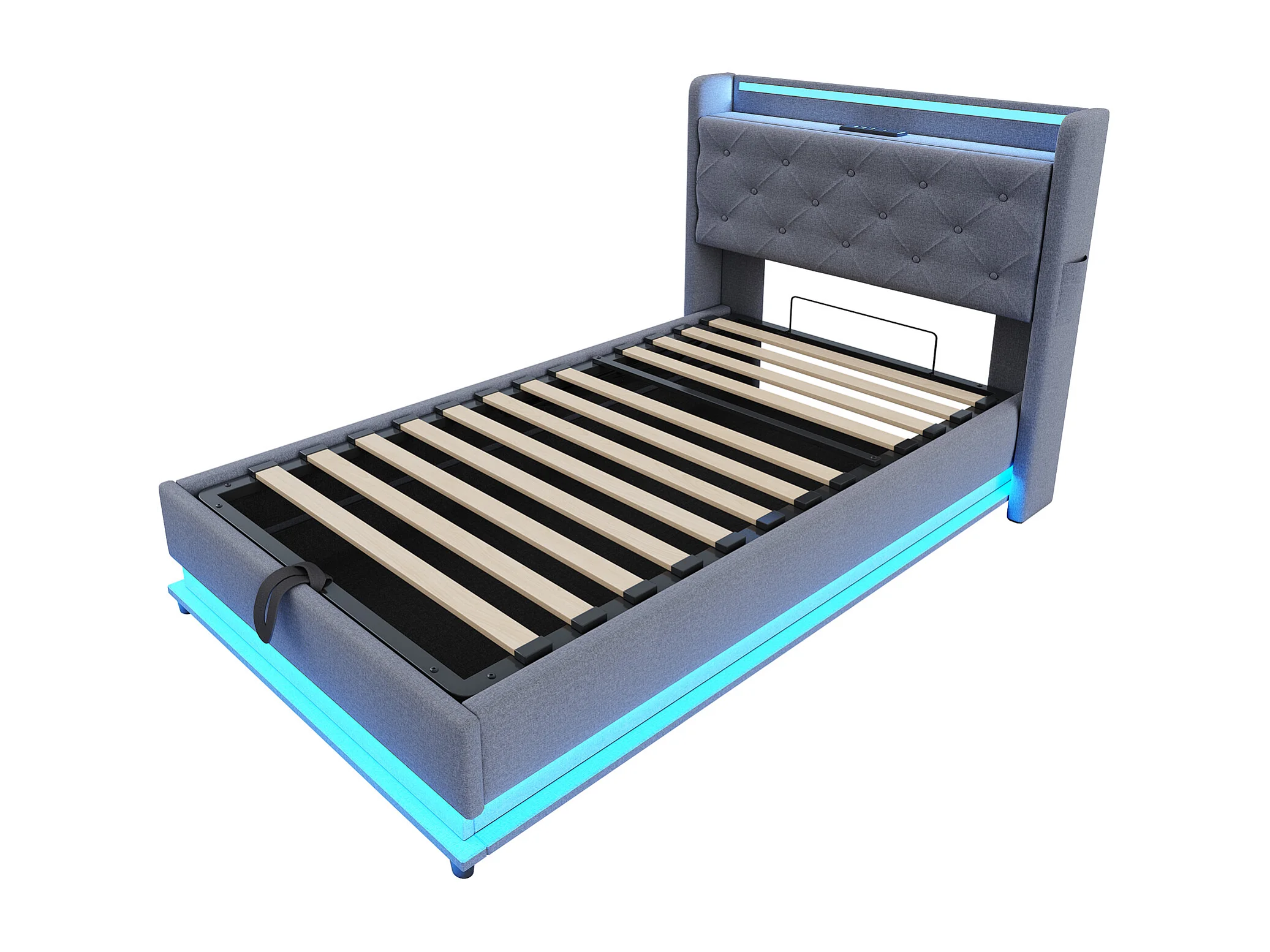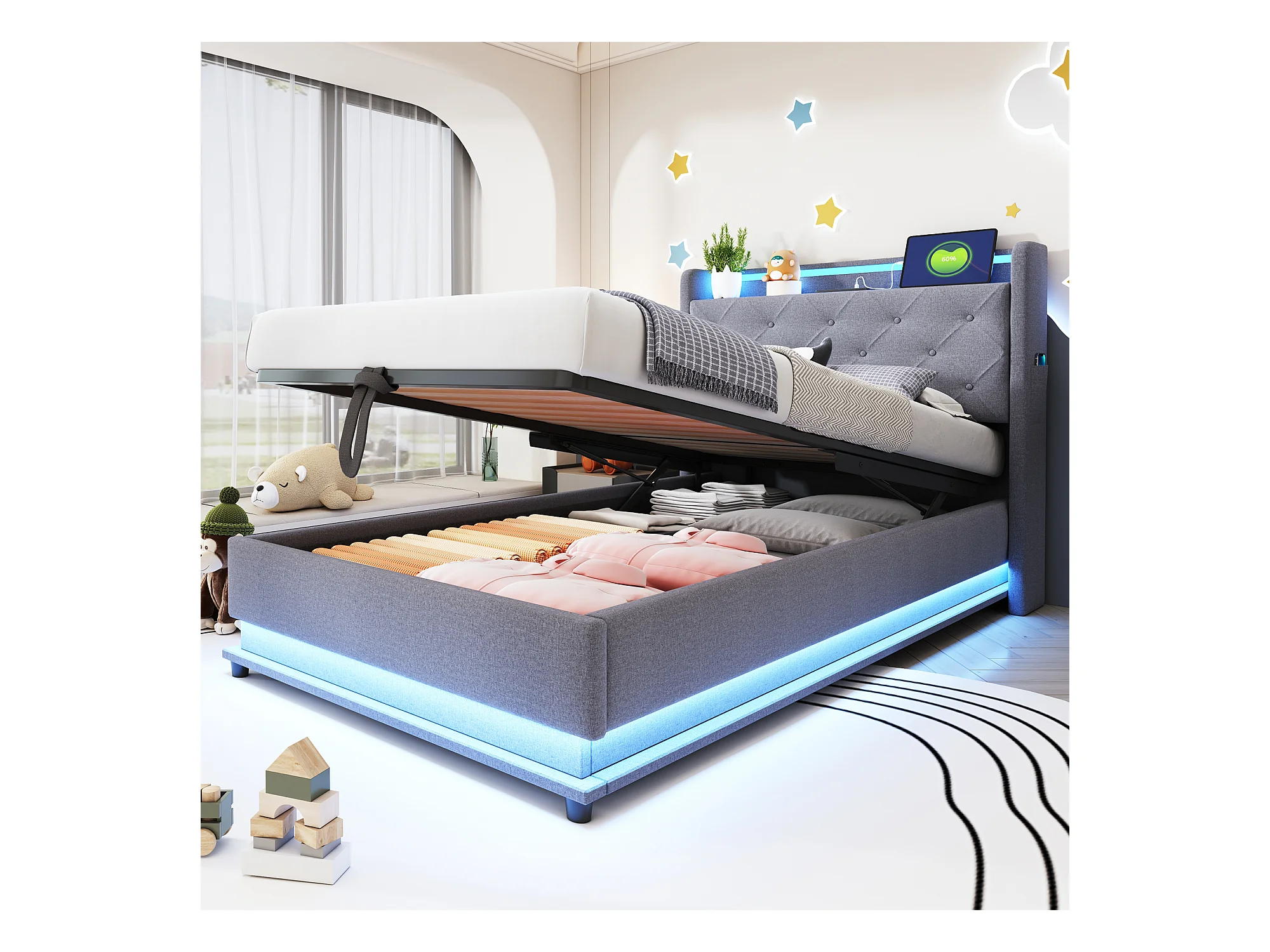Lit coffre rembourré pour enfant 90x200 cm - avec éclairage LED - avec prise USB - tête de lit ouvrable - lin - gris