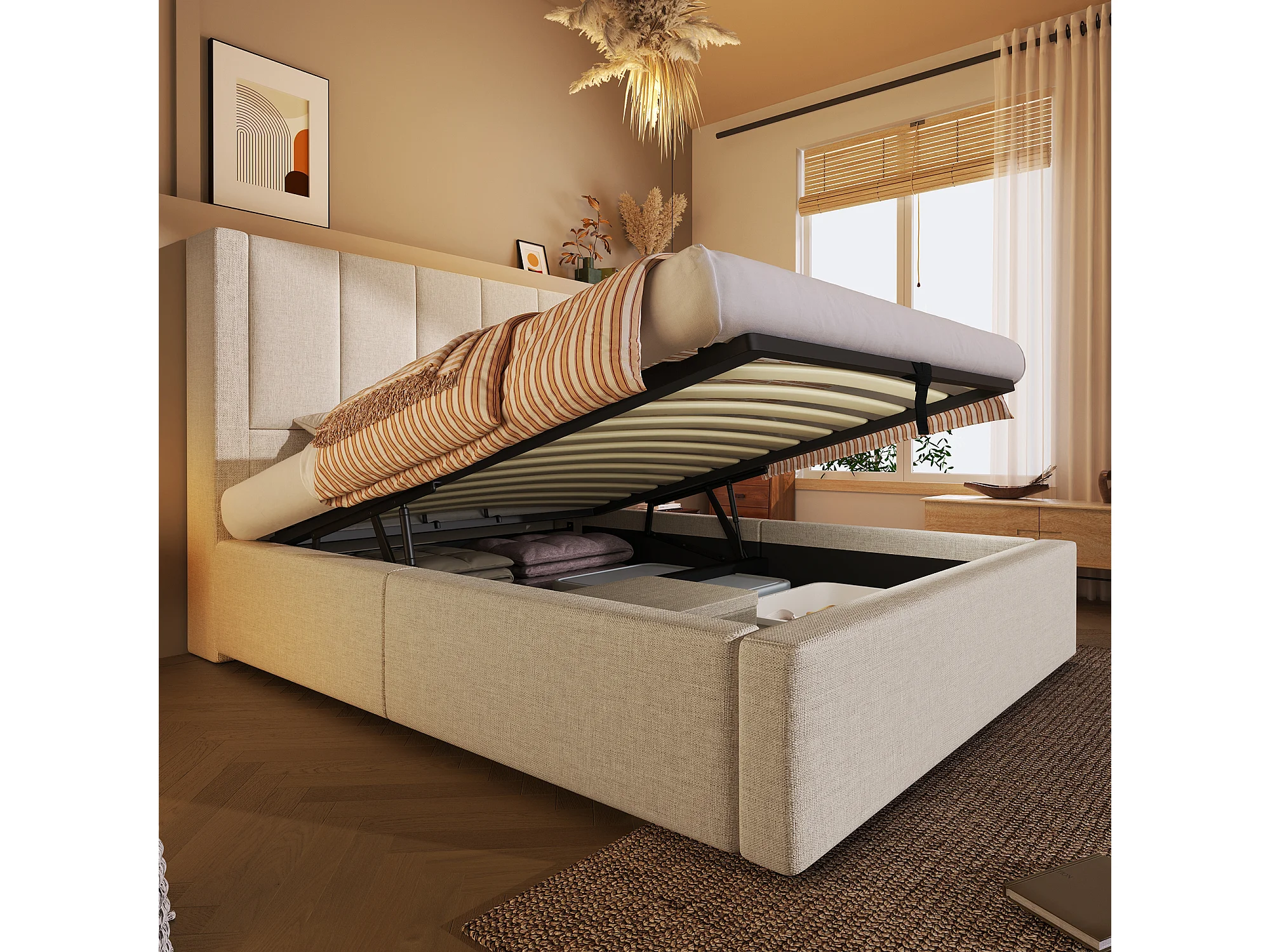 Lit coffre rembourré simple - 90 x 200 cm - avec porte-gobelet caché et station de charge - lin - beige(avec matelas)