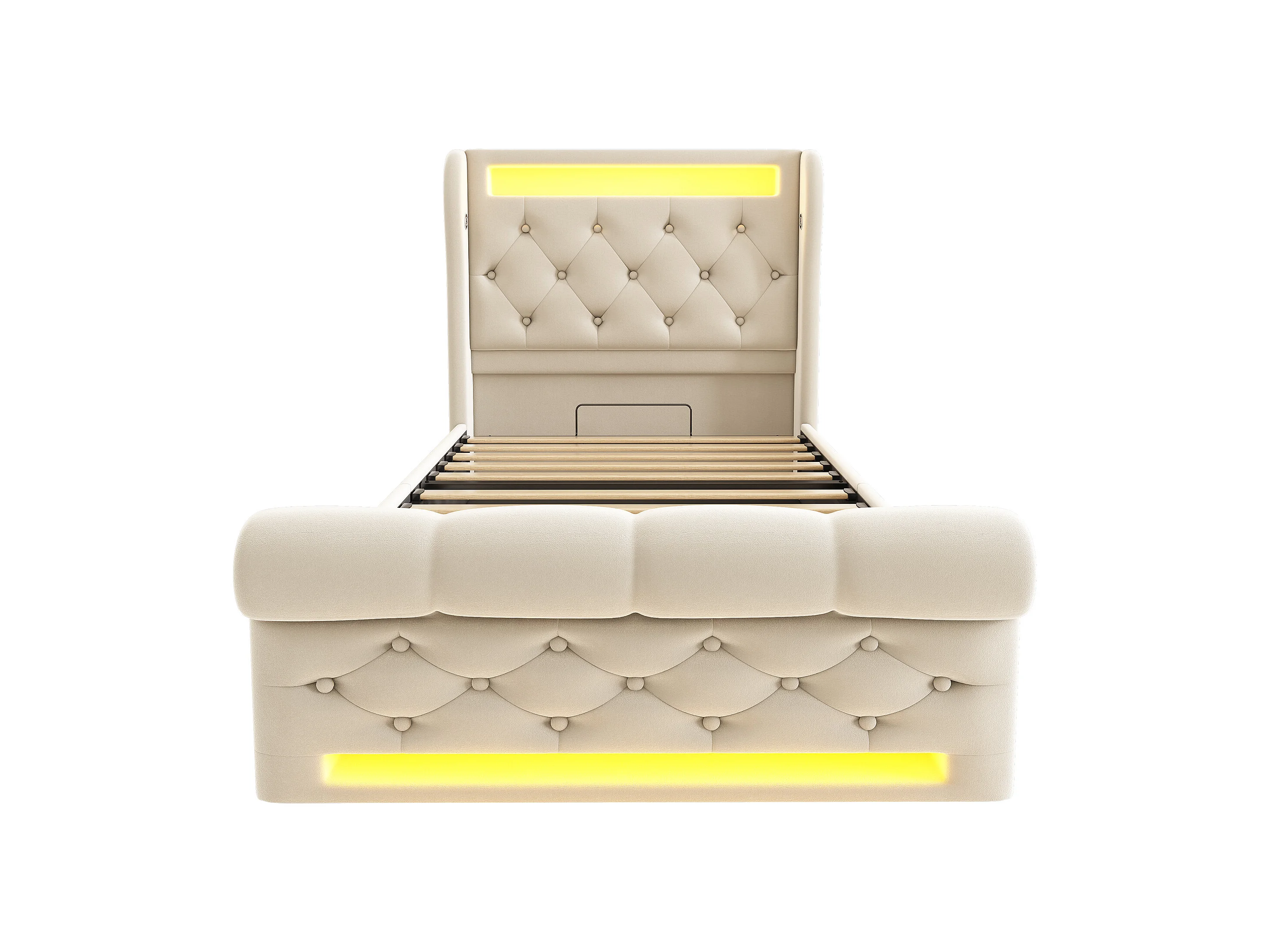 lit coffre simple 90x200cm, tête de lit avec port USB, Type-C, LED, Velours beige, sans matelas