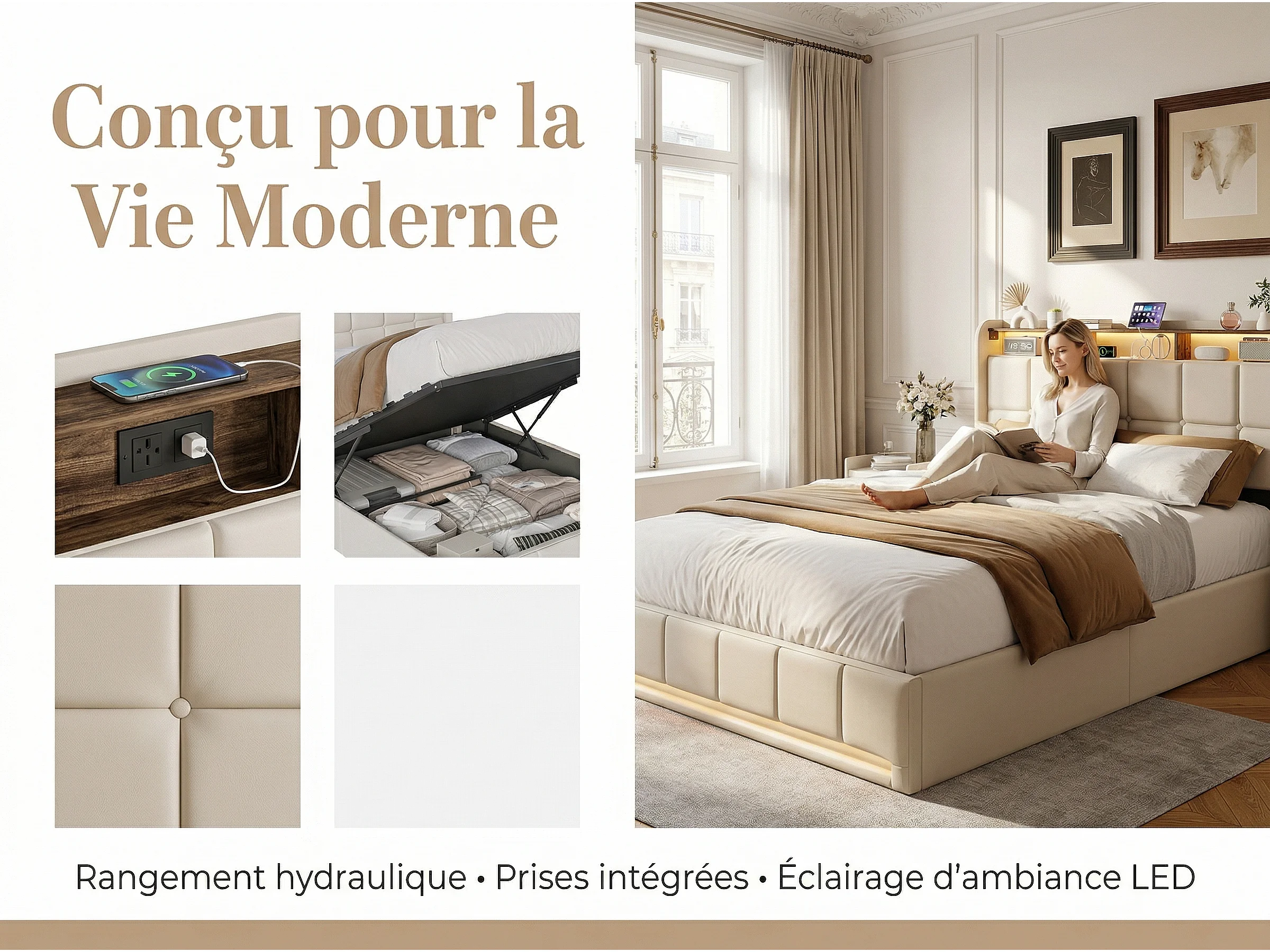 Lit coffre tissu lin avec LED et USB Type-C, lit double avec rangement tête de lit, design moderne