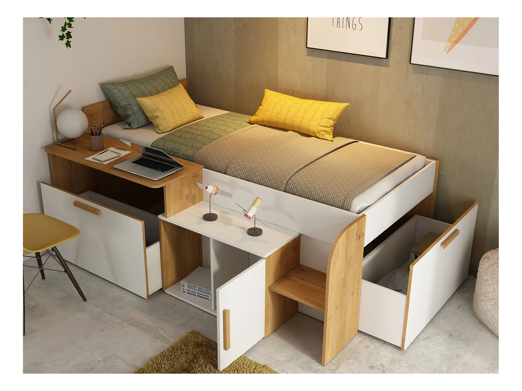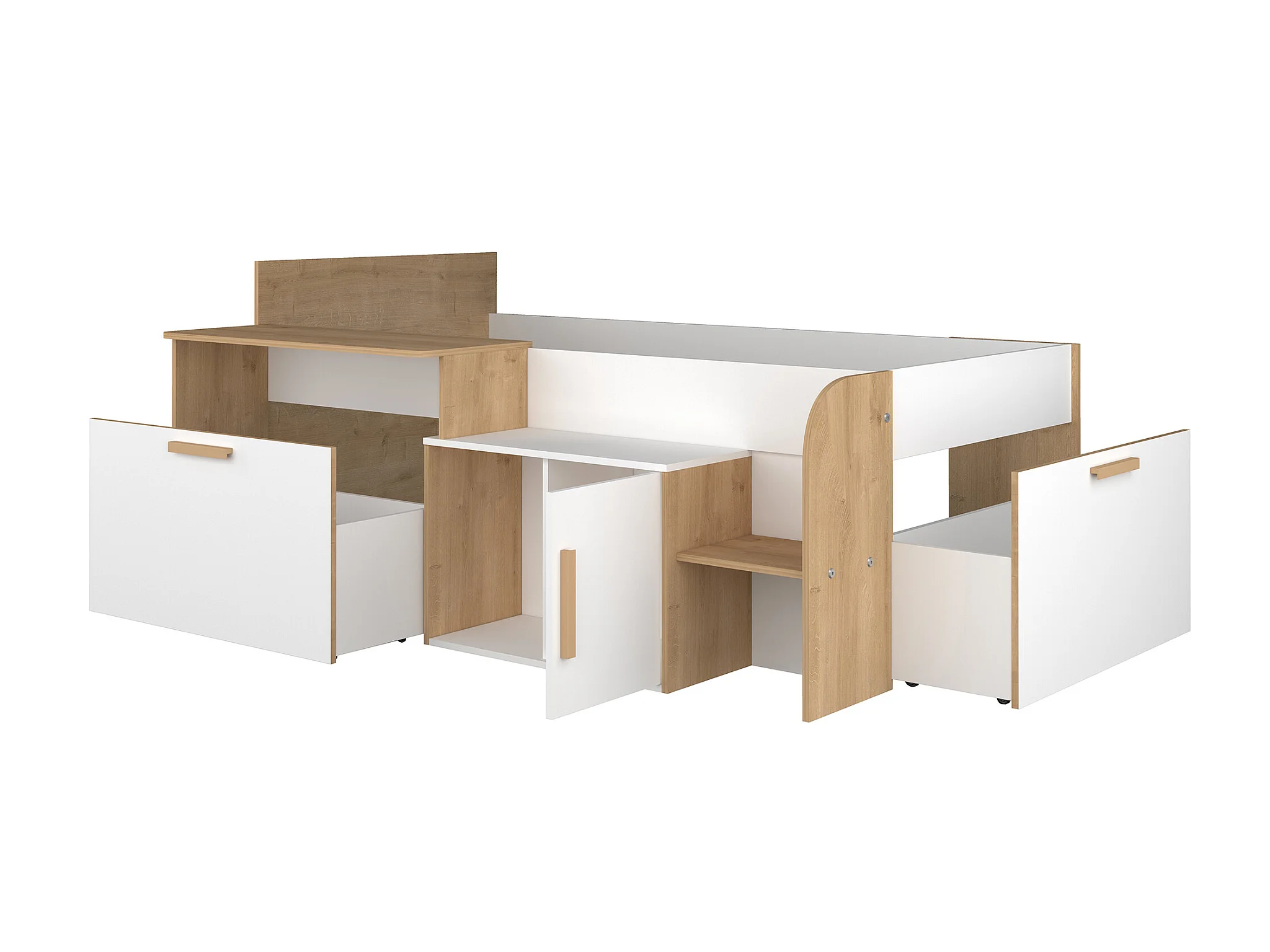 Lit combiné 90 x 200 cm avec bureau et rangements - Coloris : Blanc et naturel + Sommier + Matelas - PEDRO