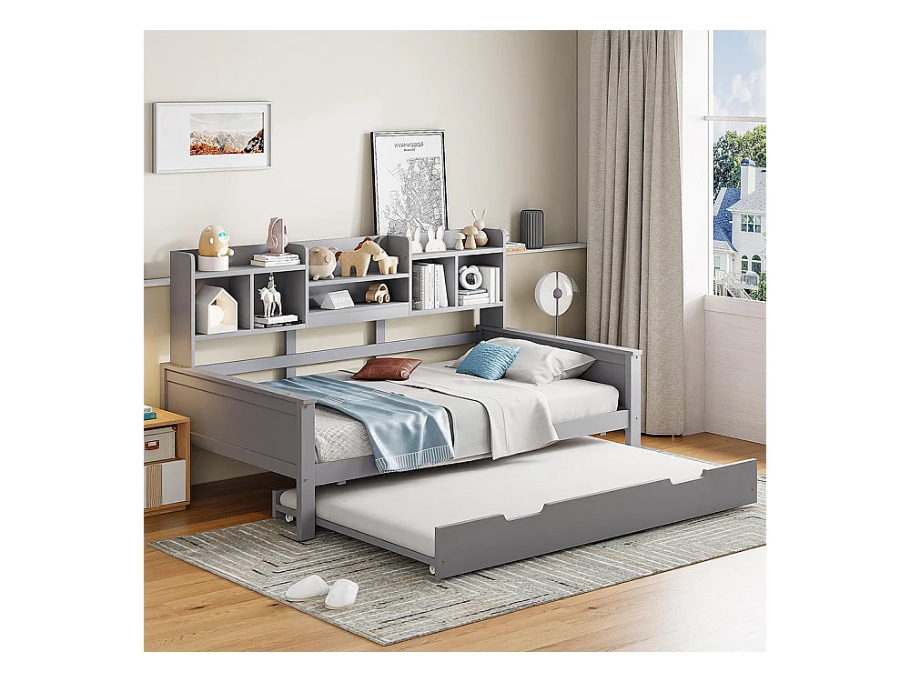 Lit combine extensible 90×200 en bois massif lit extensible 90×190 avec compartiment de rangement et sommier à lattes pin gris