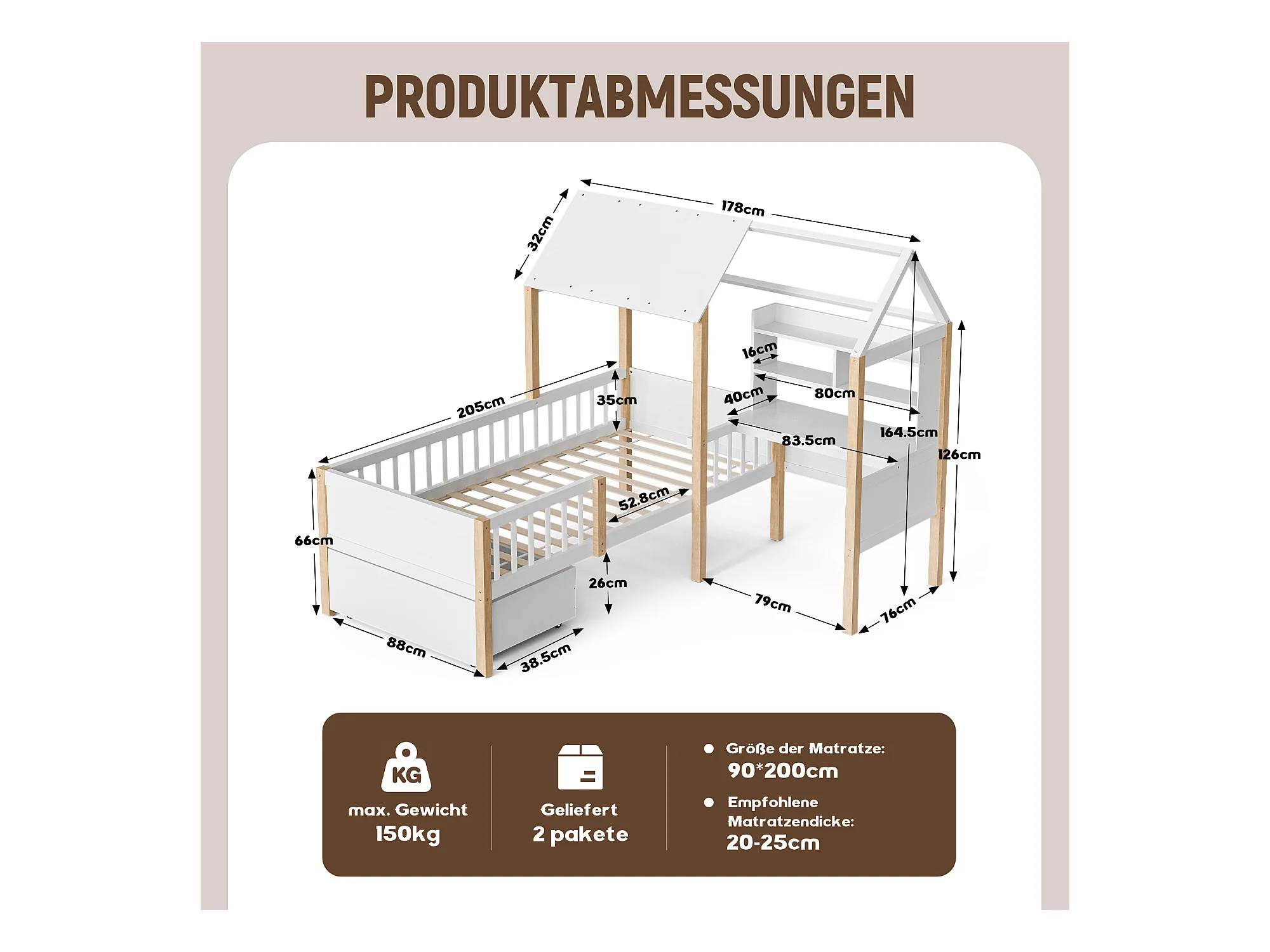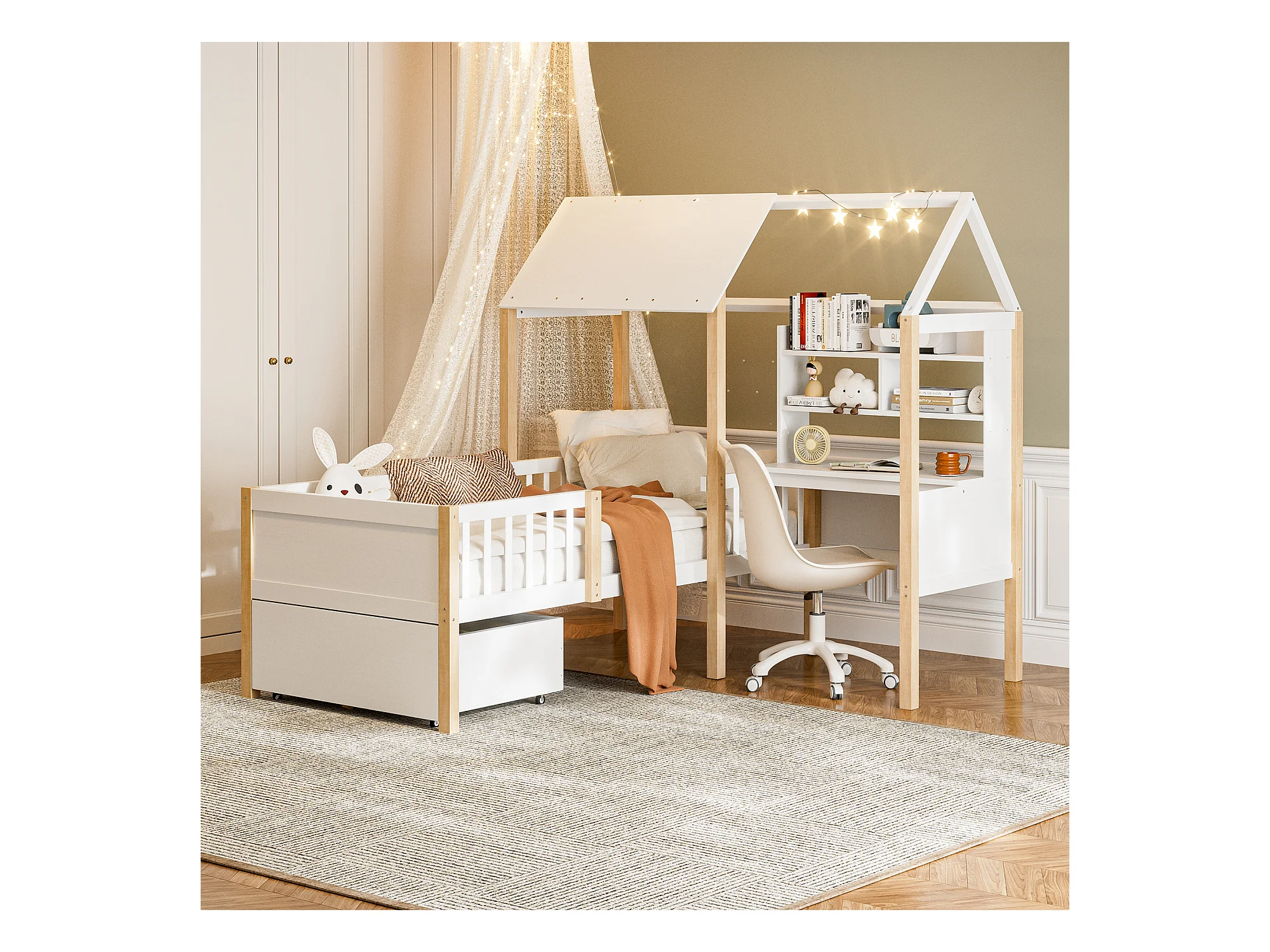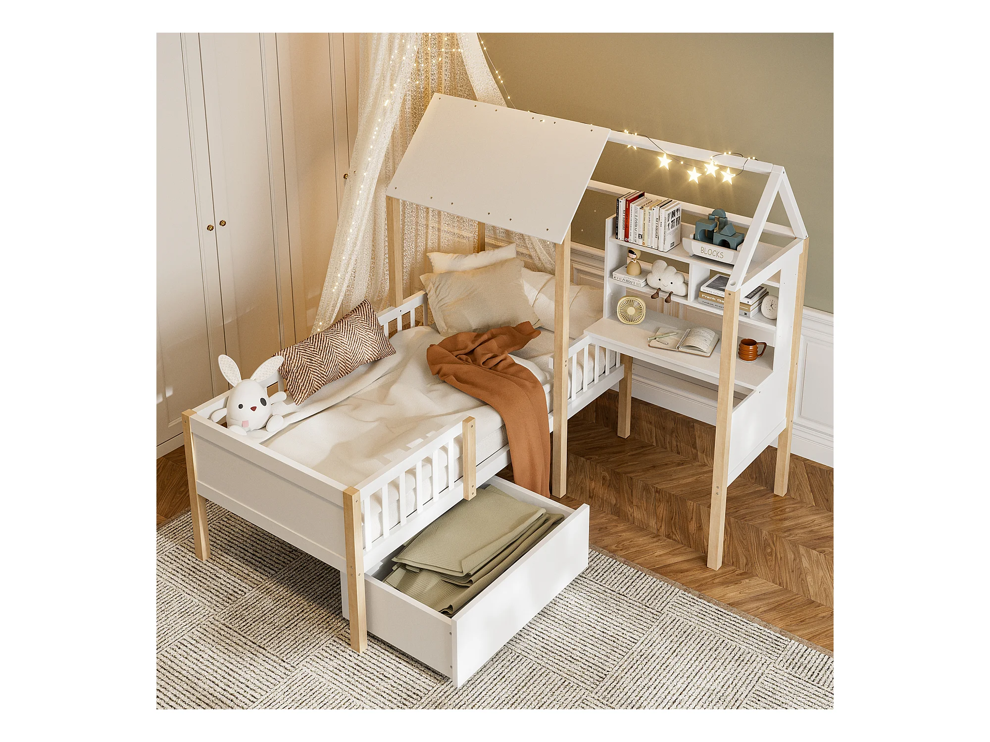 Lit combiné pour enfant - 90 x 200 cm - avec bureau en L + étagères intégrés + 1 tirois - bois - blanc
