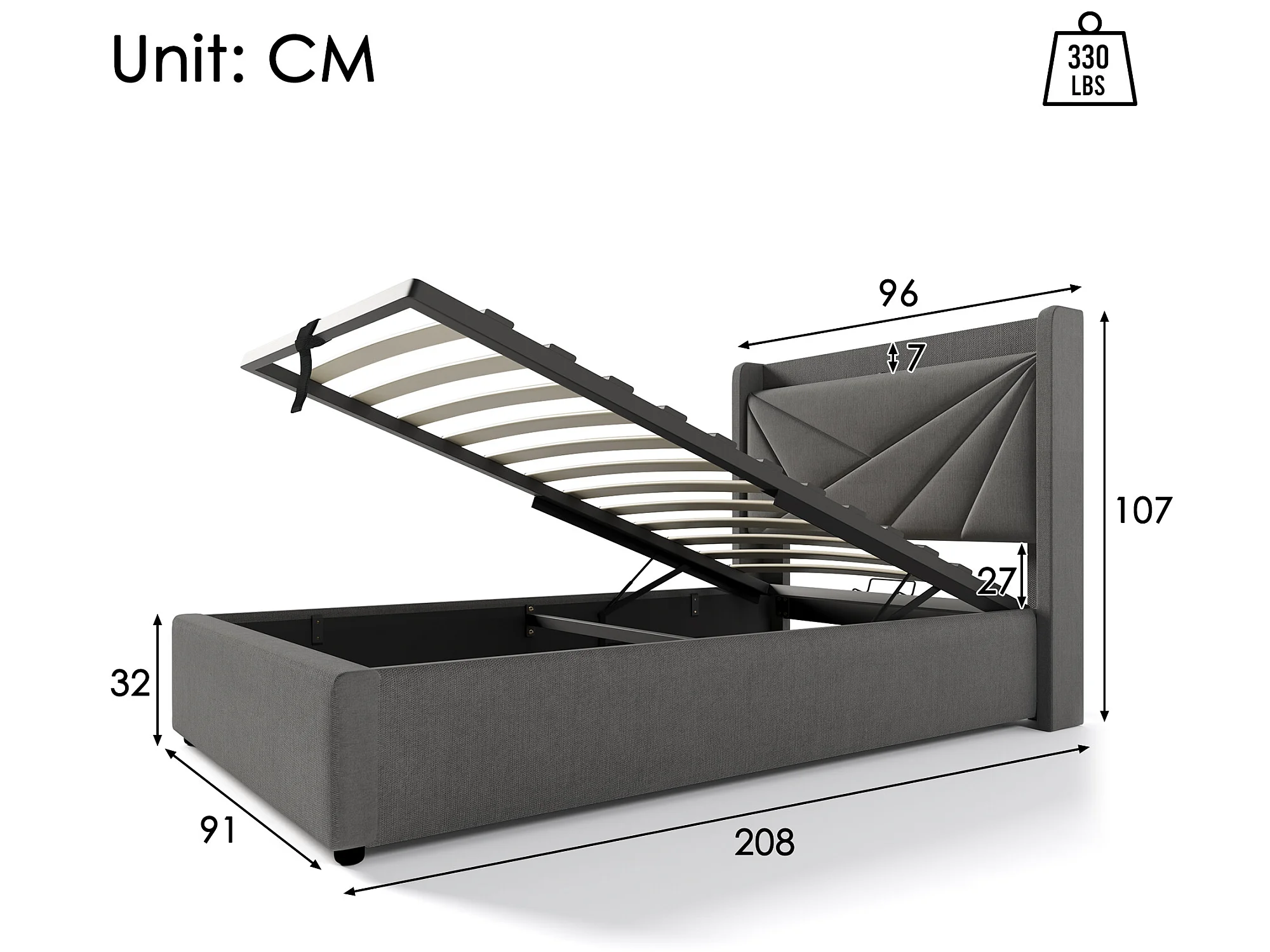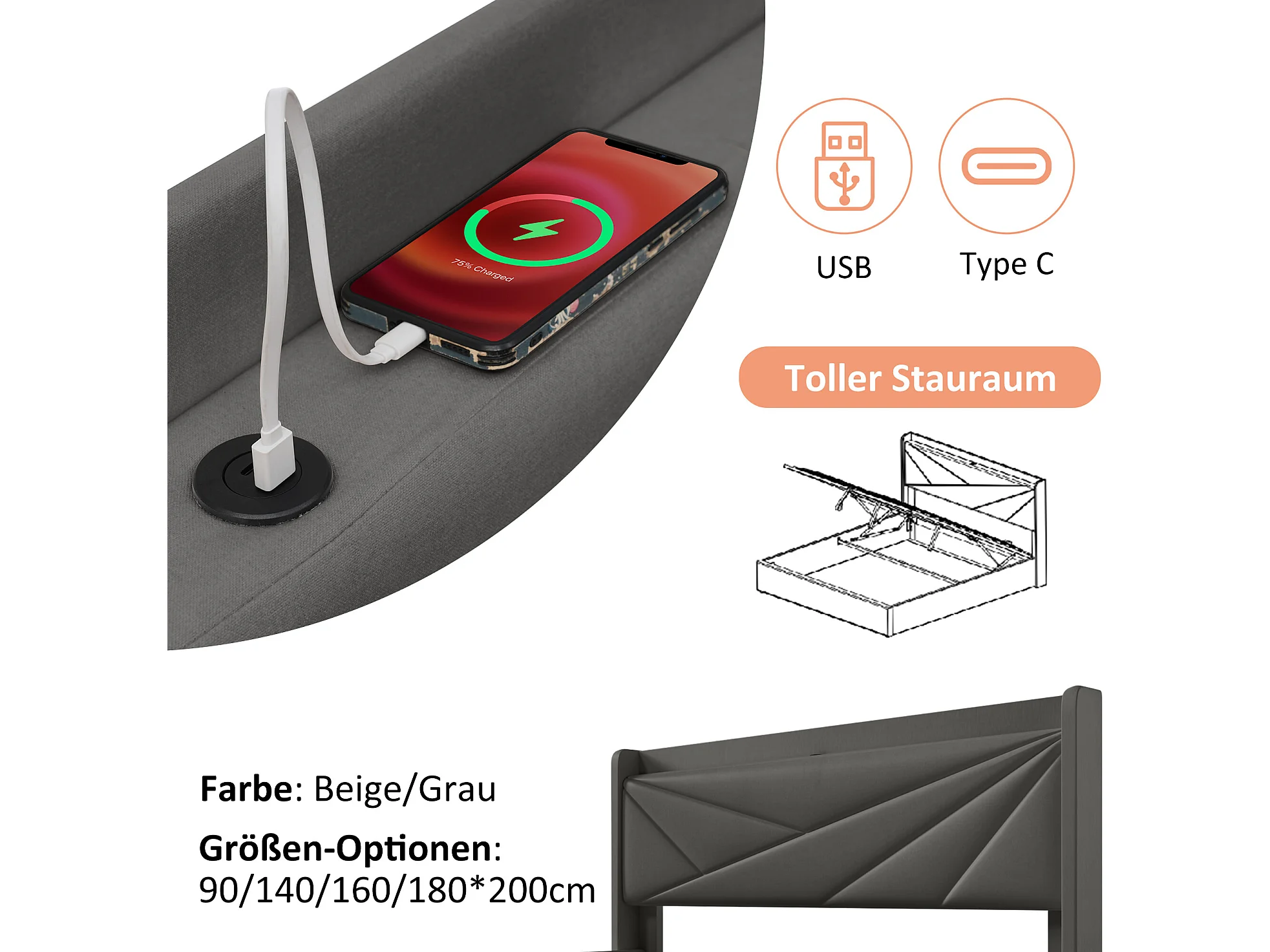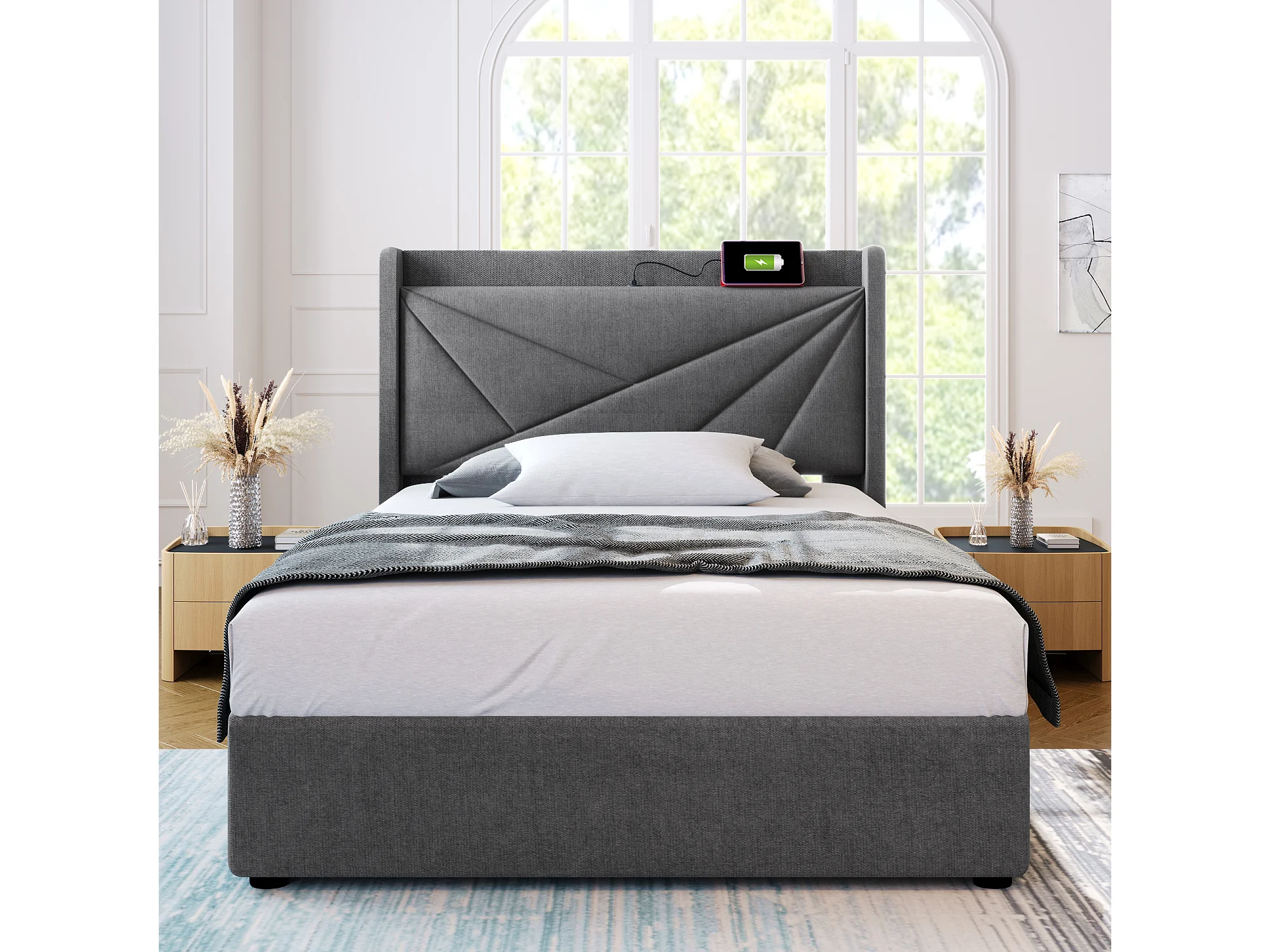 Lit confortable avec espace de rangement, chargeur usb type c et tête de lit