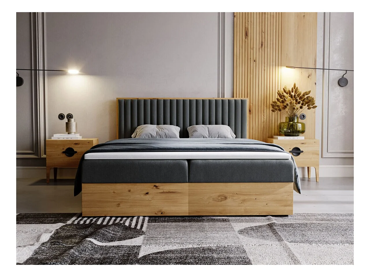 Lit continental Forest avec rangement - 180 x 200 - double - en bois avec tête de lit capitonnée - gris