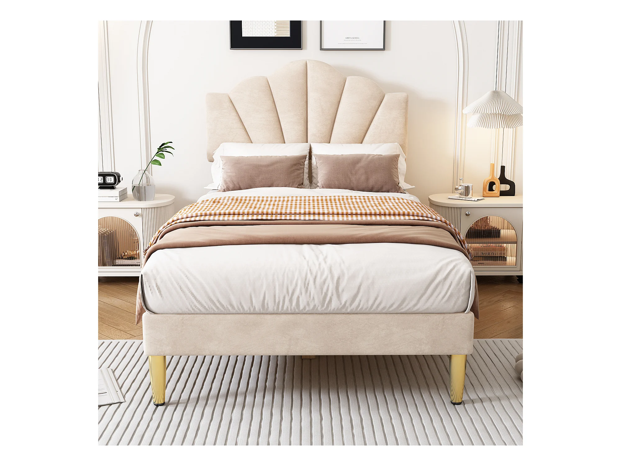 Lit coquillage simple 90x200 cm en velours beige avec pieds en métal doré, tête de lit réglable(sans matelas)
