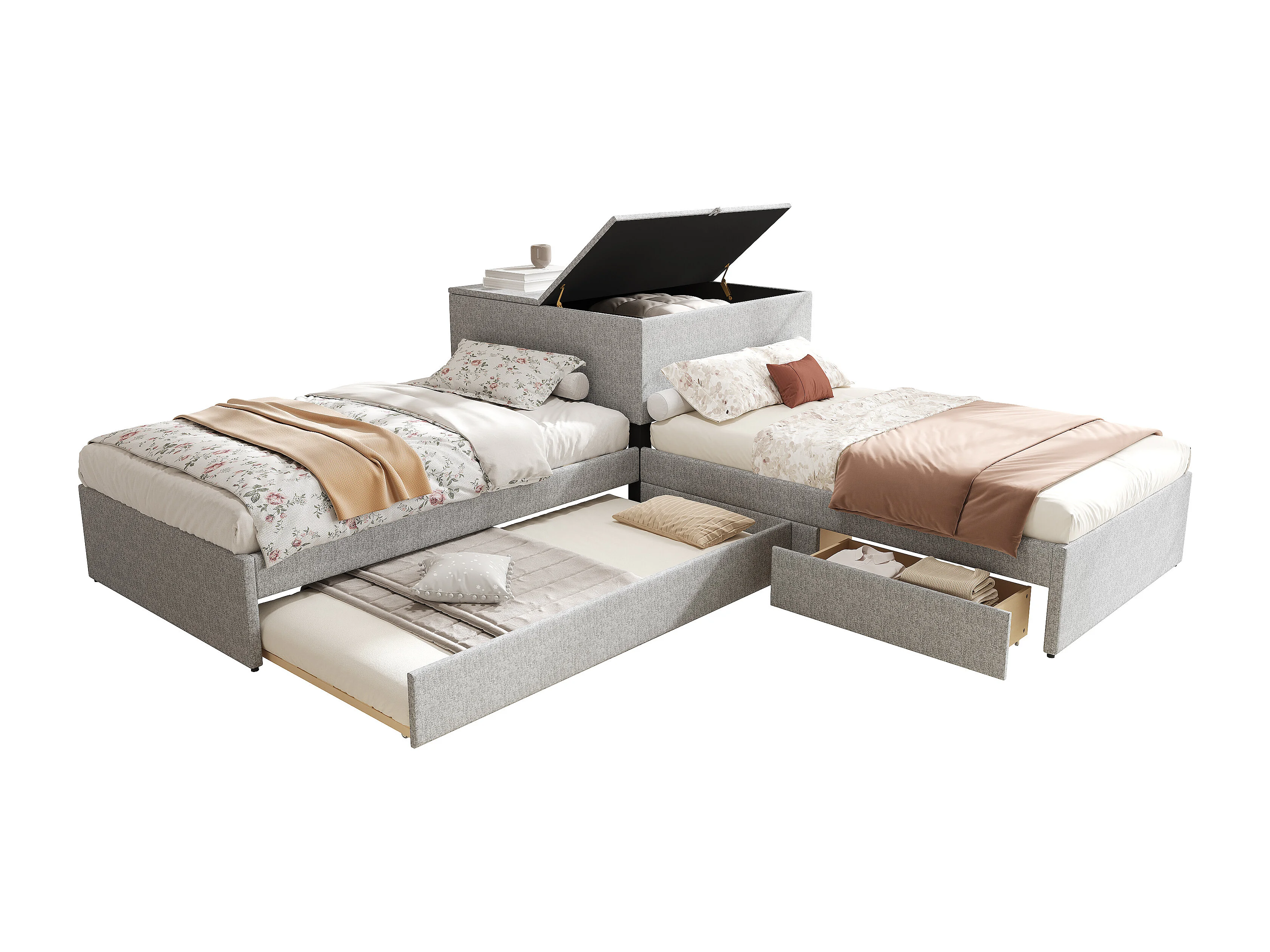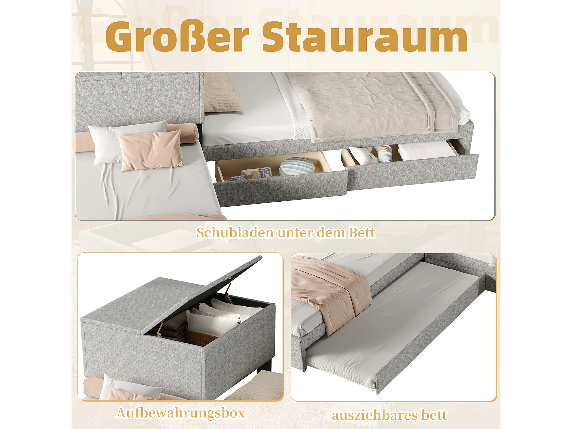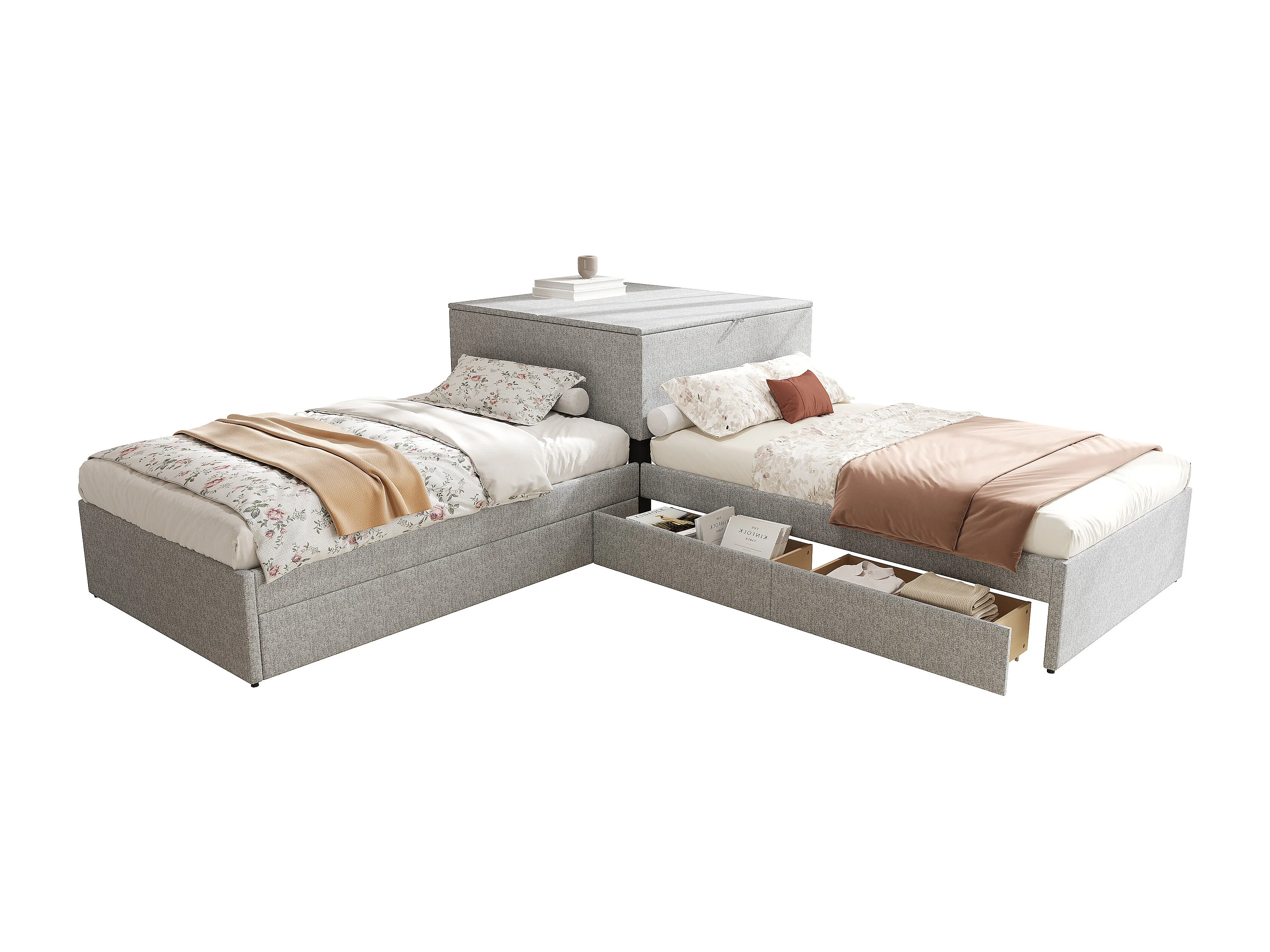 Lit d'angle avec lit tiroir, rangement intégré, lit fonctionnel, en lin gris (90x200 cm)