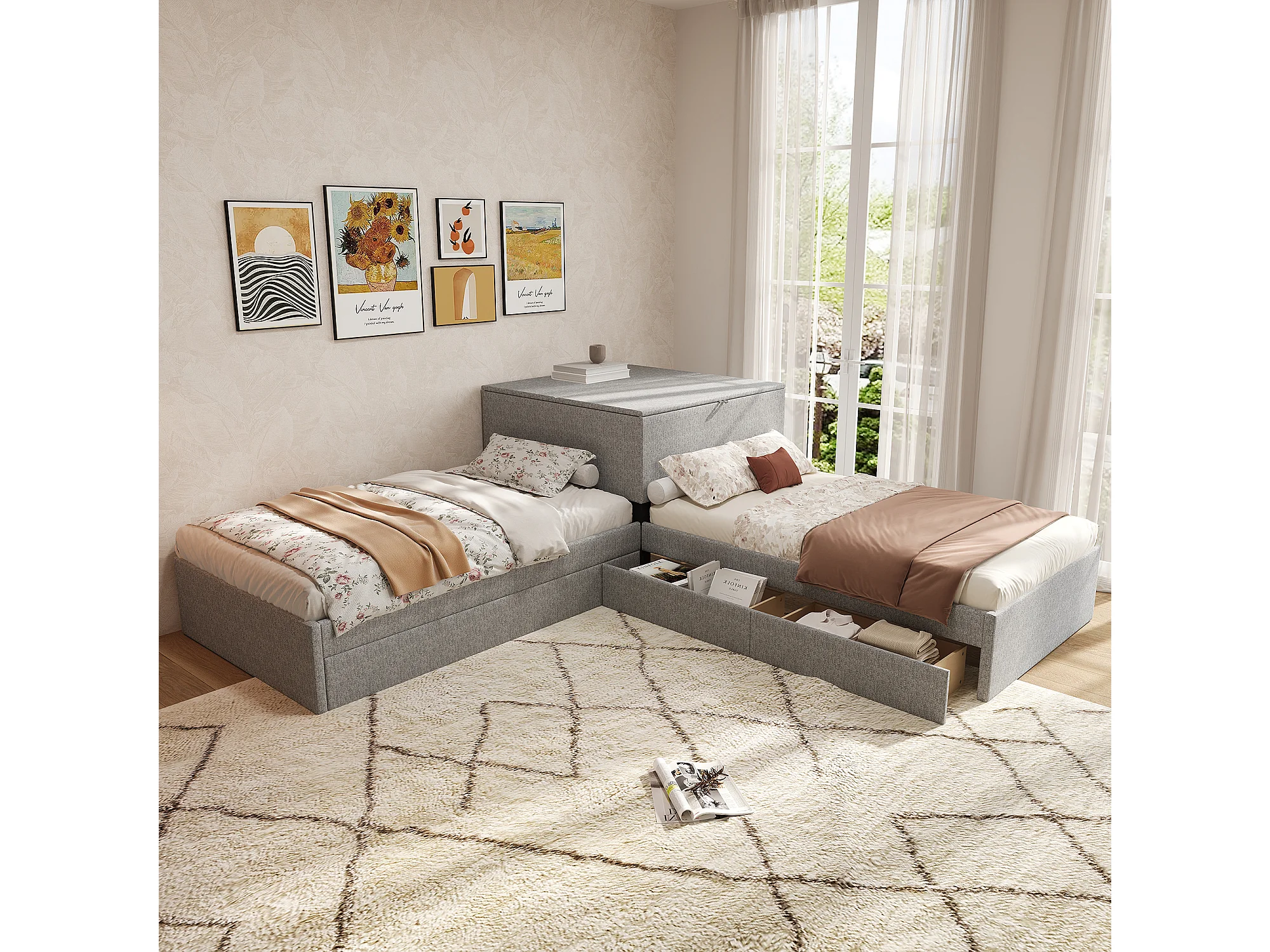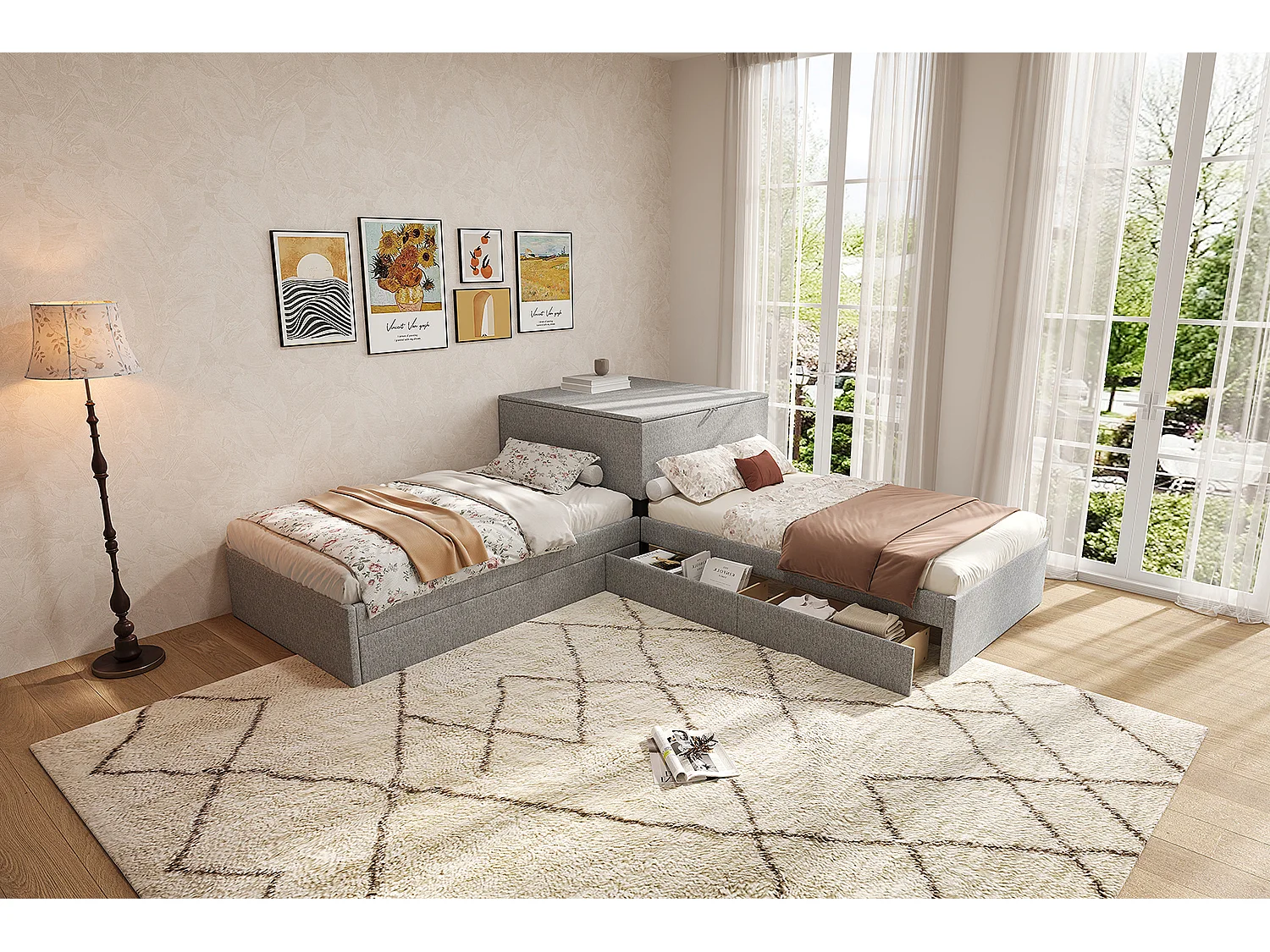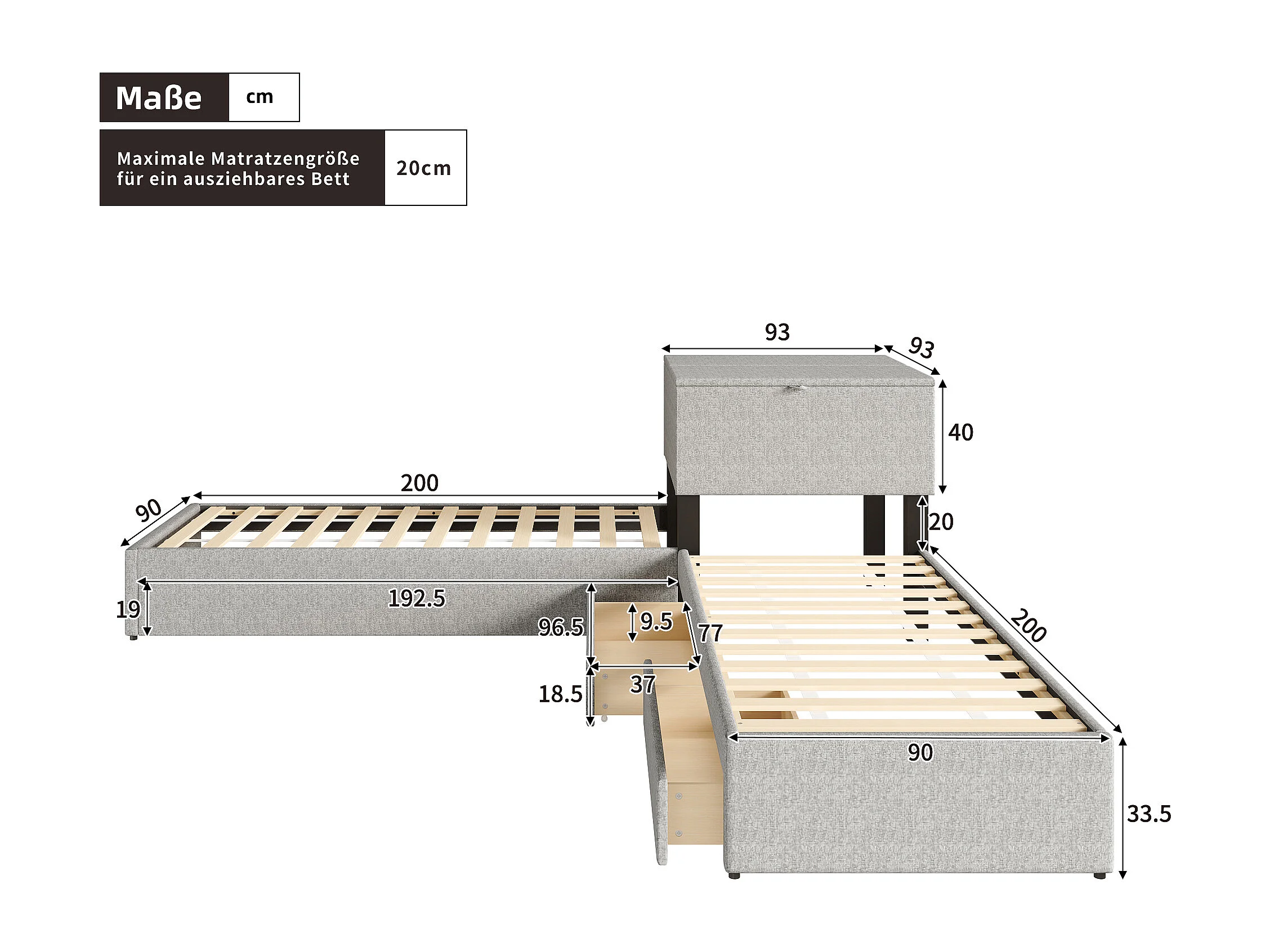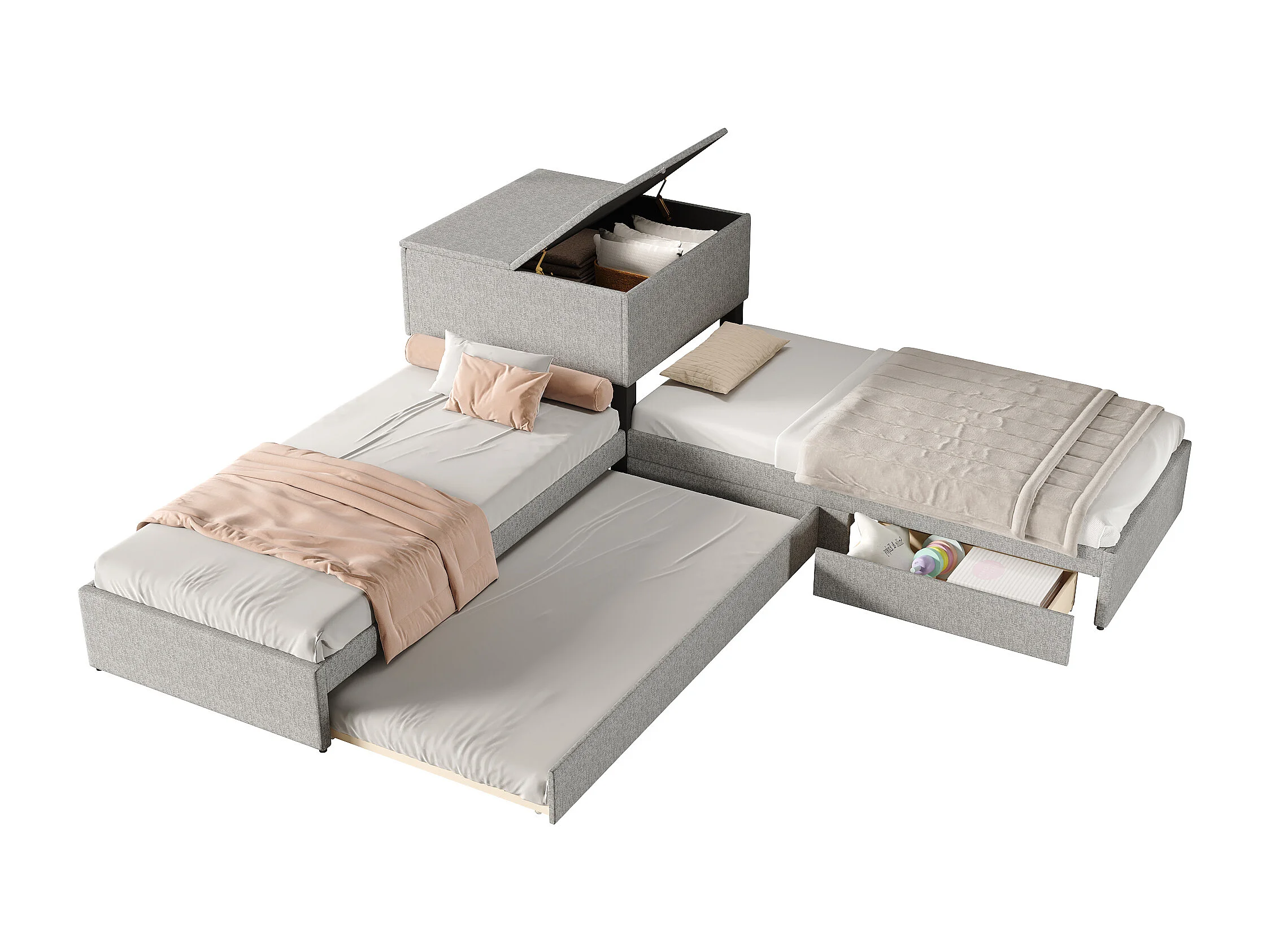 Lit d'angle avec lit tiroir, rangement intégré, lit fonctionnel, en lin gris (90x200 cm)