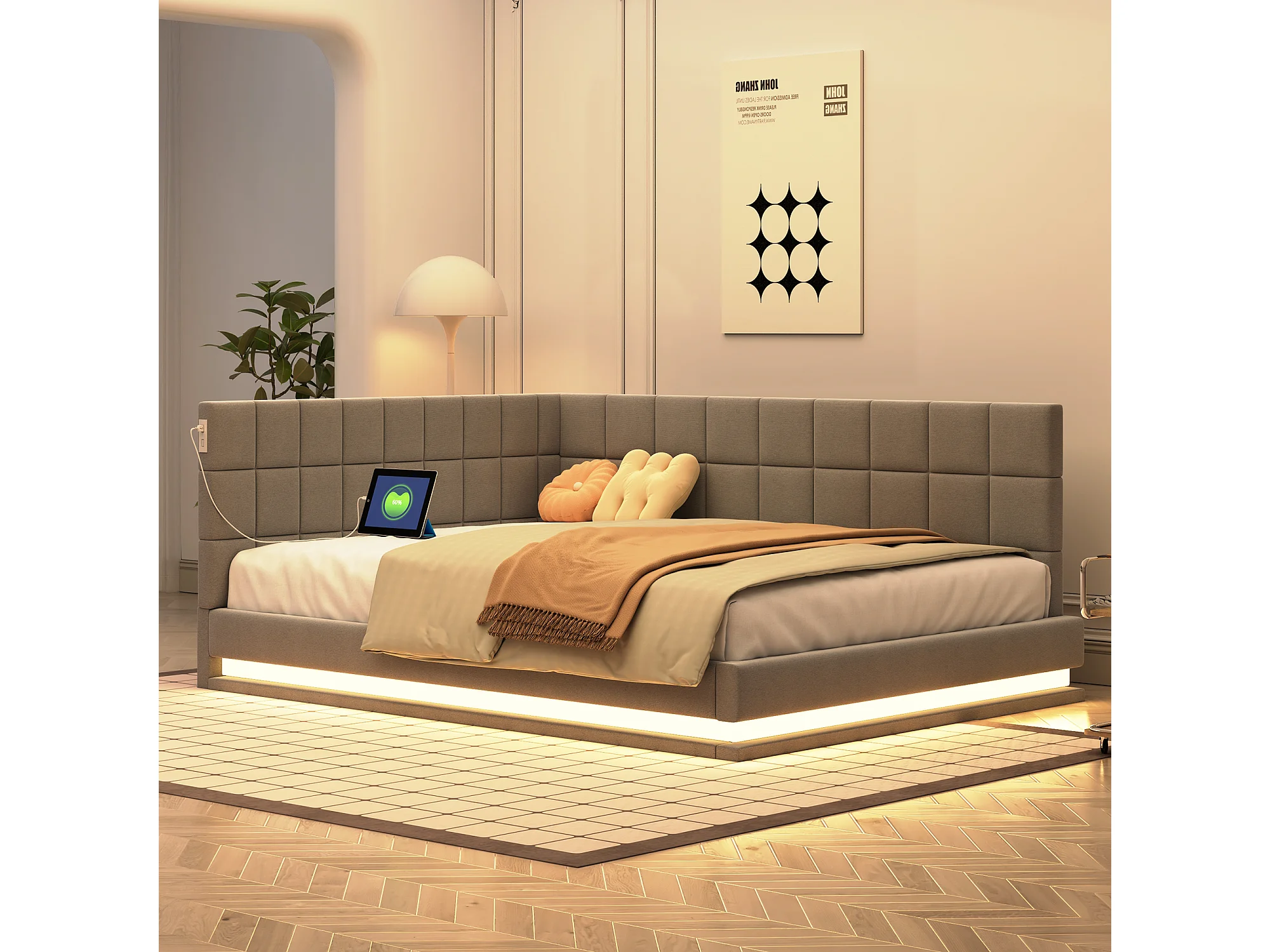 Lit d'appoint 140×200 cm en velours gris avec éclairage LED et prise USB, sommier à lattes inclus