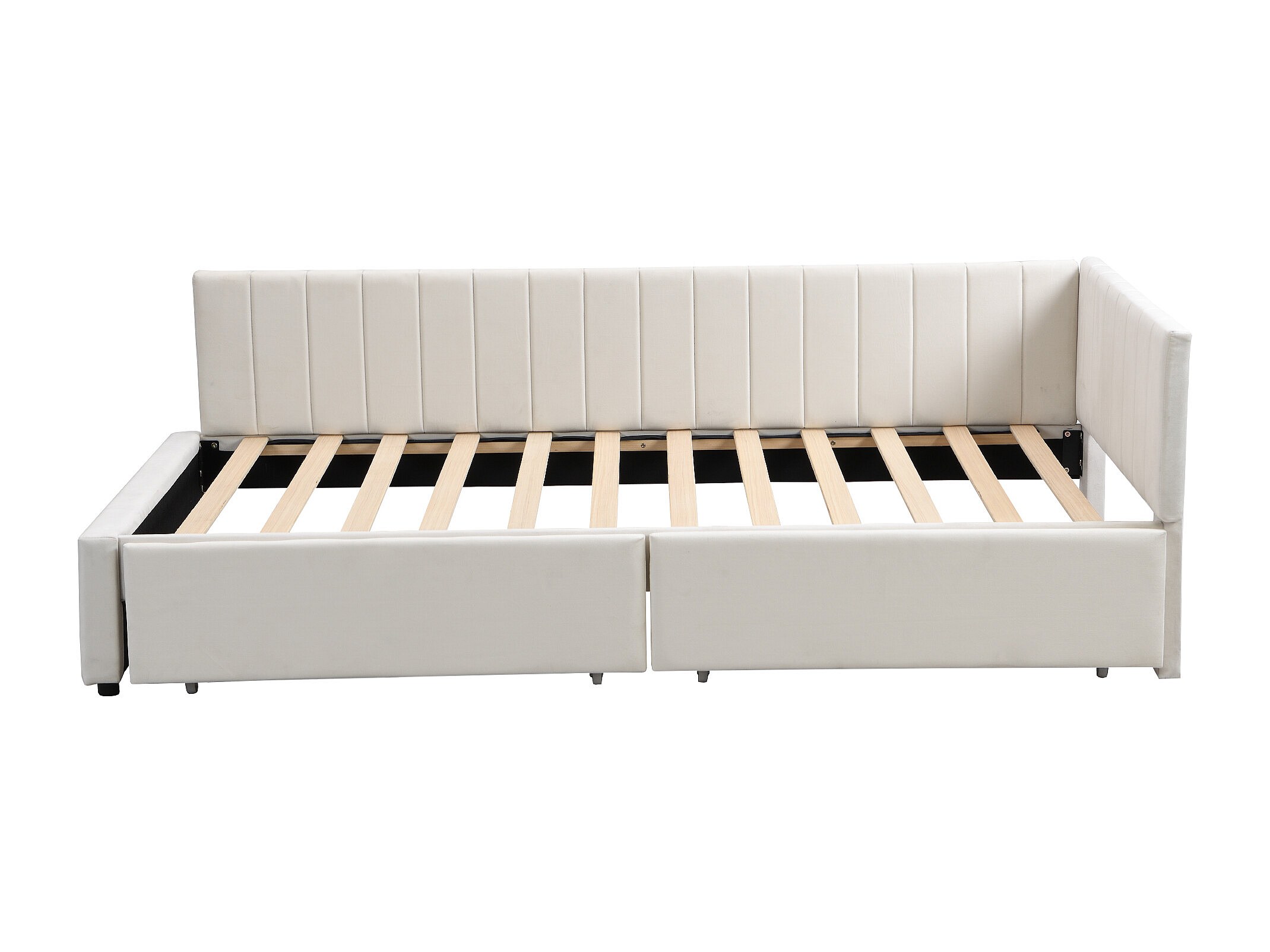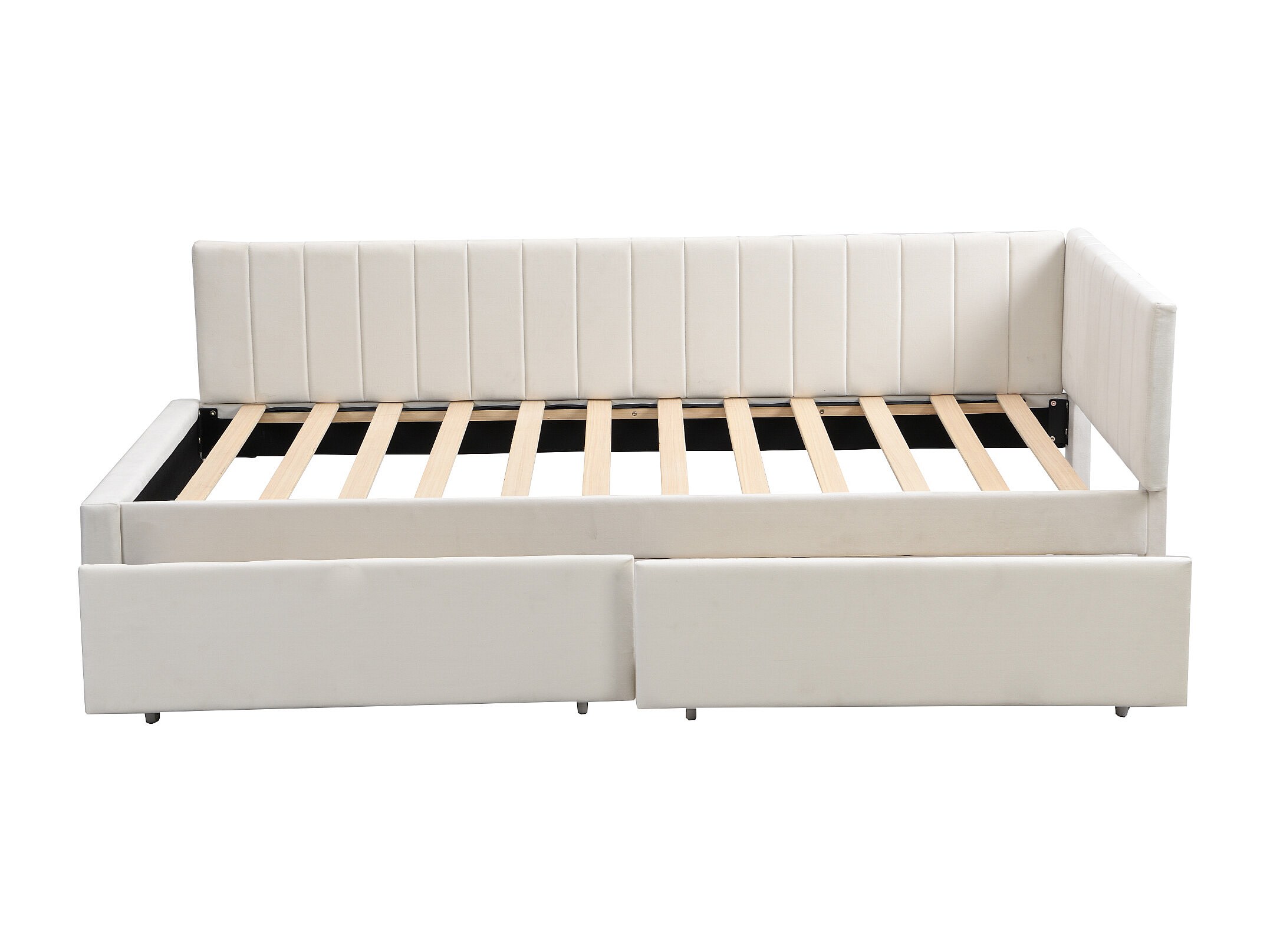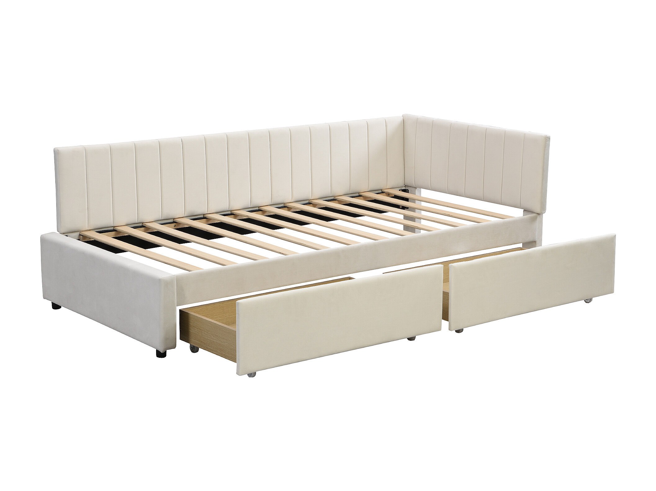 Lit d'appoint en velours beige 90×200 cm avec 2 tiroirs de rangement et sommier à lattes