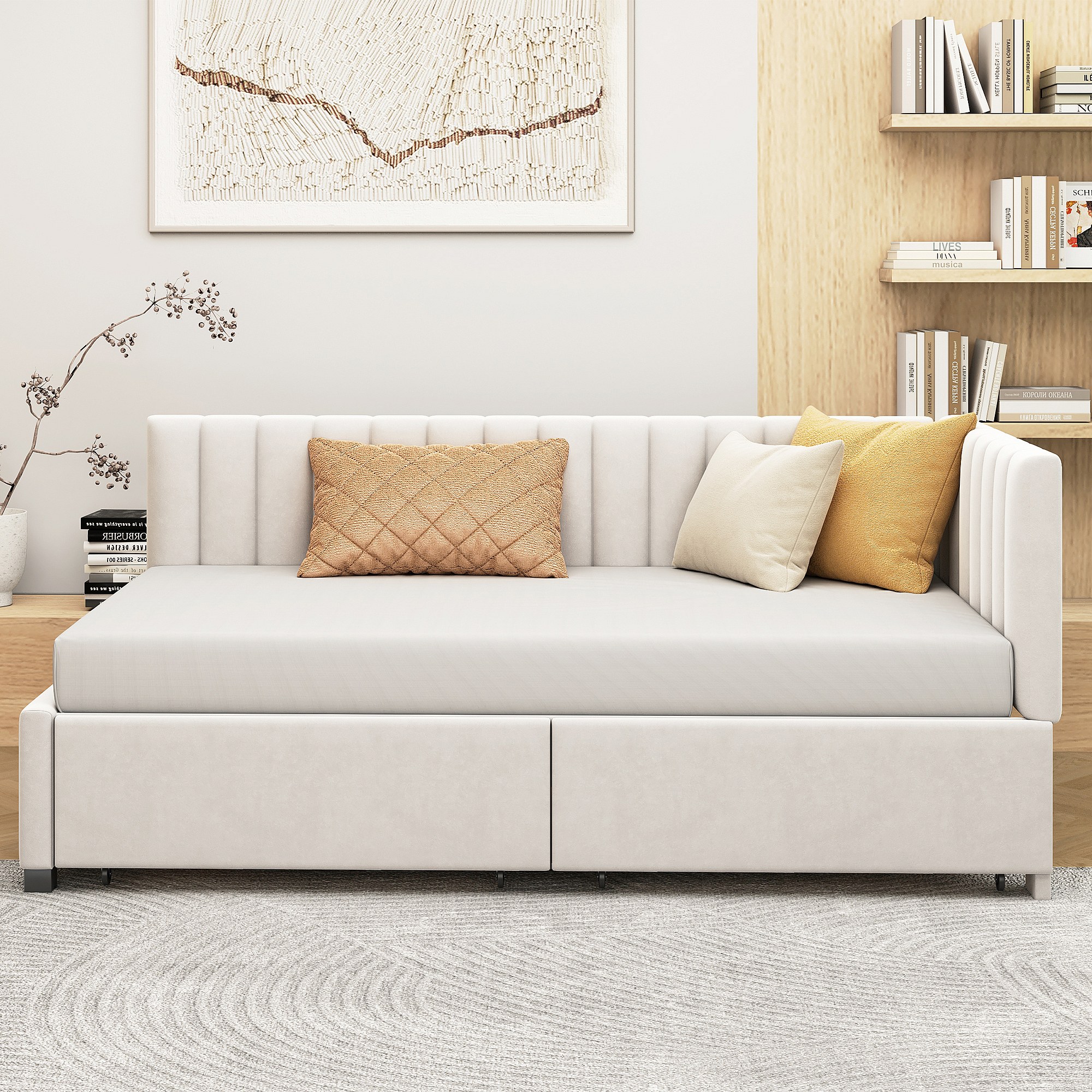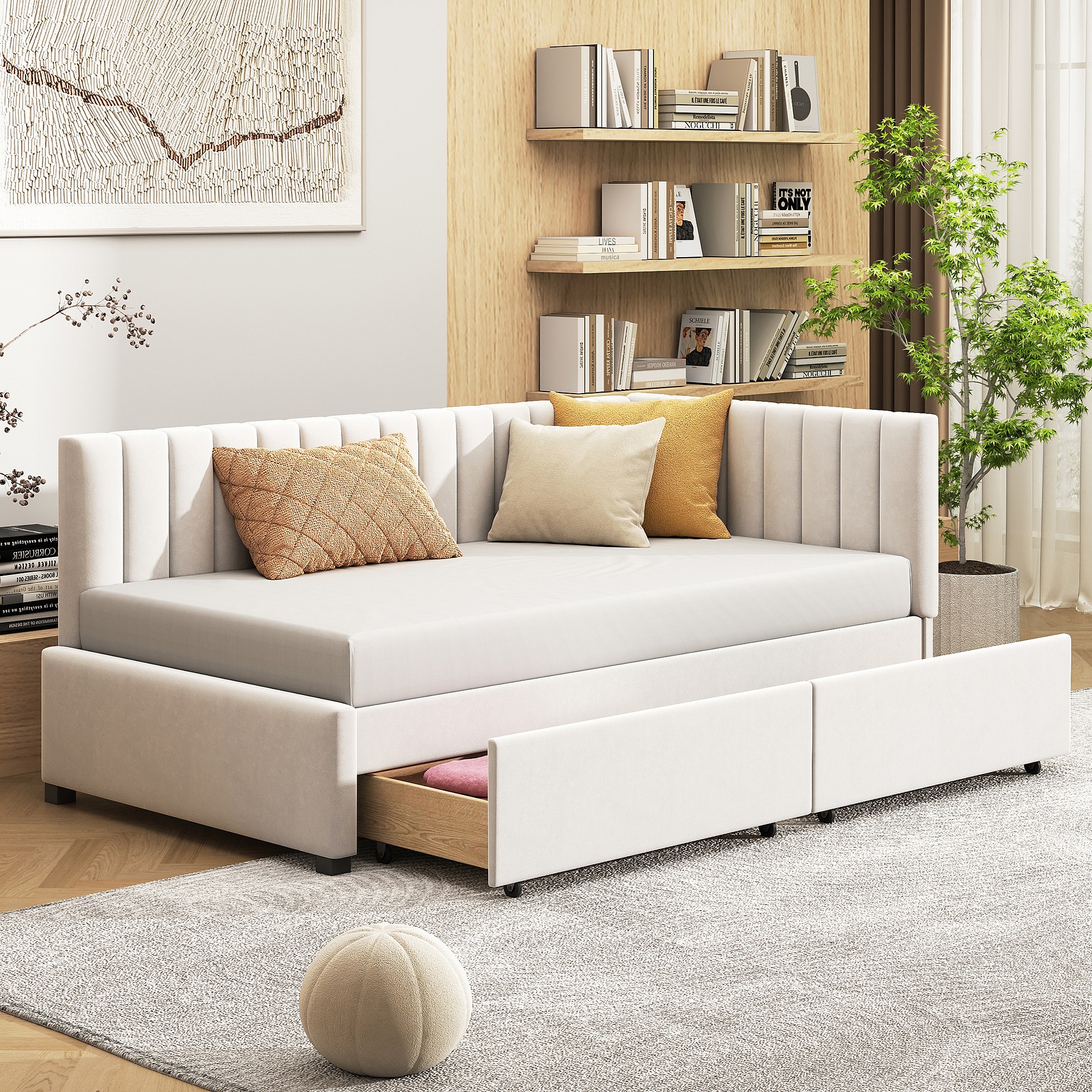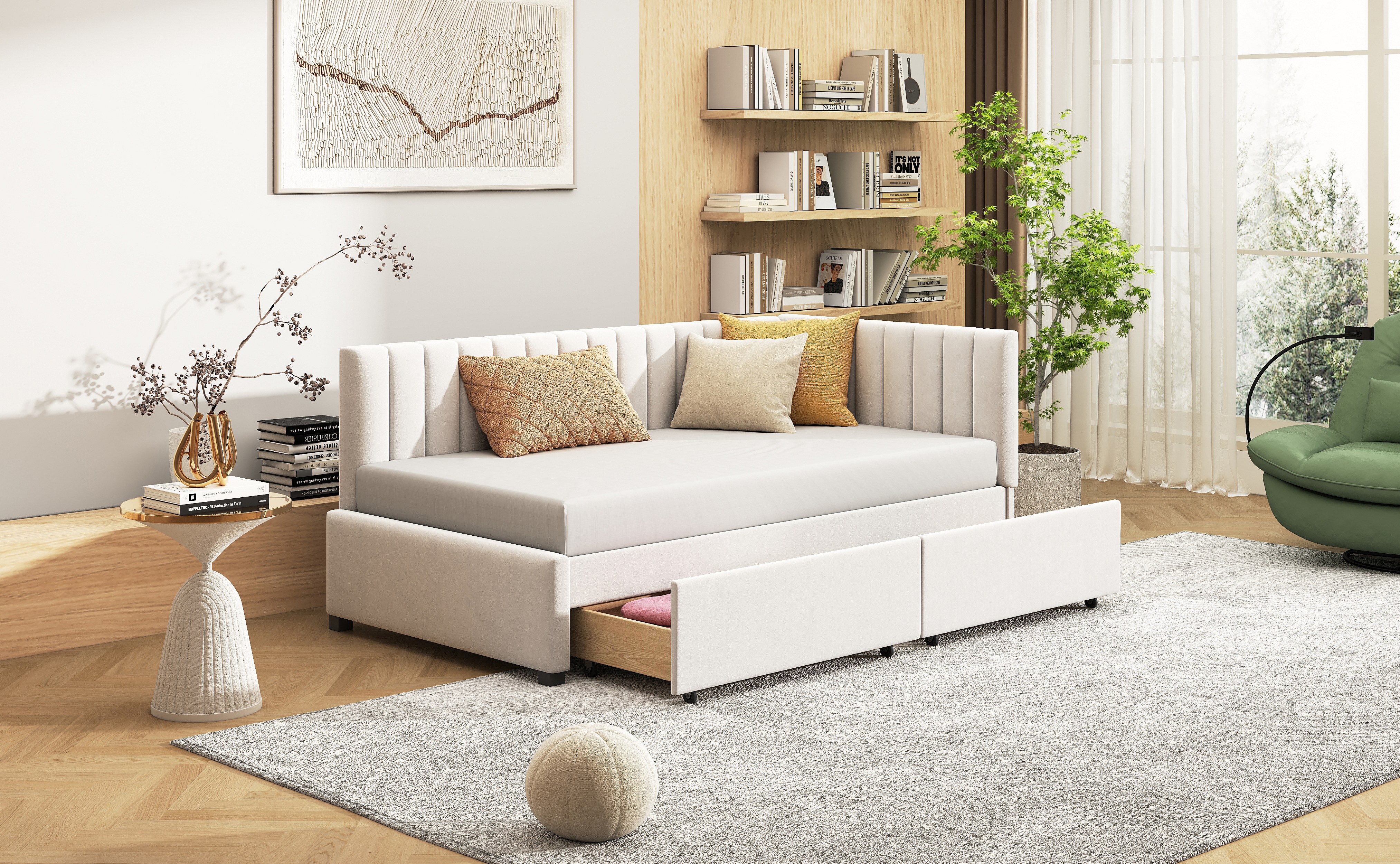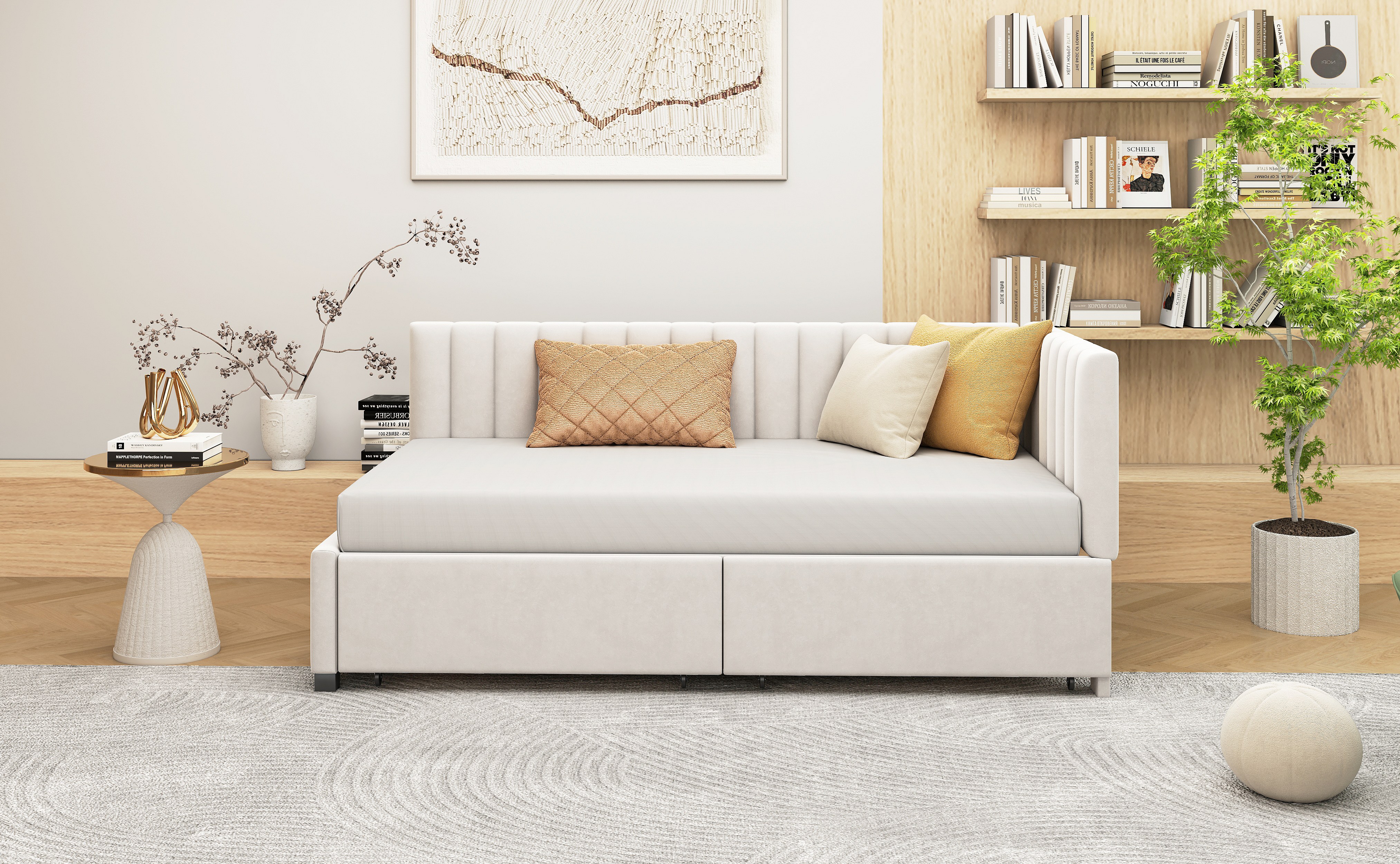 Lit d'appoint en velours beige 90×200 cm avec 2 tiroirs de rangement et sommier à lattes