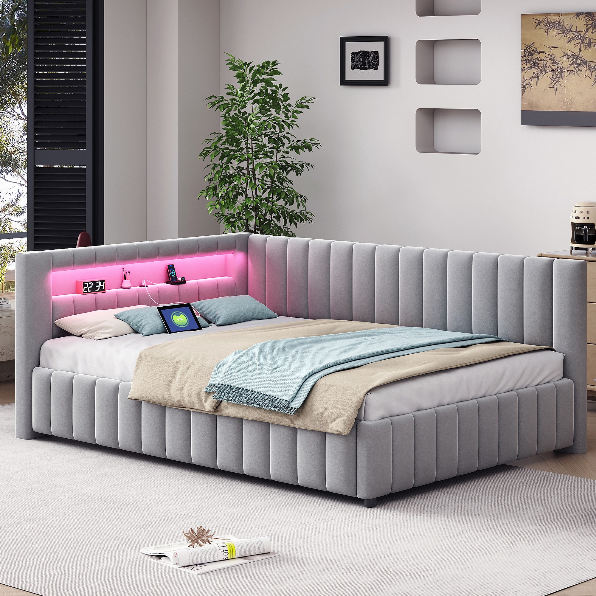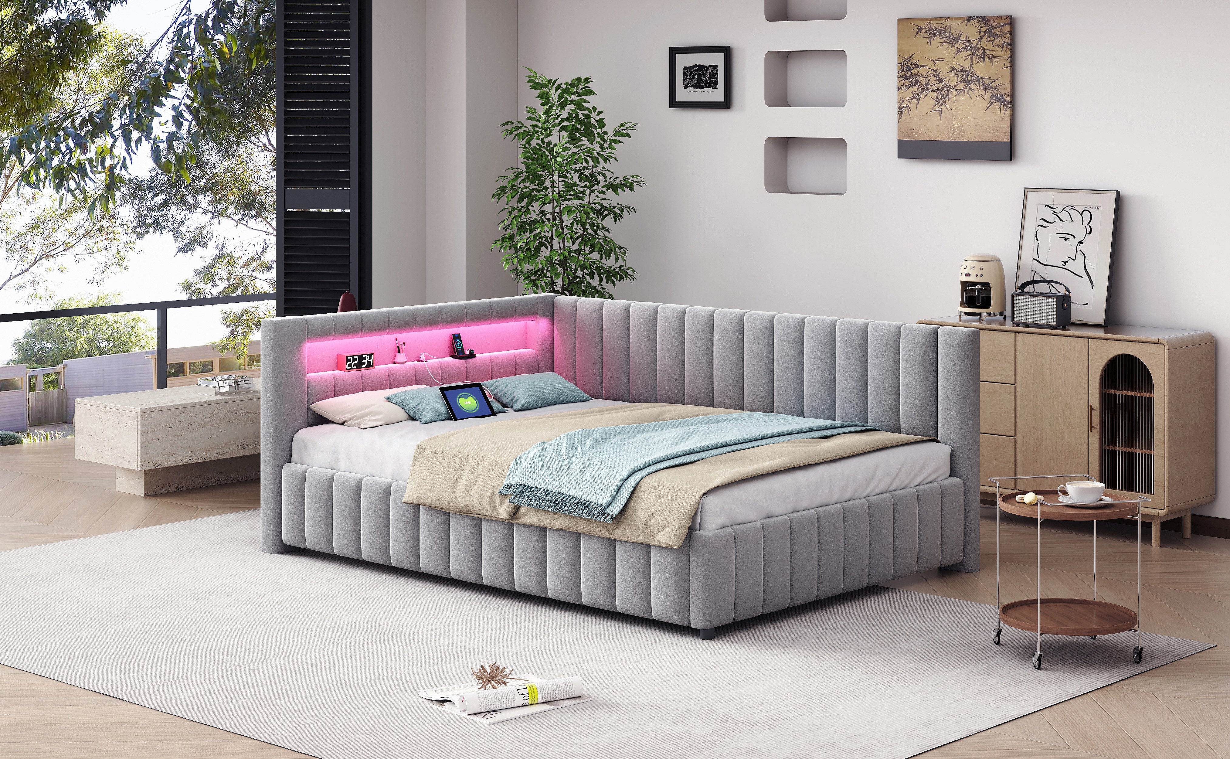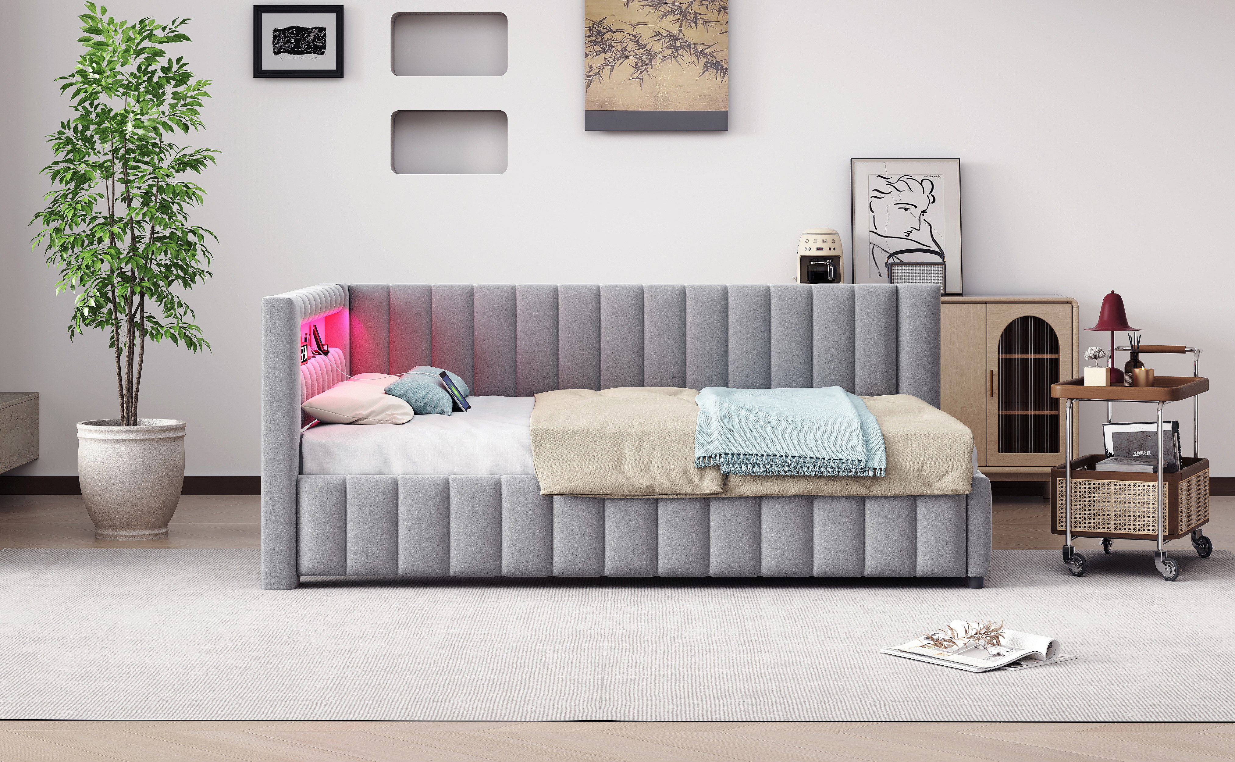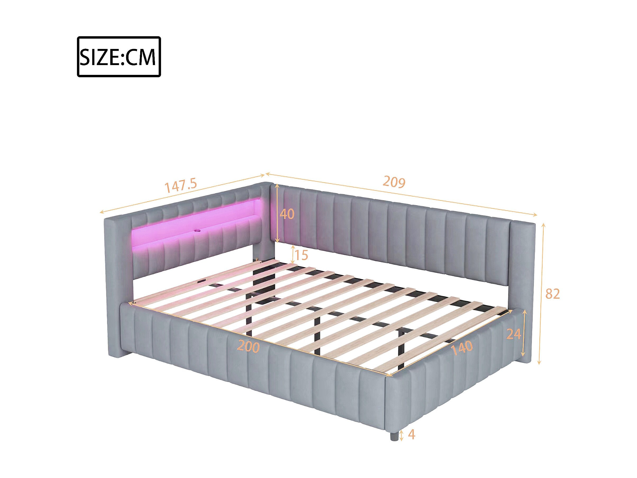 Lit d'appoint L en velours 140x200 cm avec éclairage LED et port USB, gris, confortable et pratique