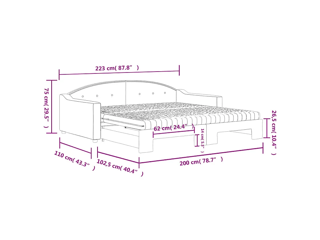 Lit de jour avec gigogne et matelas gris clair 100x200 cm tissu