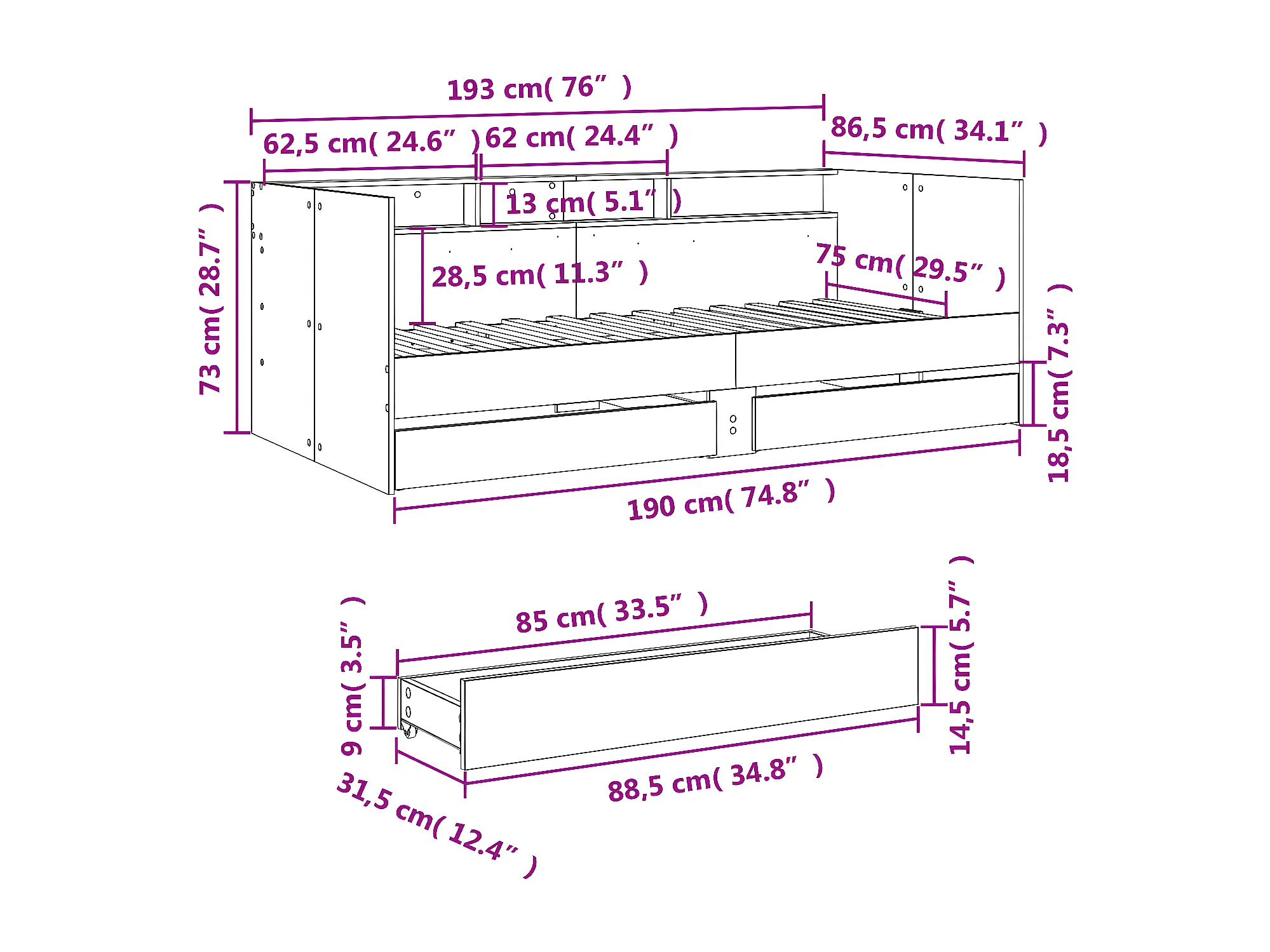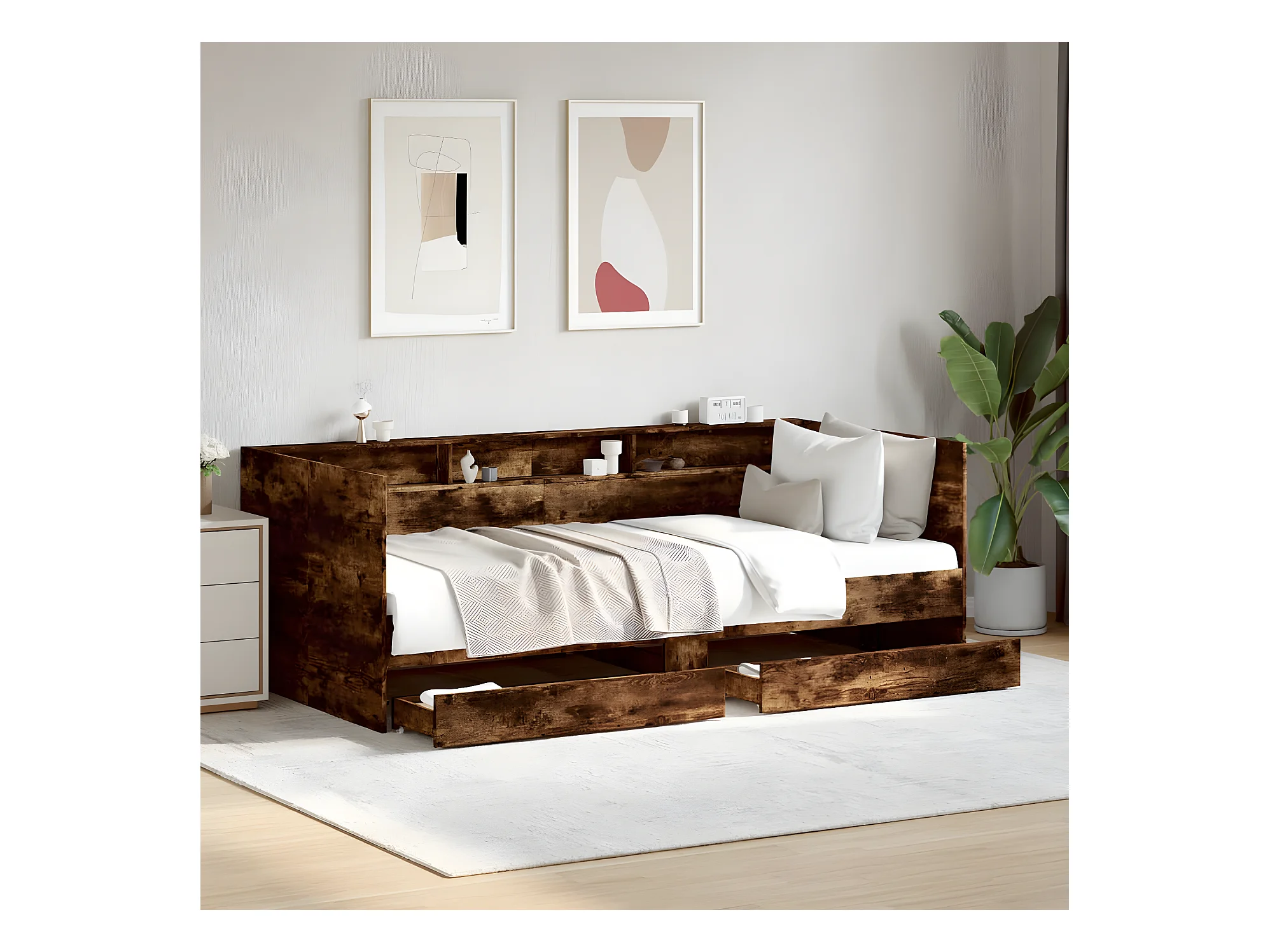 Lit de jour et tiroirs chêne fumé 75x190 cm bois d'ingénierie