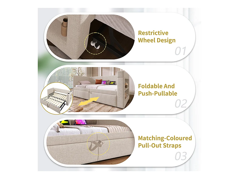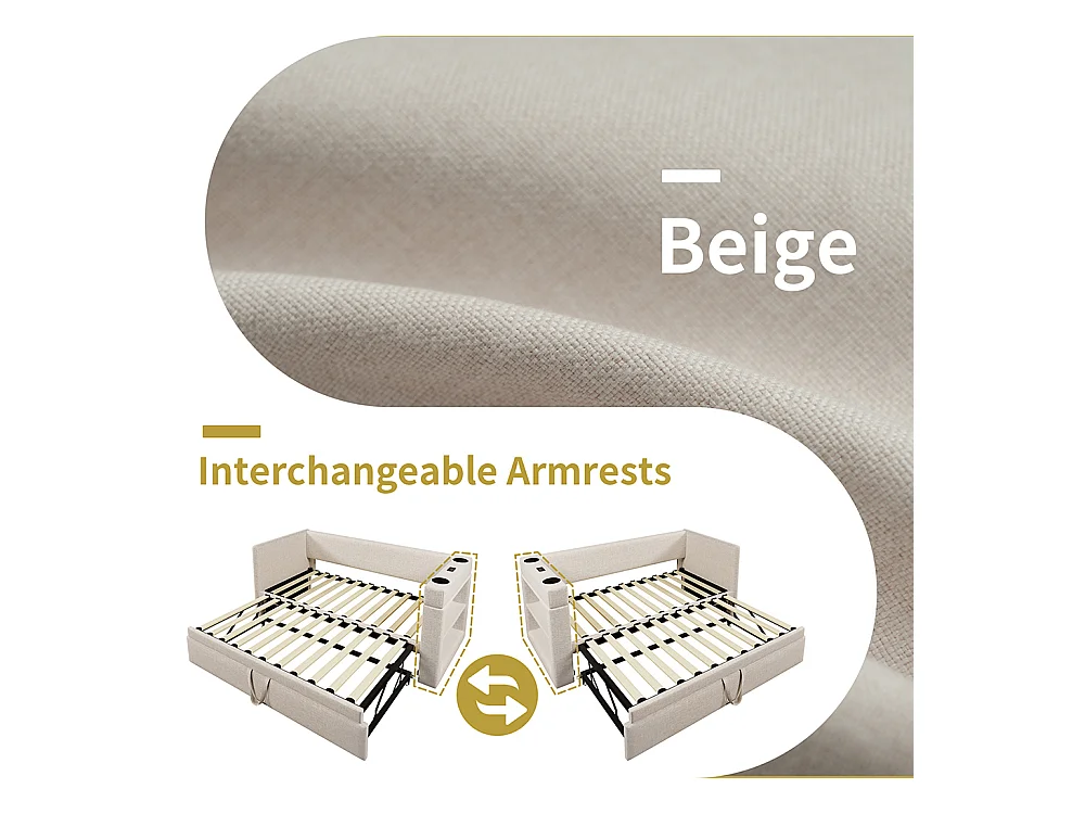 Lit de repos rembourré 90x200 cm, canapé-lit simple avec lit gigogne, mélange de lin, beige, sans matelas.