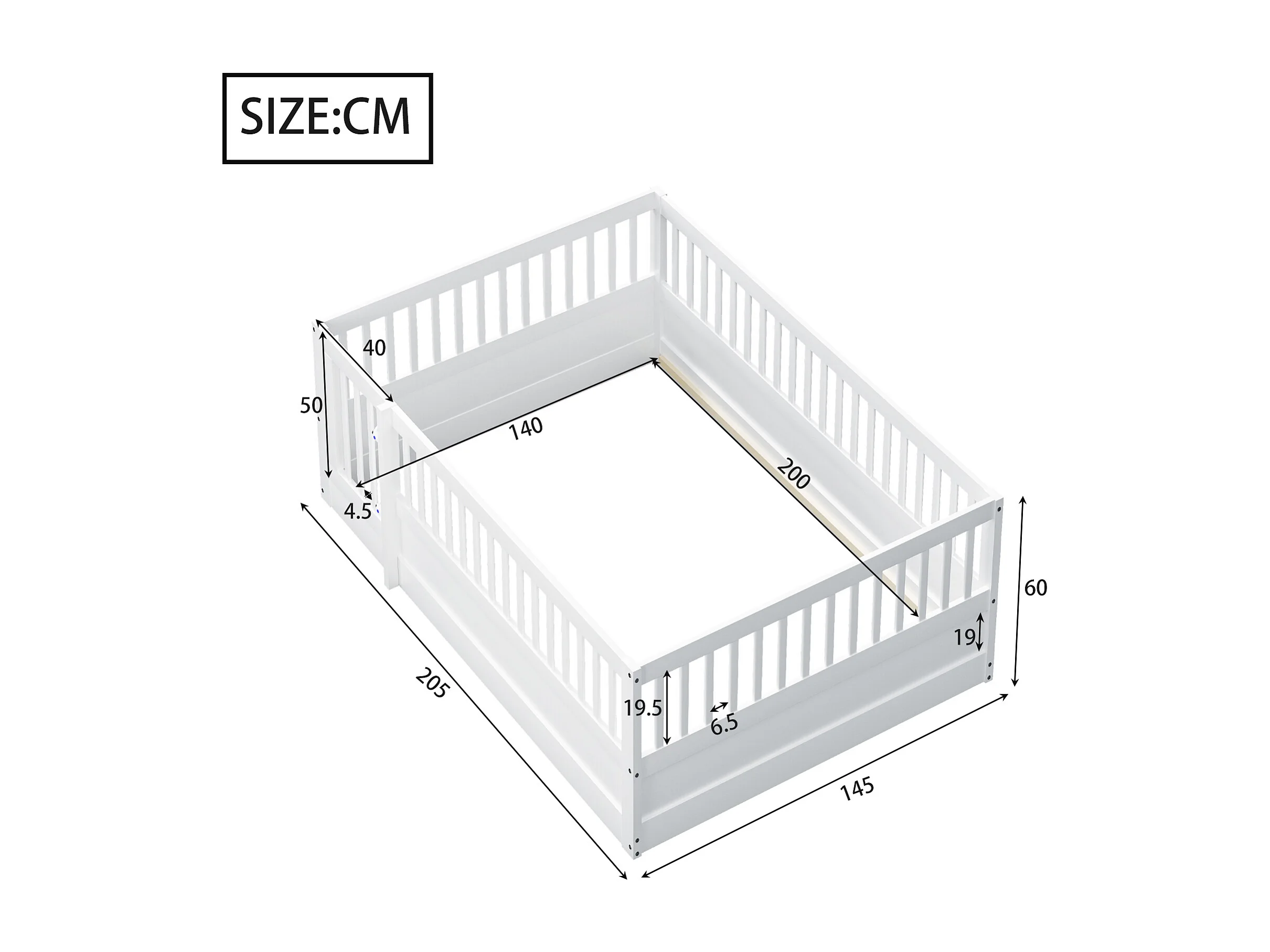 Lit d'enfant - 140 x 200 cm - Lit de Sol avec Porte - pour Fille et garçon - Blanc