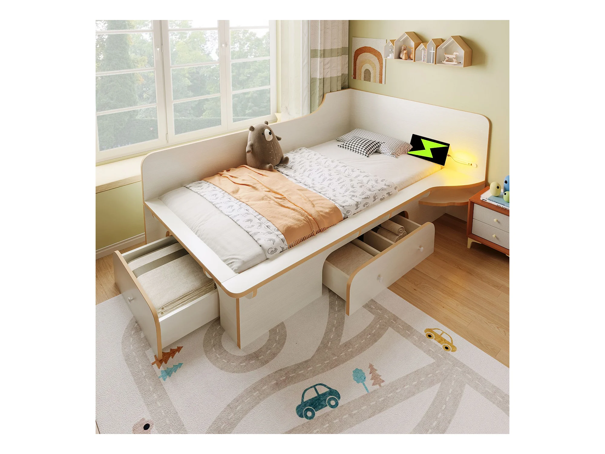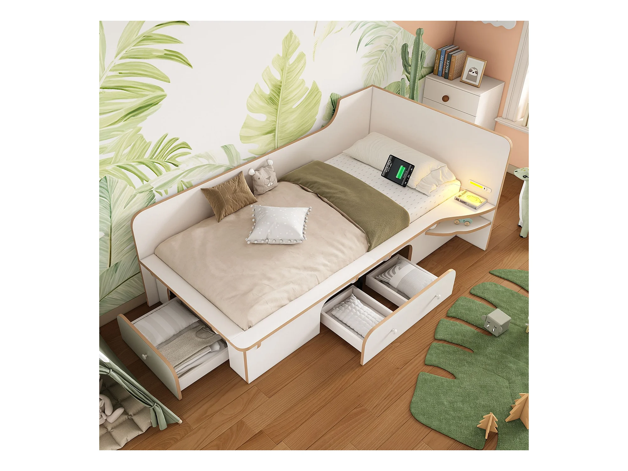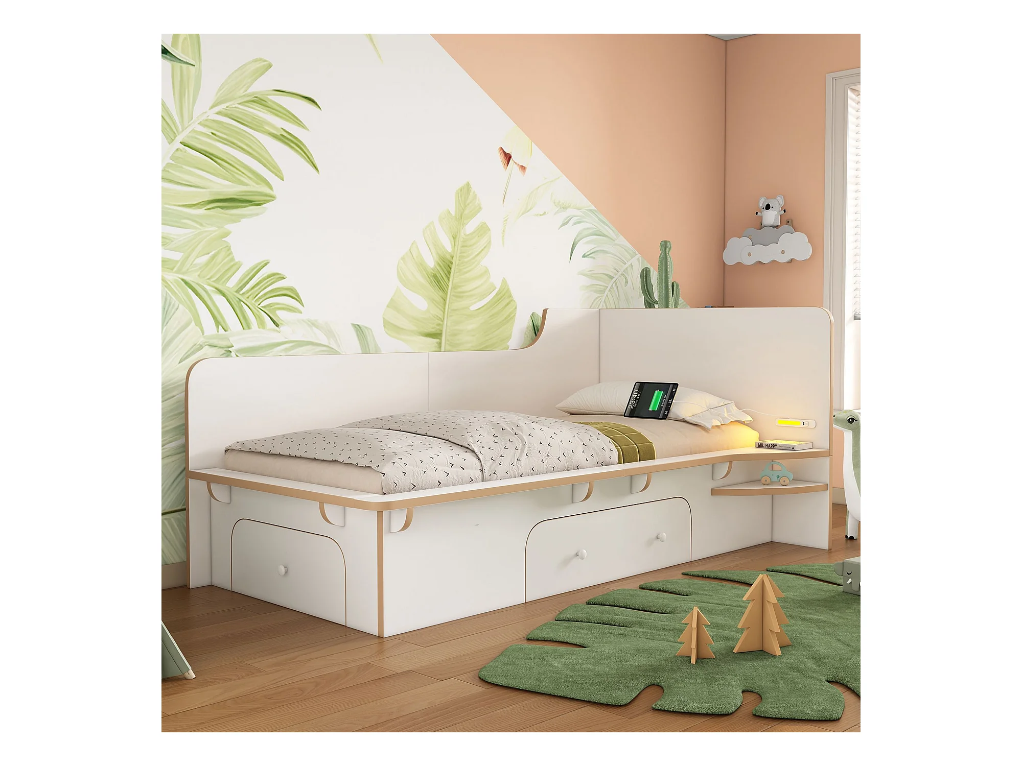 Lit d'enfant 90 x 200 cm, avec liseuse, USB, prise C et 3 tiroirs, design antidérapant, blanc