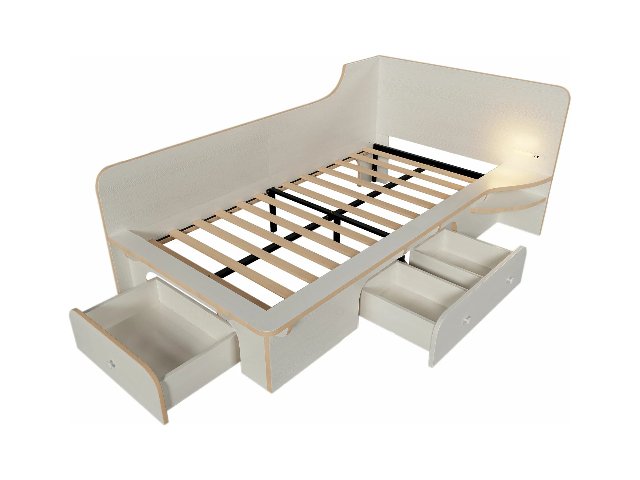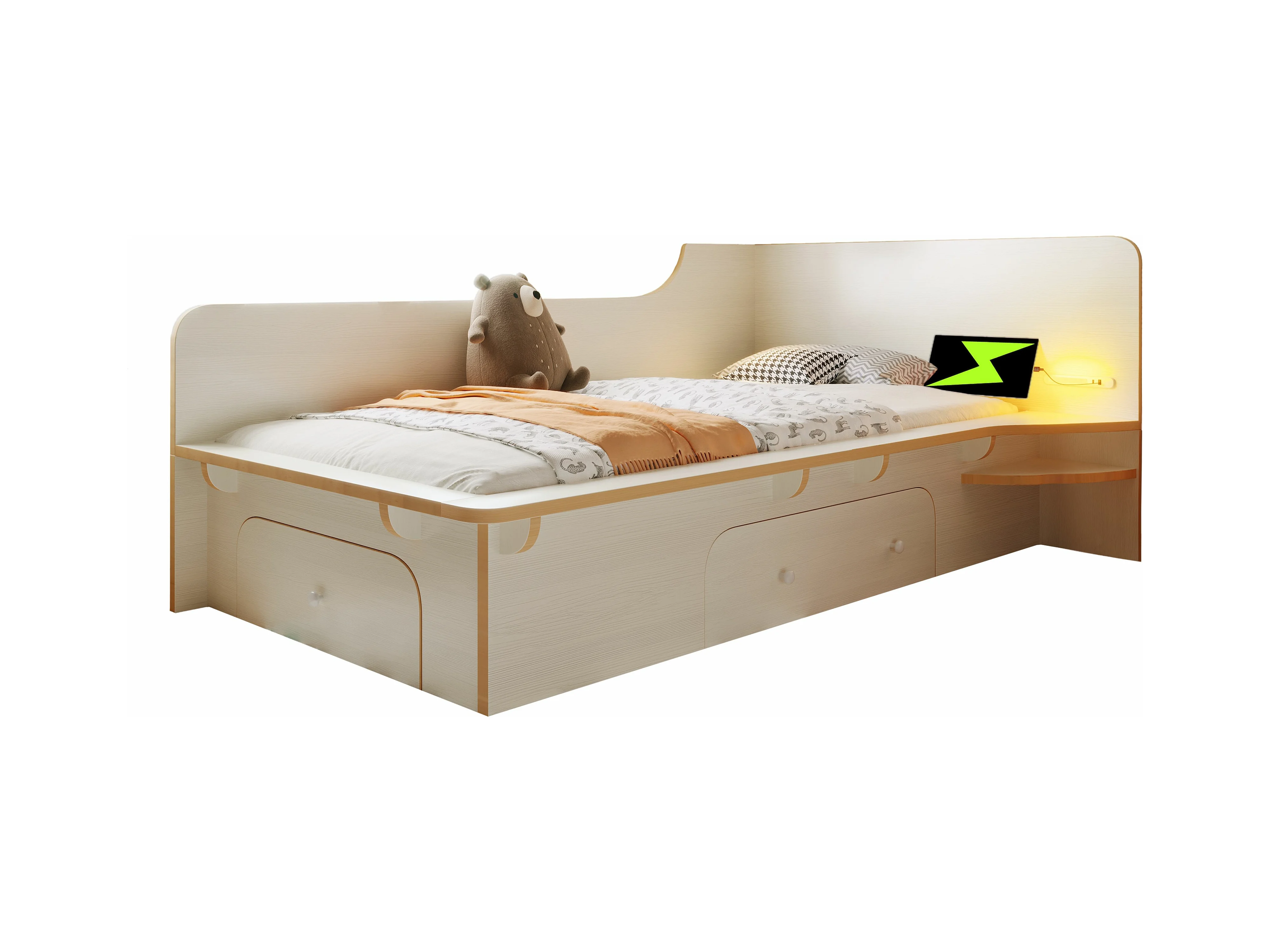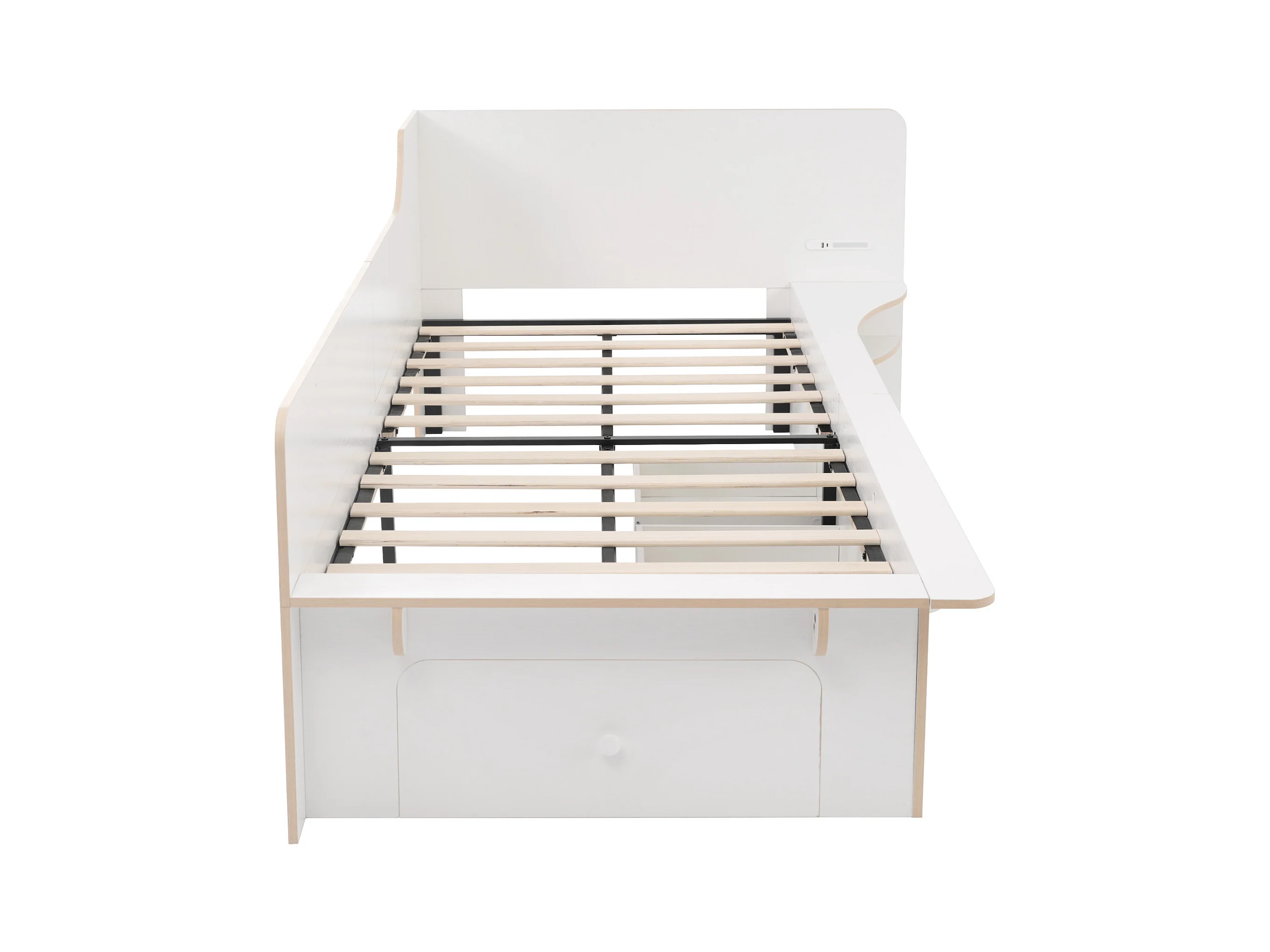 Lit d'enfant 90 x 200 cm, avec liseuse, USB, prise C et 3 tiroirs, design antidérapant, blanc