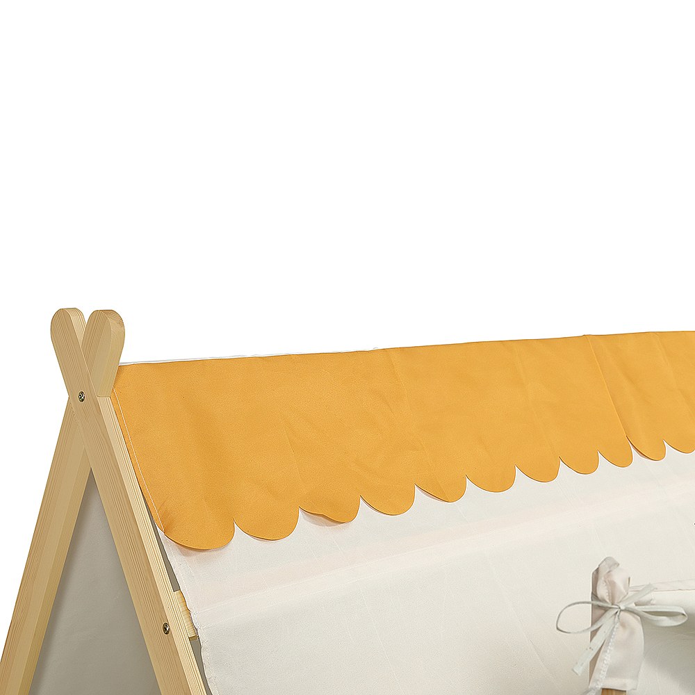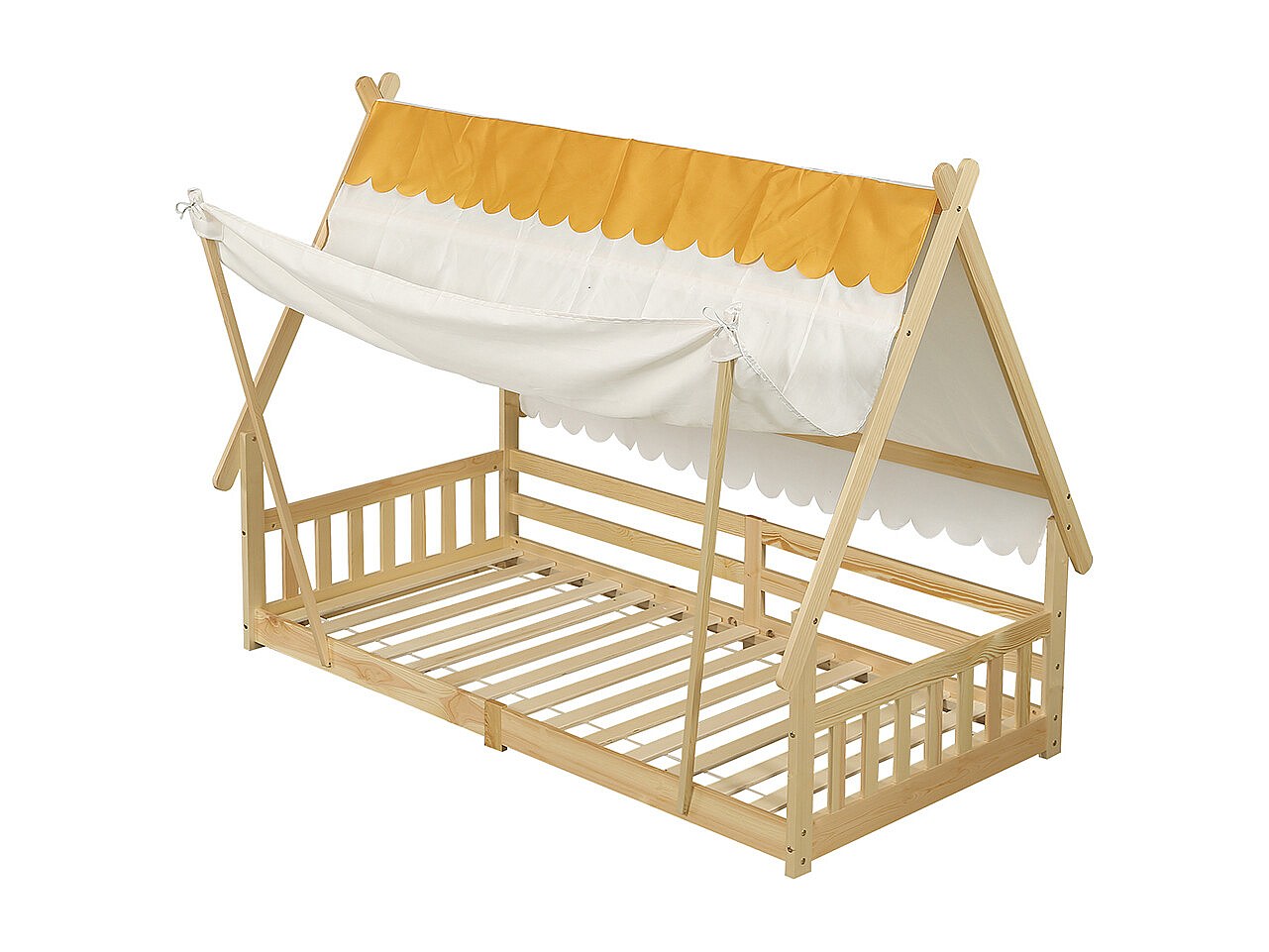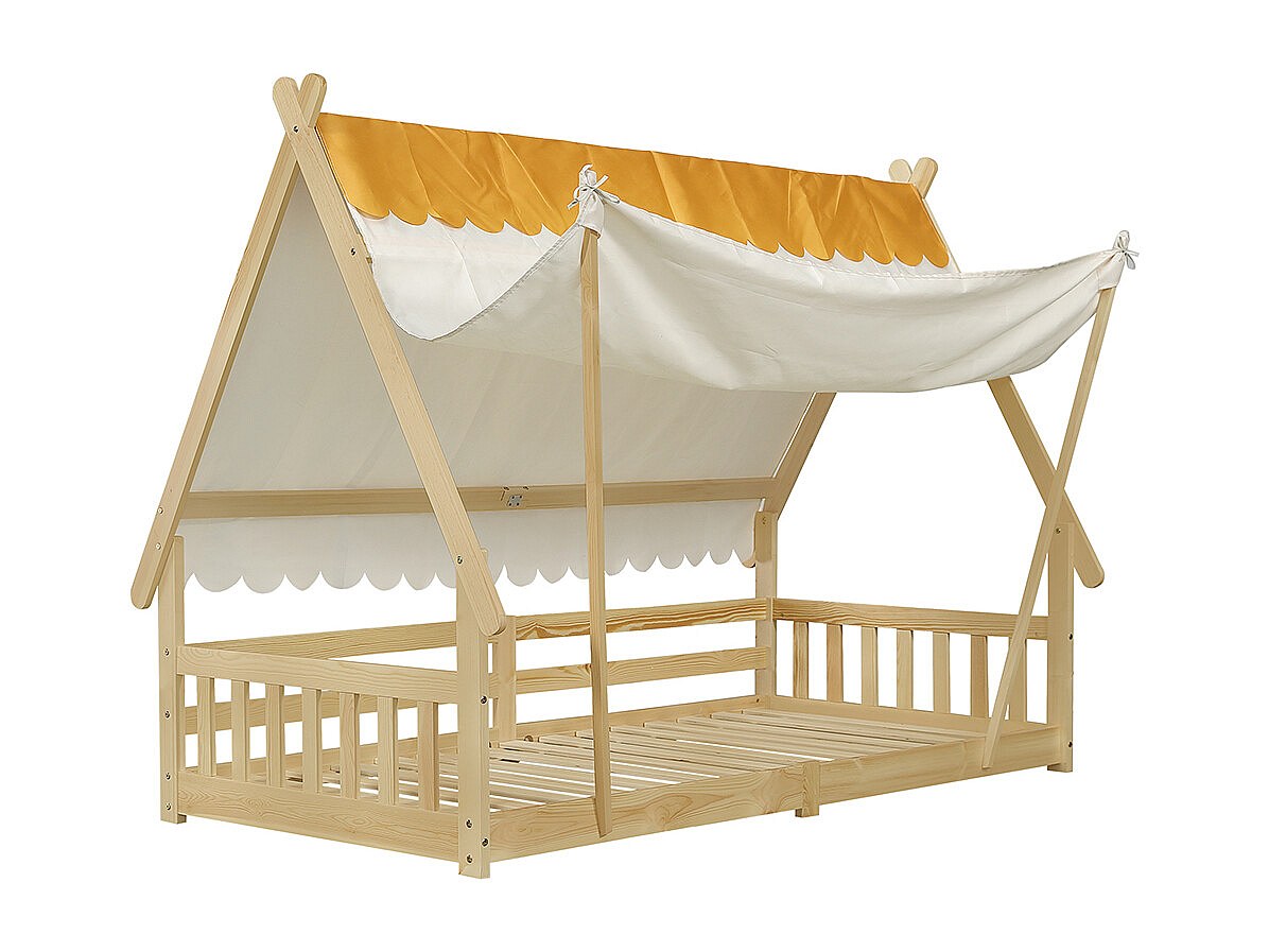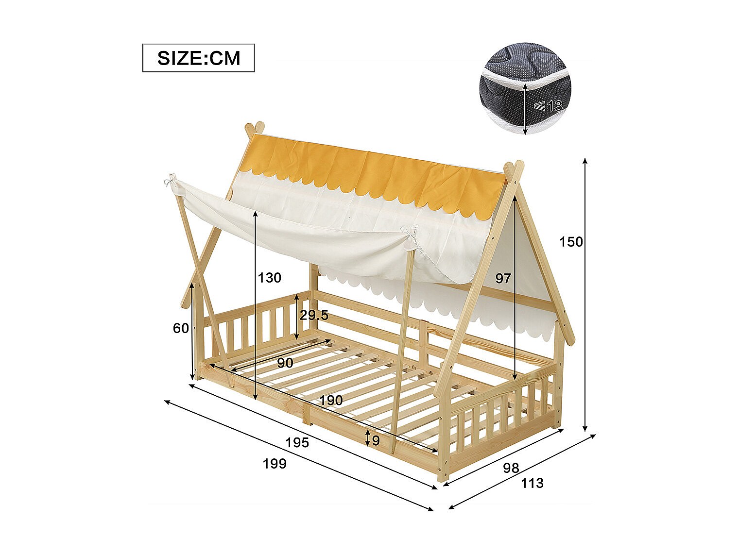 Lit d'enfant 90x190cm, design en forme de cabane, tente amovible, avec barrières de sécurité, pin + contreplaqué, couleur naturelle
