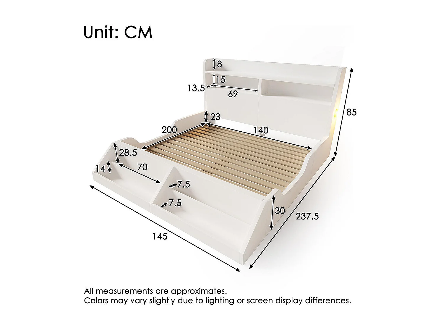 Lit d'enfant avec espace de rangement, veilleuse, bibliothèque amovible, surface blanc pur, bois, blanc - 140x200 cm