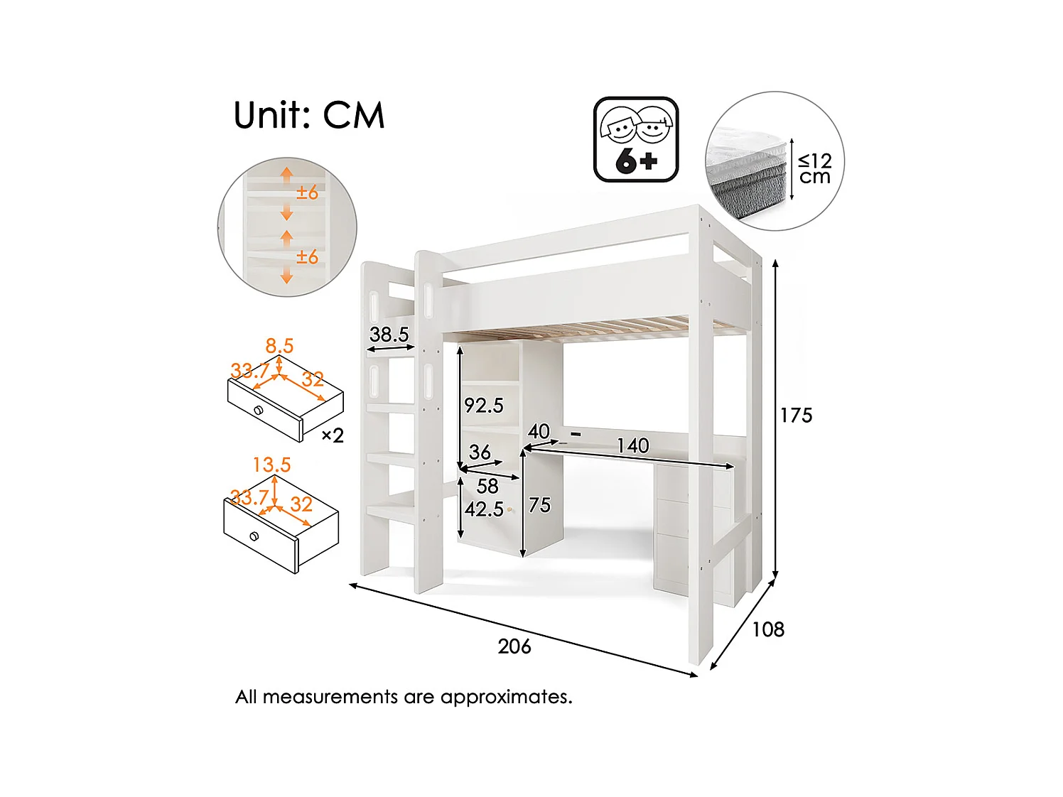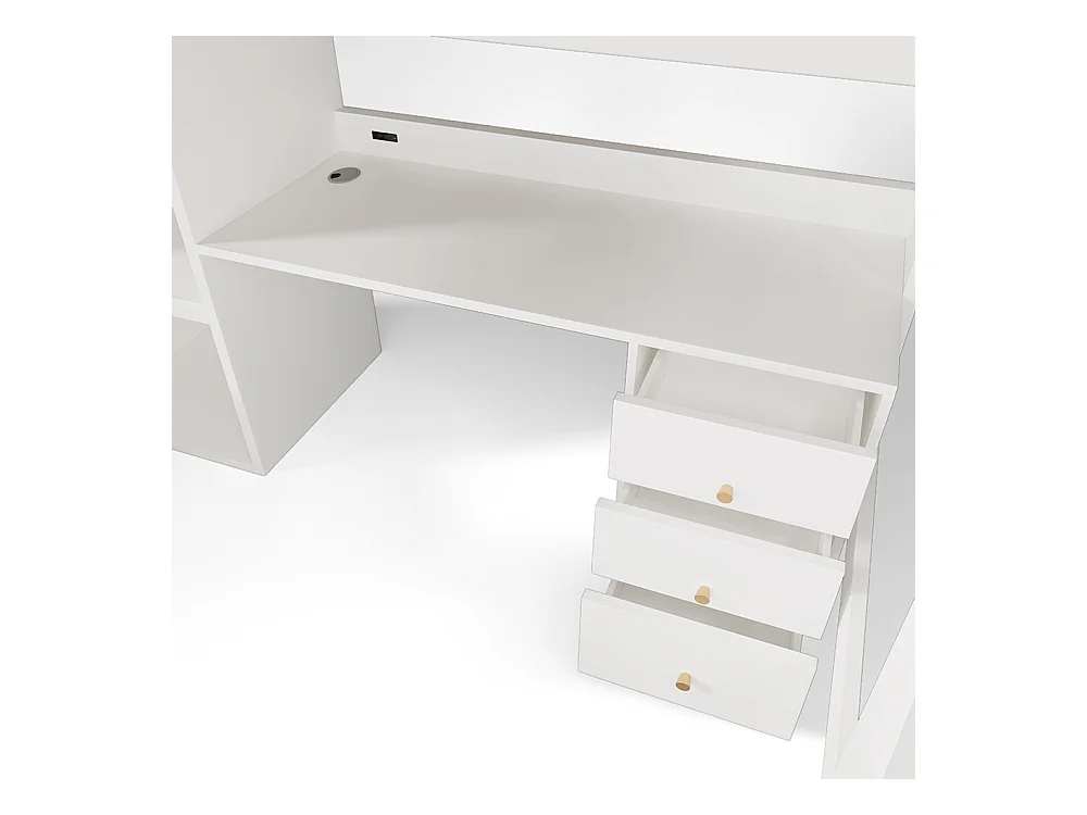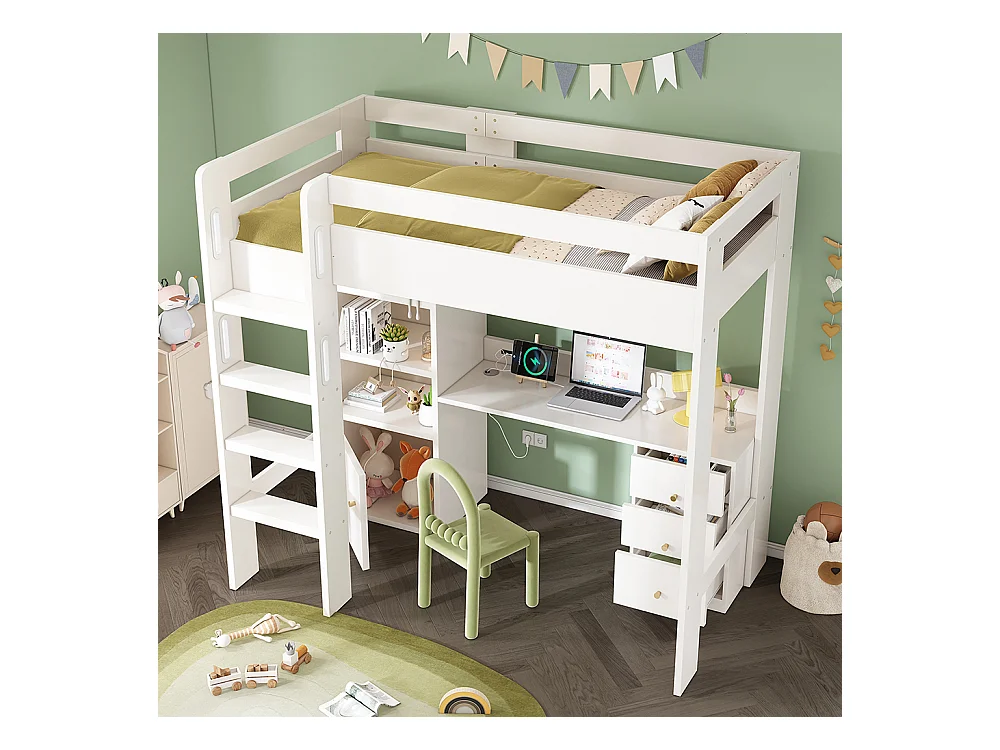 Lit d'enfant en mezzanine avec bureau USB-C, armoire et classeur avec escalier et sommier à lattes, 90 x 200, sans matelas.