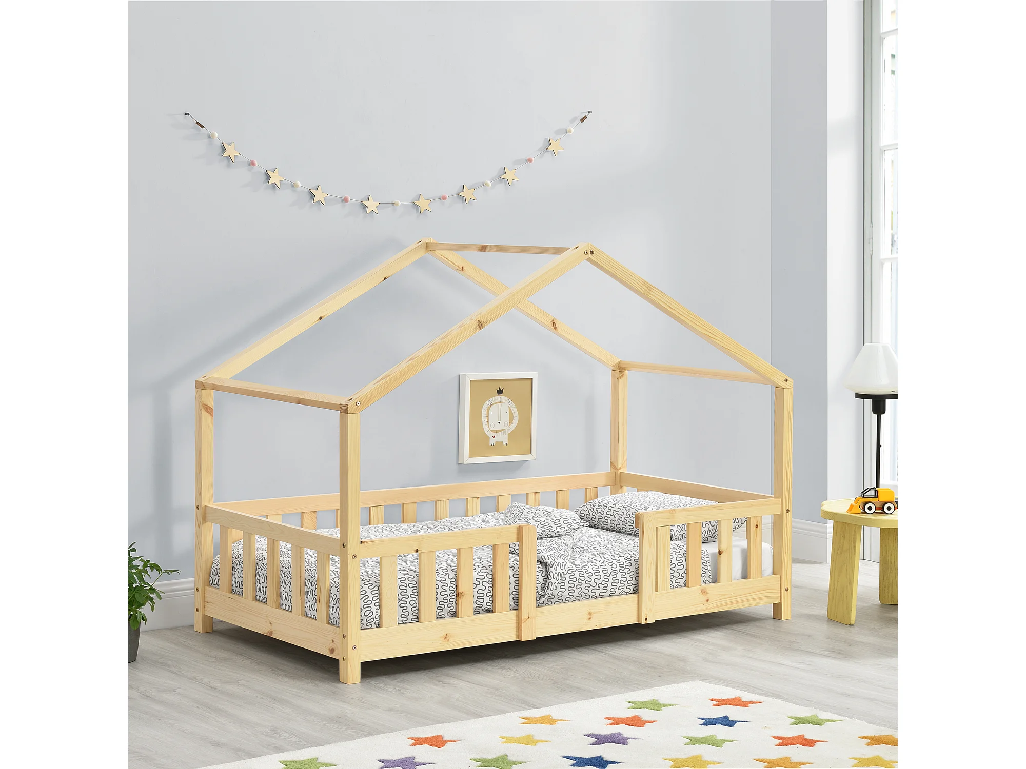 Lit d'Enfant Forme Maison avec Grille de Protection Treviolo 160 x 80 cm Bois Naturel [en.casa]