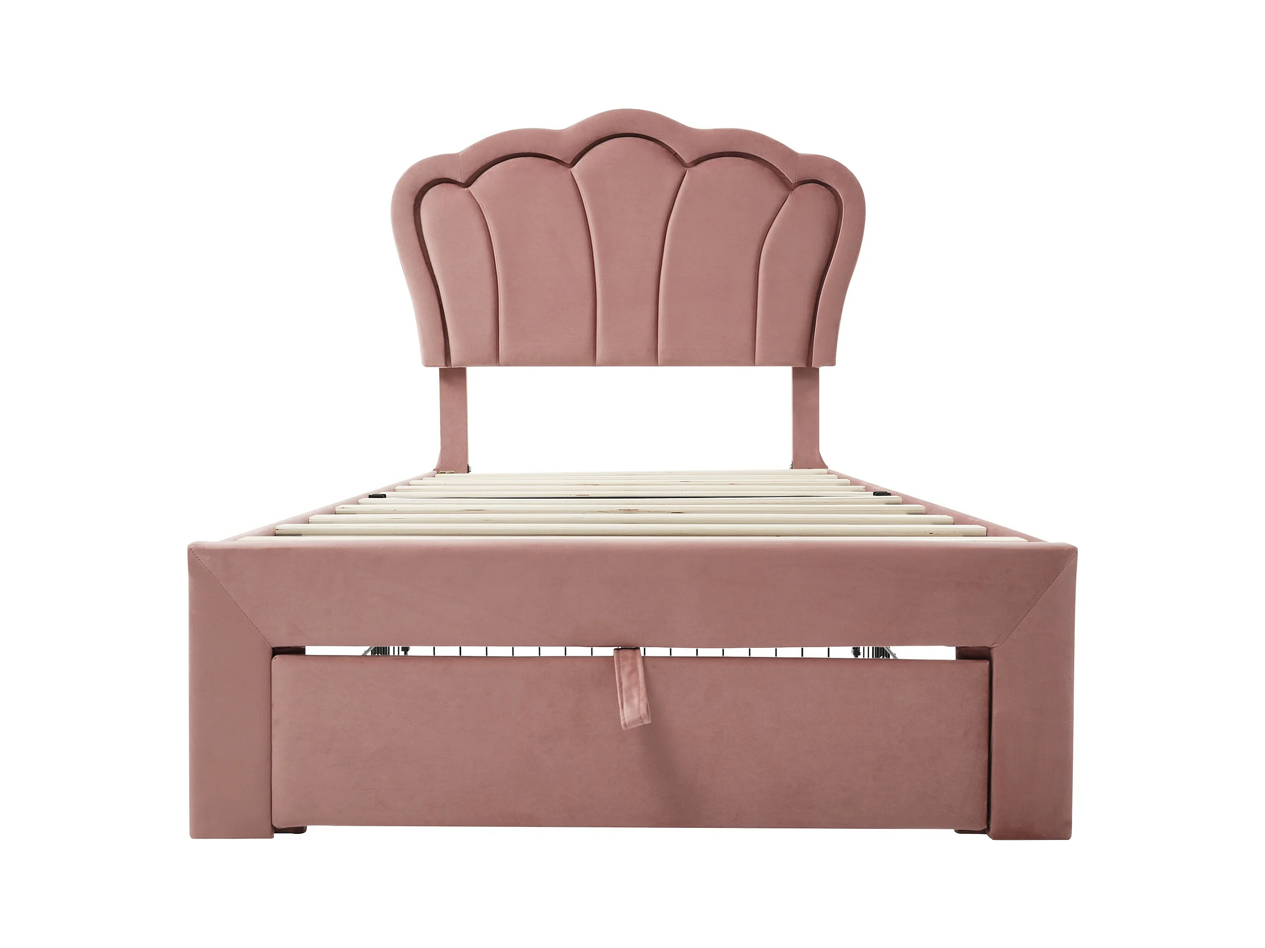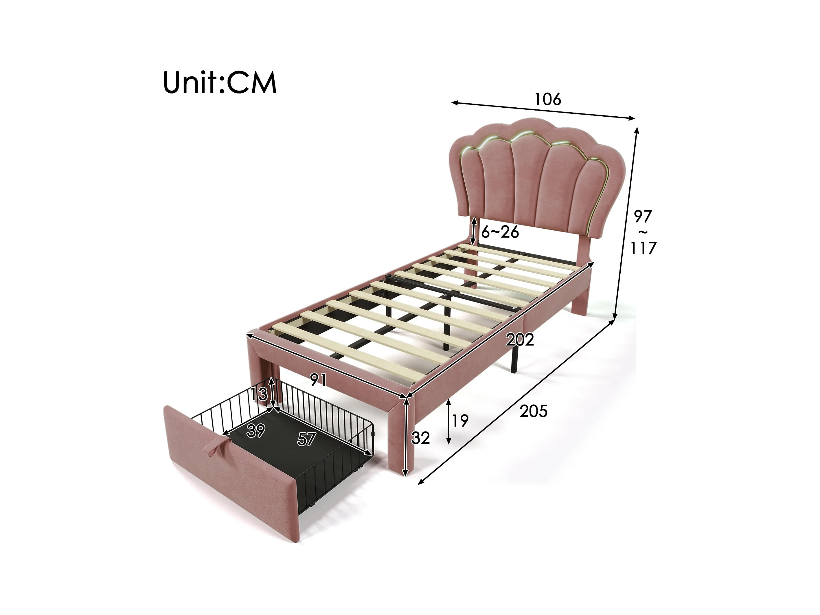 Lit d'enfant LED Single 90 x 200 cm, lit rembourré avec tiroirs APP-Control LED, velours rose