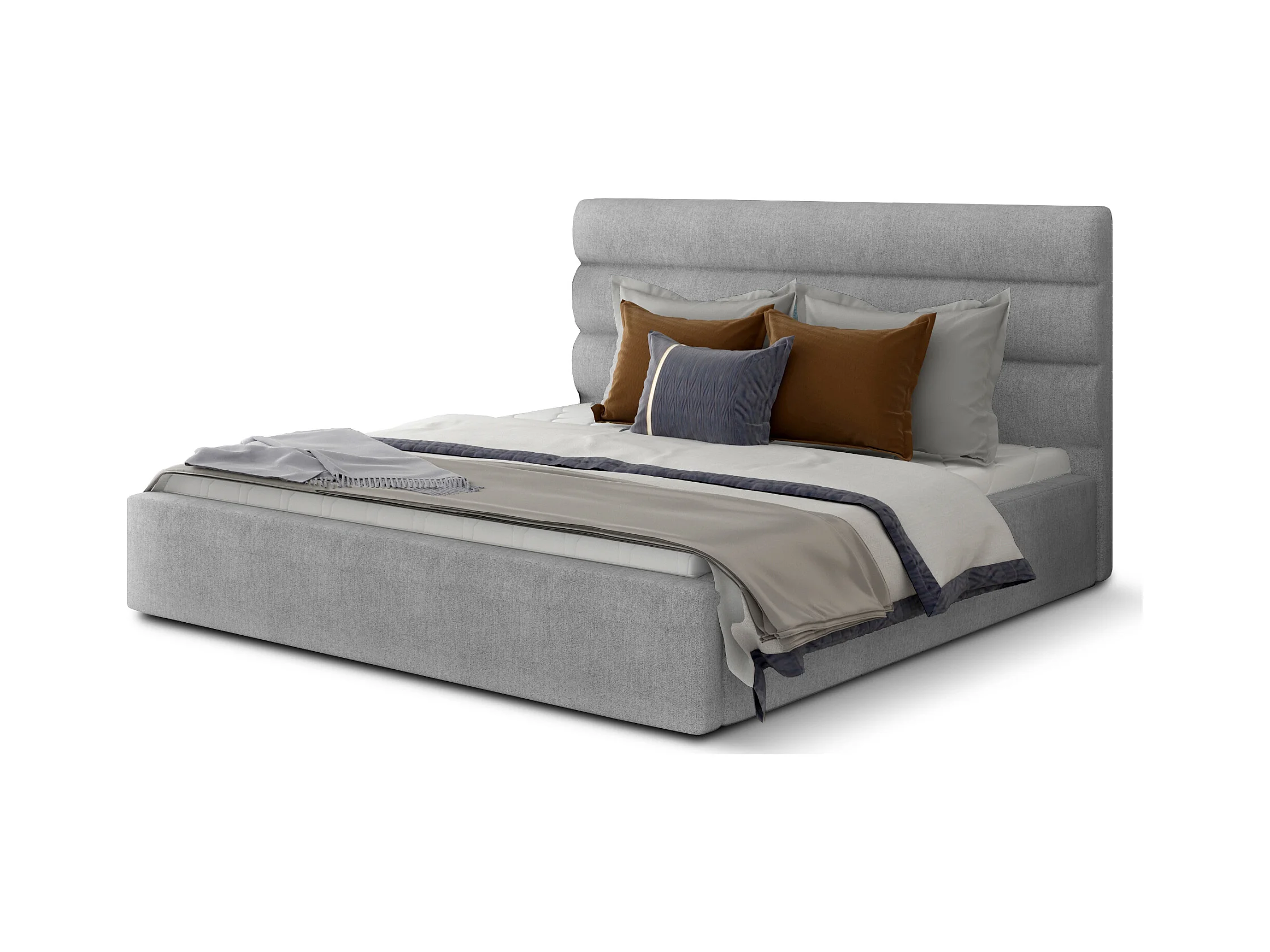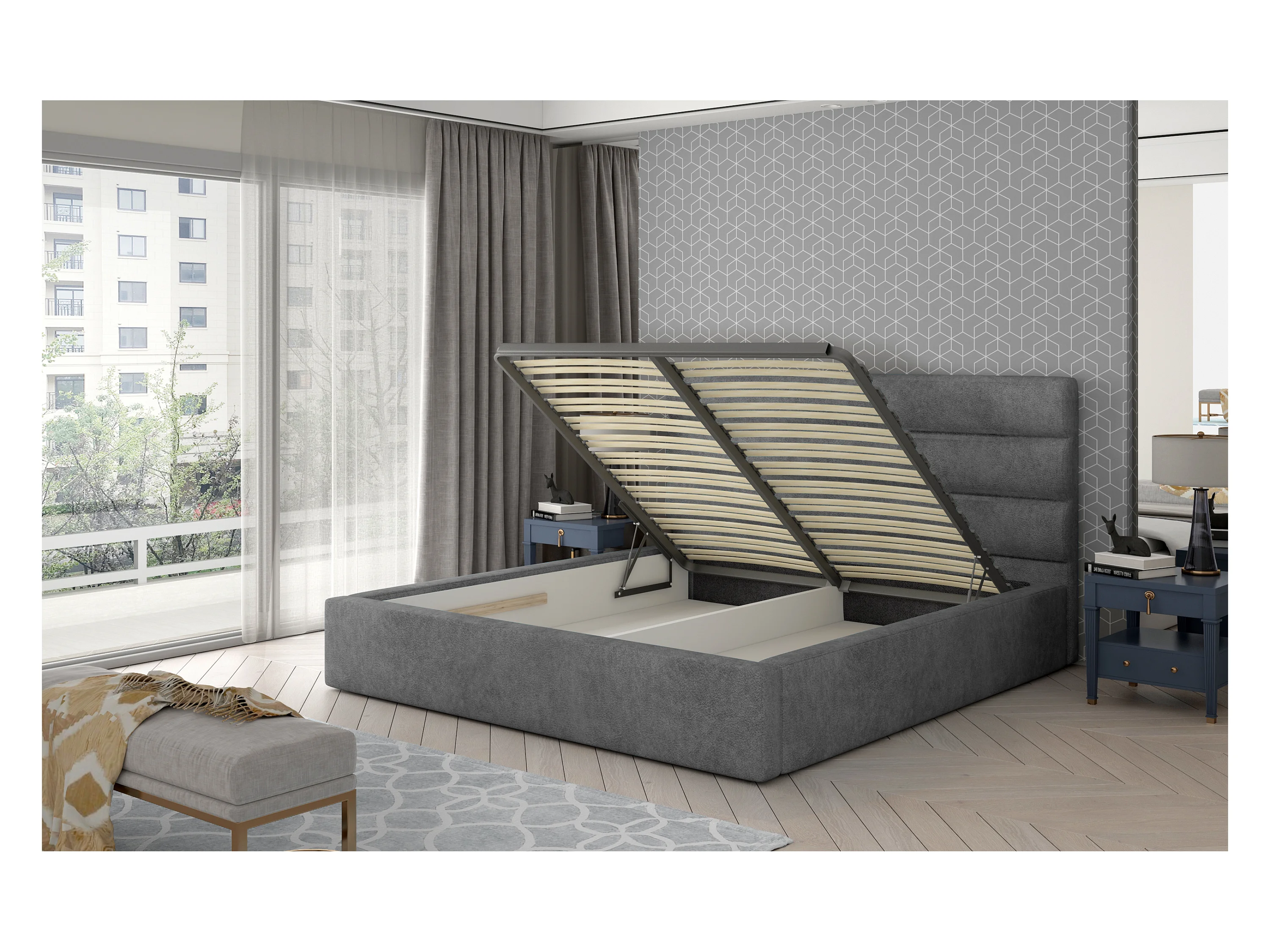 Lit design tissu gris clair avec coffre de rangement Klarina - 4 tailles-180x200