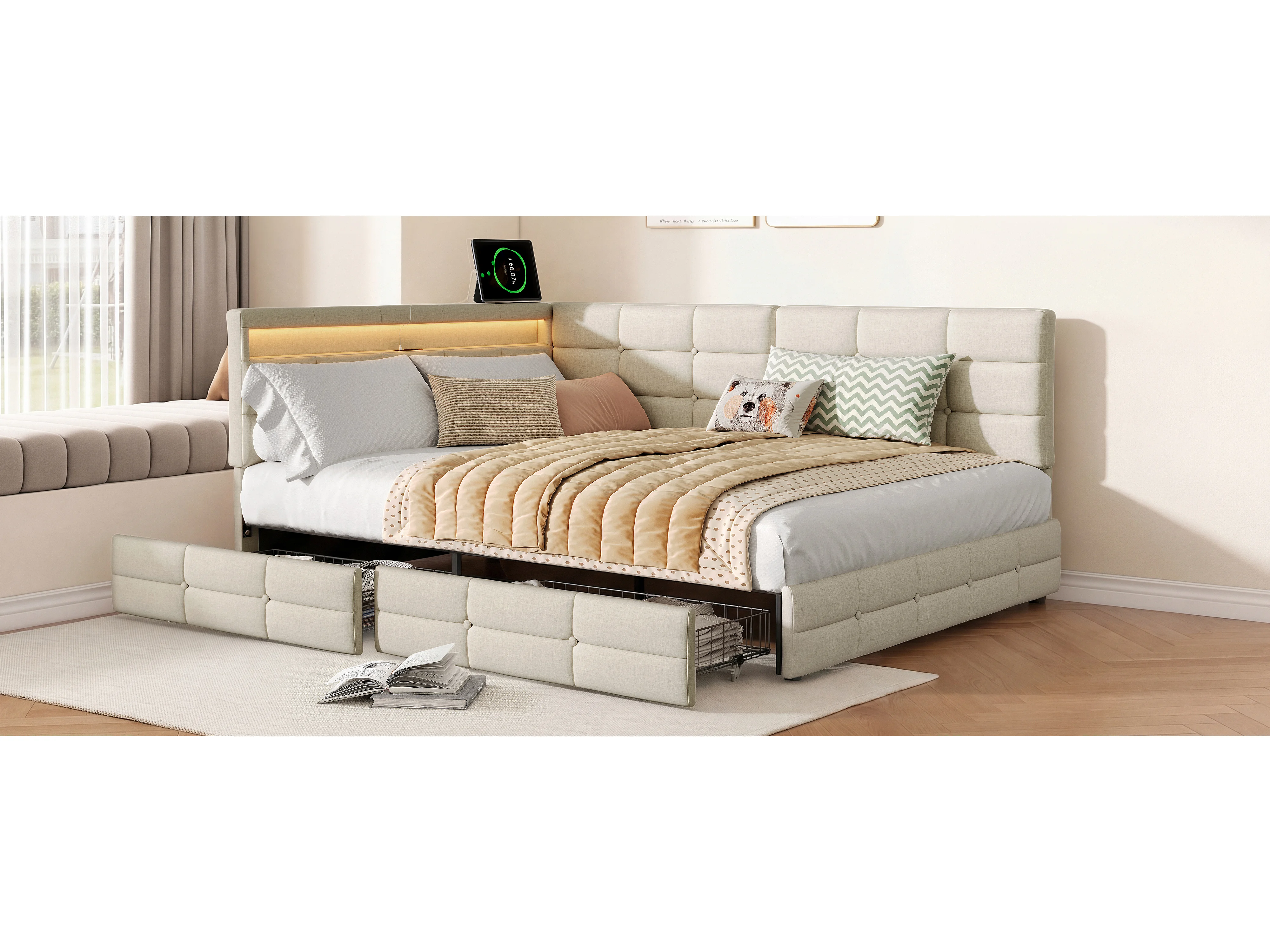 Lit double 140 x 190 cm avec éclairage LED et ports USB - 2 tiroirs - lin - beige