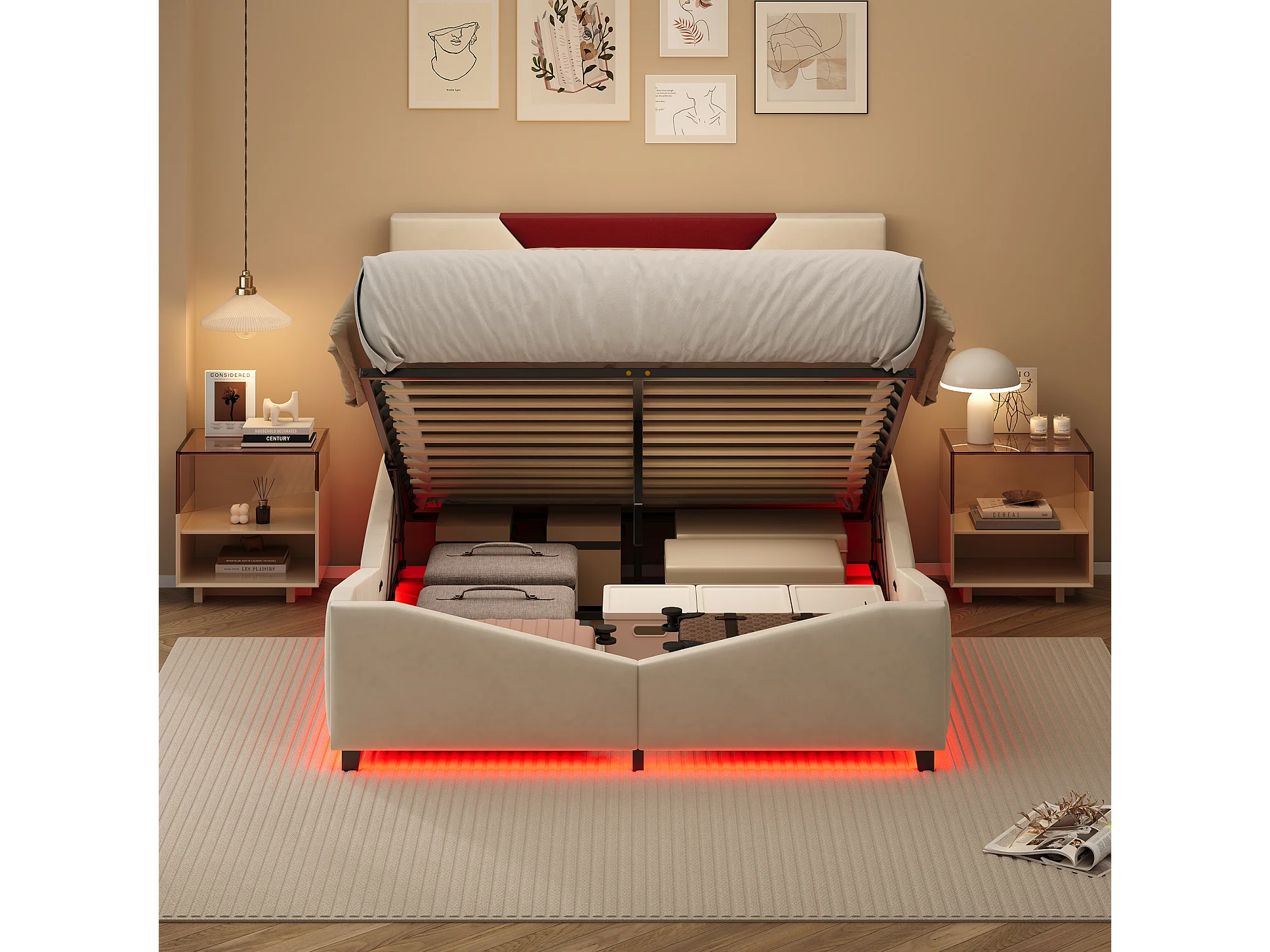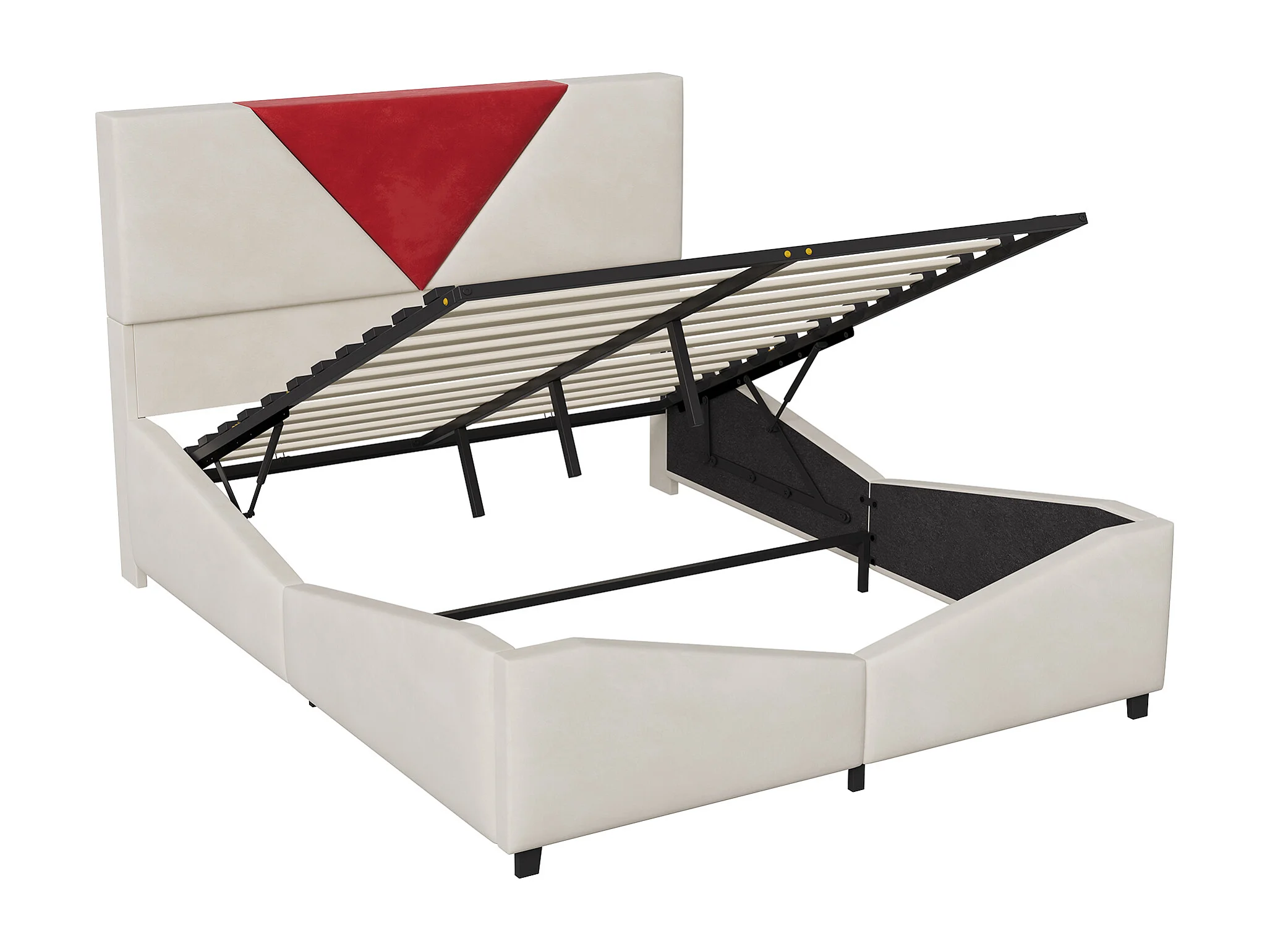 Lit double 140 x 190 cm avec rangement hydraulique et éclairage LED - tête de lit triangulaire contrastée - beige
