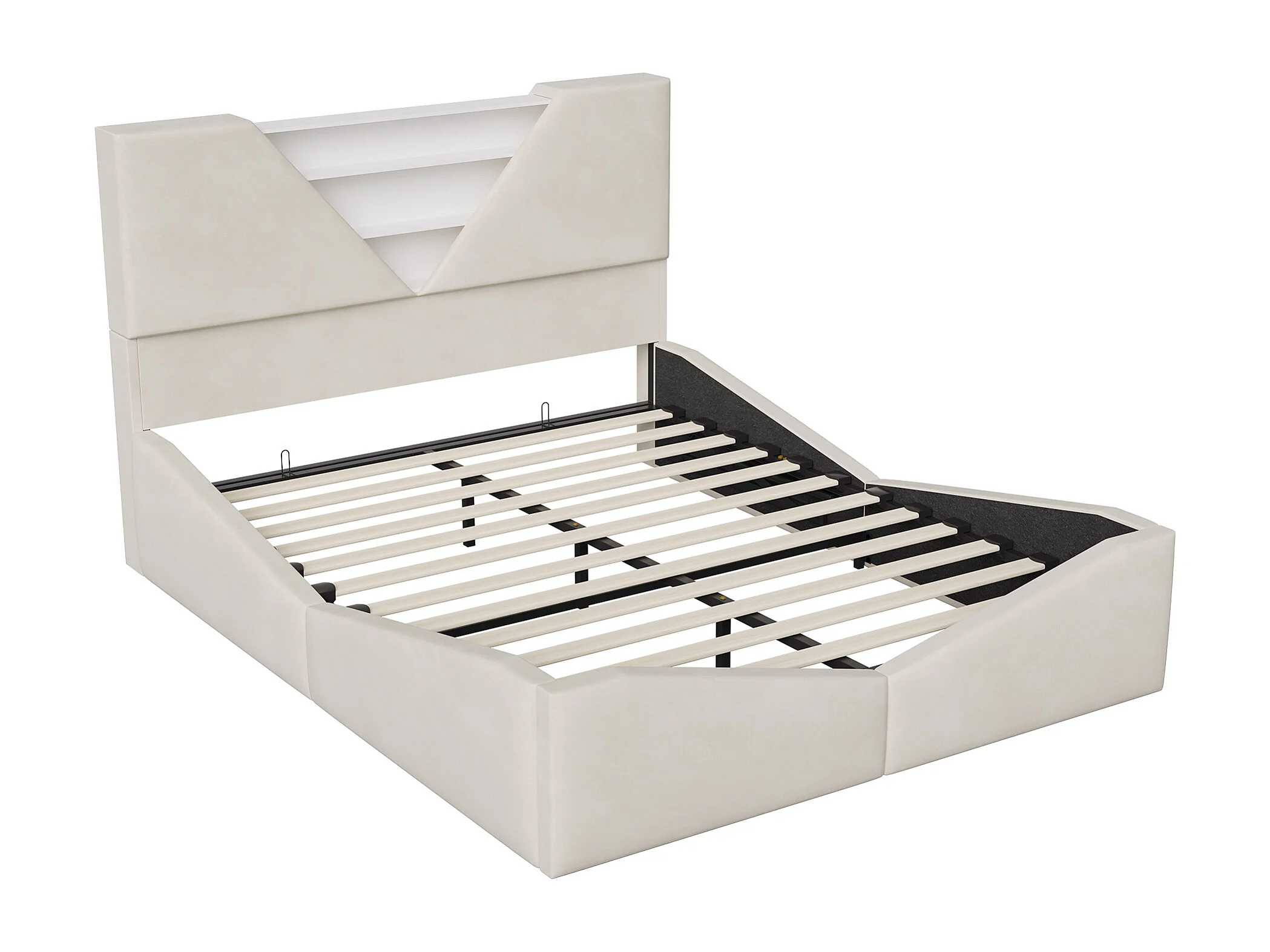 Lit double 140 x 190 cm avec rangement hydraulique - tête de lit triangulaire avec LED et fonction de chargement sans fil - beige