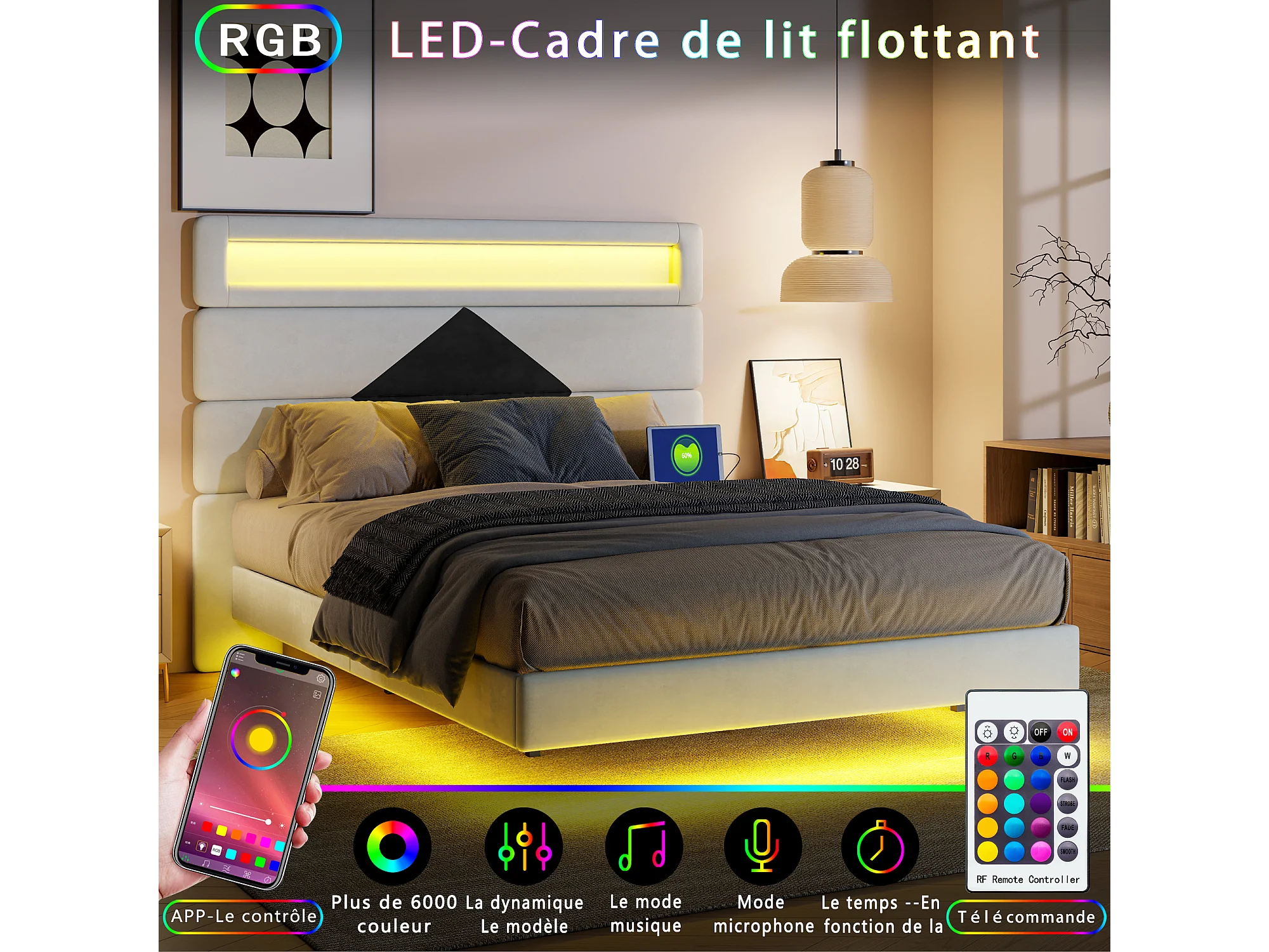 Lit double 140 x 190 cm - lit suspendu avec éclairage LED - tête de lit réglable et port USB - velours - blanc